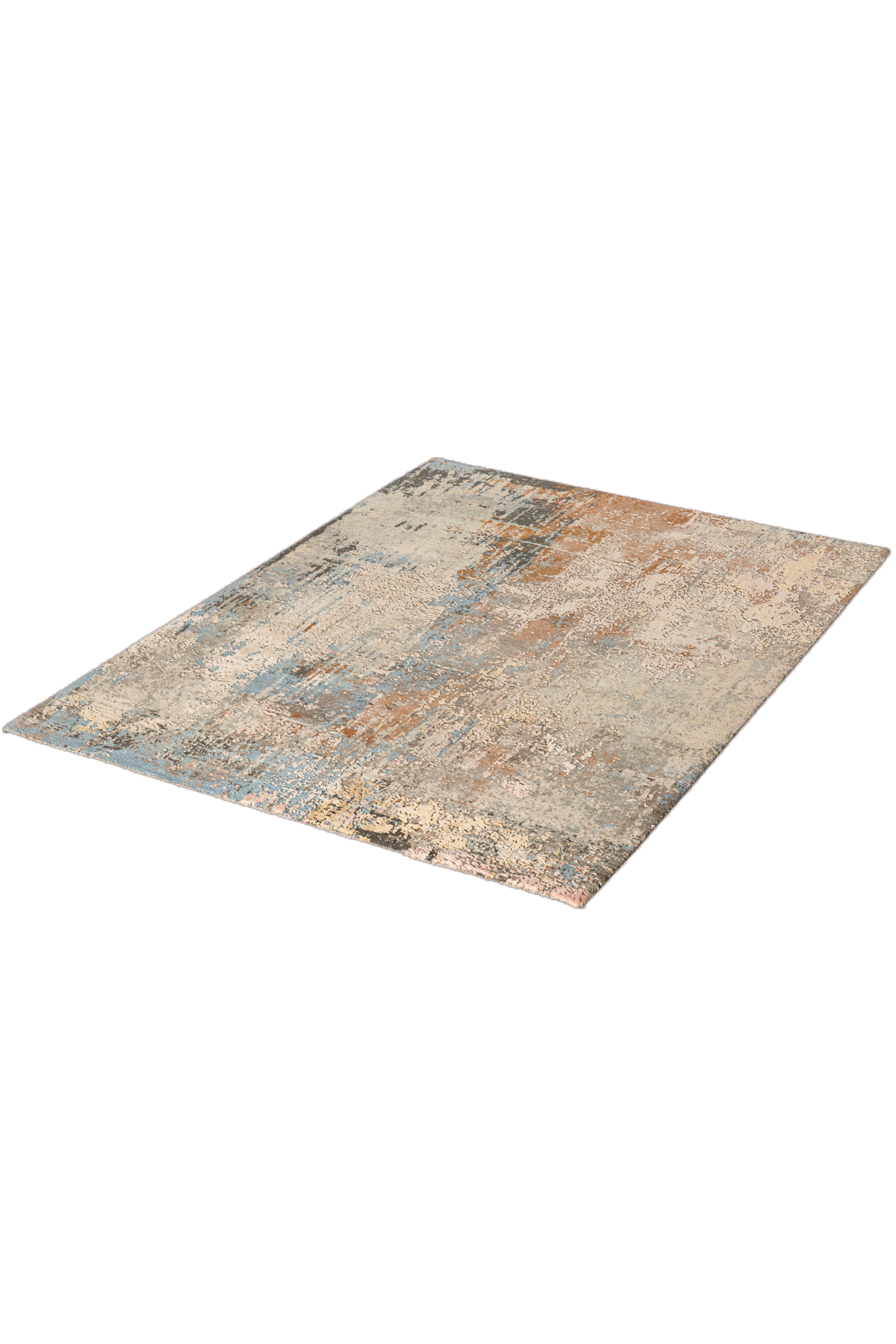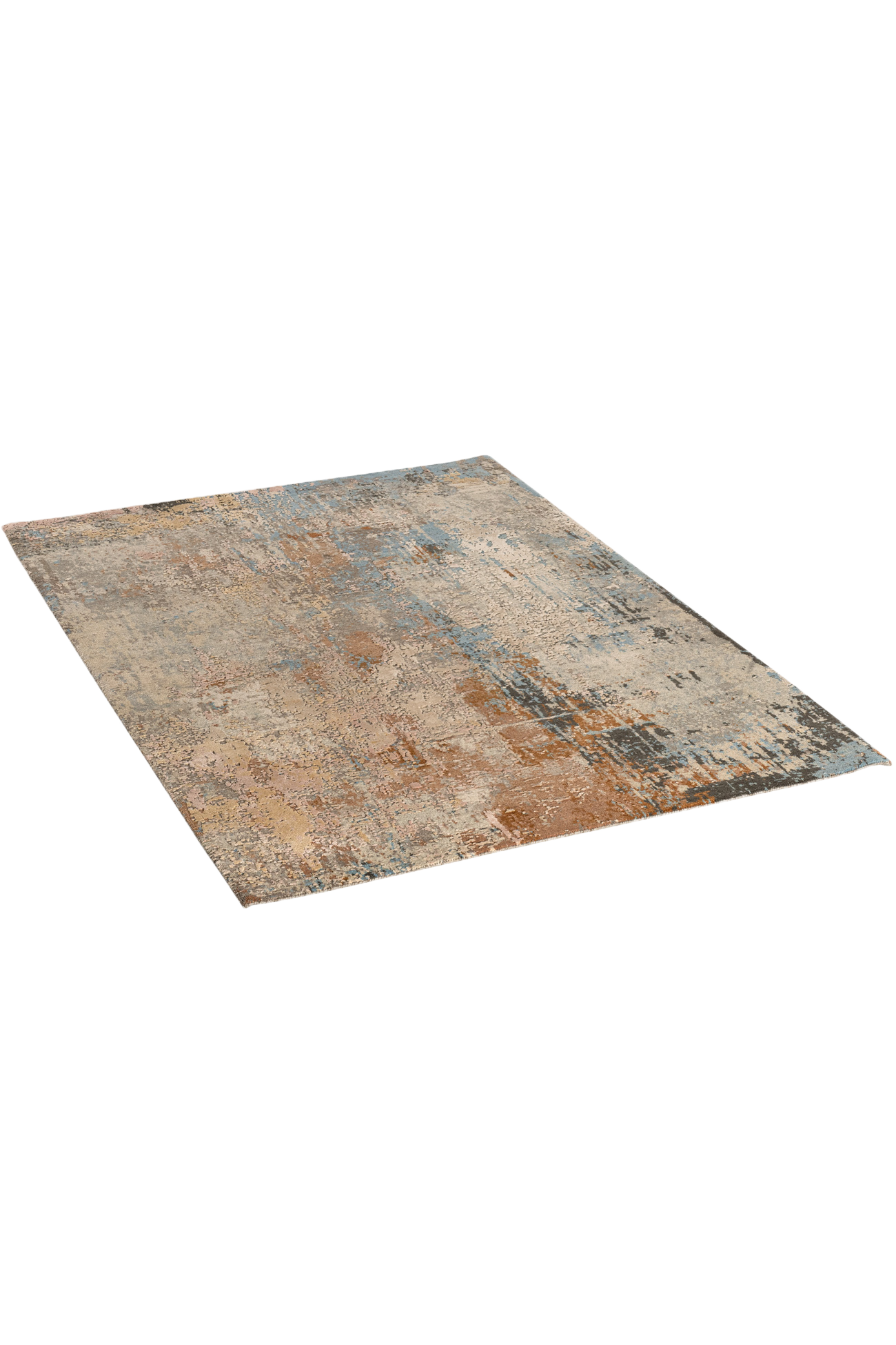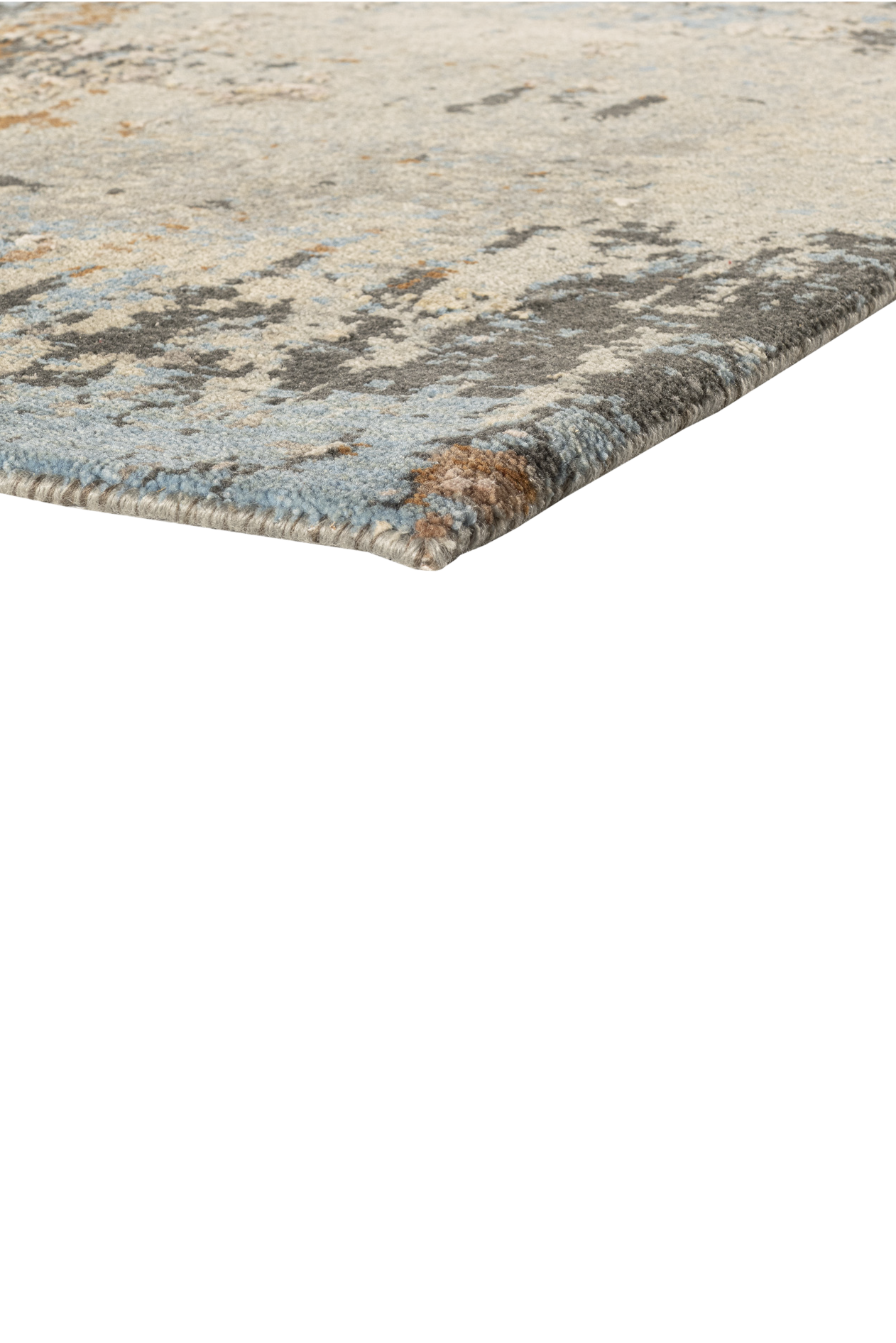Dieser besondere Design-Teppich aus unserer exklusiven Jordan Collection besteht aus bester, von Hand versponnener Naturseide und hochwertiger, handversponnener Hochlandwolle. Die Farben grau, blau und rost verbinden sich im Teppich wie die Farben eines gemalten Bildes. In reiner Handarbeit wurde der Teppich von talentierten Knüpfern Knoten für Knoten sehr fein von Hand geknüpft und mit einer Schere von Hand konturgeschnitten. Das Teppich-Unikat ist aufgrund der hochwertigen Materialien strapazierfähig und optisch ein wahres Highlight am Boden. Besonders in modernen Räumen wirkt der Teppich sehr elegant.