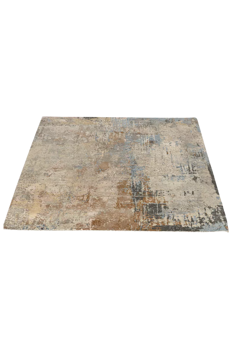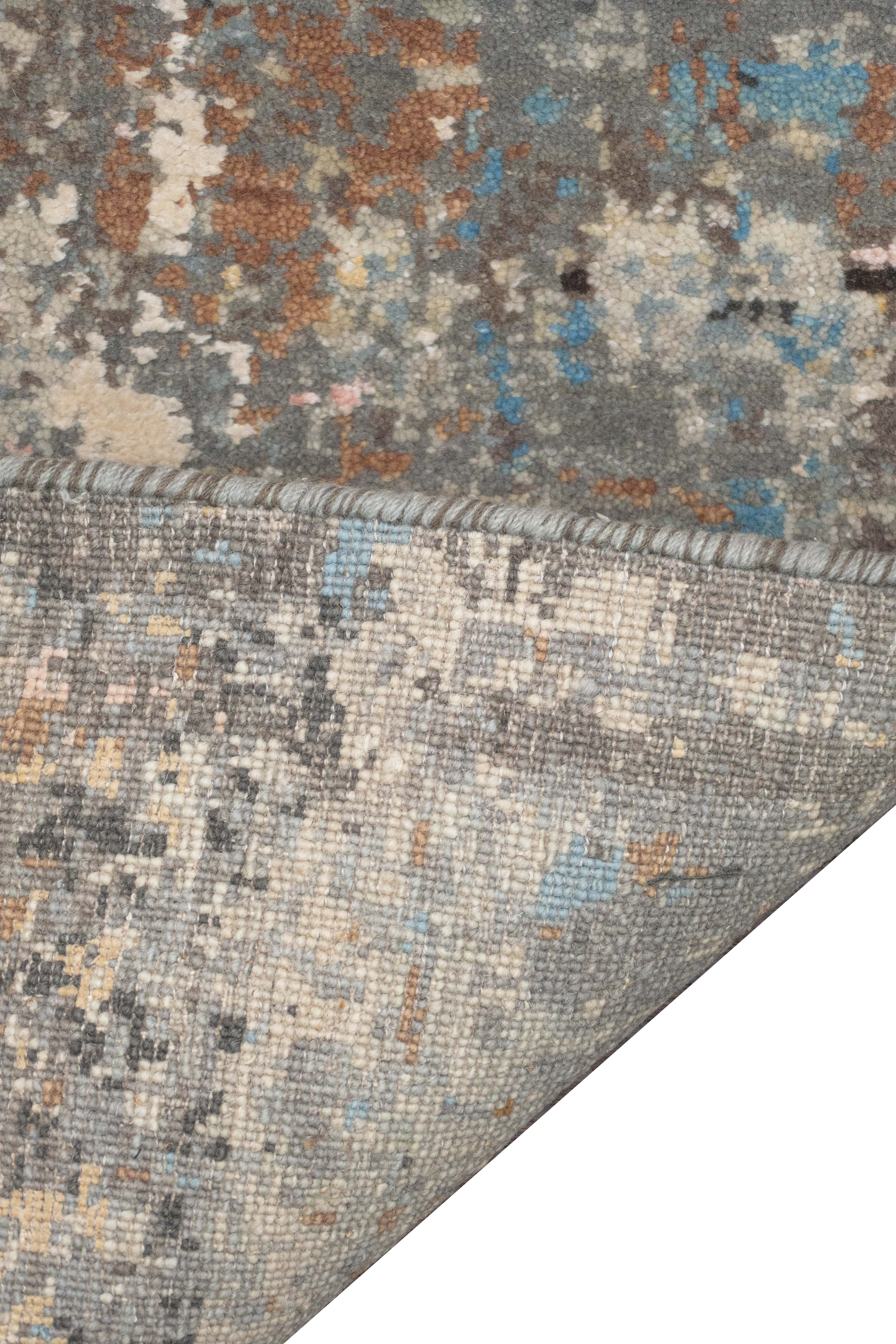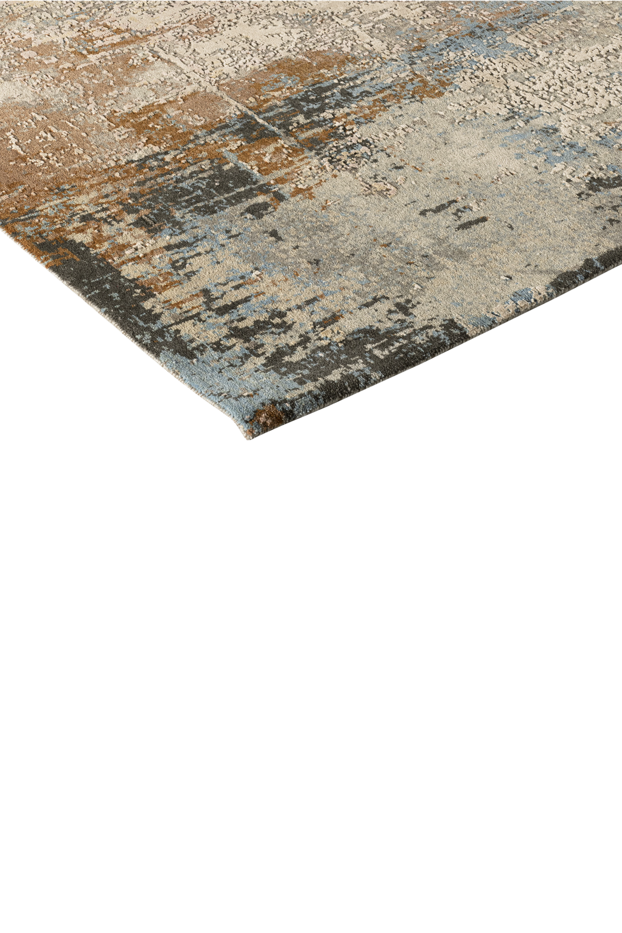 Dieser besondere Design-Teppich aus unserer exklusiven Jordan Collection besteht aus bester, von Hand versponnener Naturseide und hochwertiger, handversponnener Hochlandwolle. Die Farben grau, blau und rost verbinden sich im Teppich wie die Farben eines gemalten Bildes. In reiner Handarbeit wurde der Teppich von talentierten Knüpfern Knoten für Knoten sehr fein von Hand geknüpft und mit einer Schere von Hand konturgeschnitten. Das Teppich-Unikat ist aufgrund der hochwertigen Materialien strapazierfähig und optisch ein wahres Highlight am Boden. Besonders in modernen Räumen wirkt der Teppich sehr elegant.