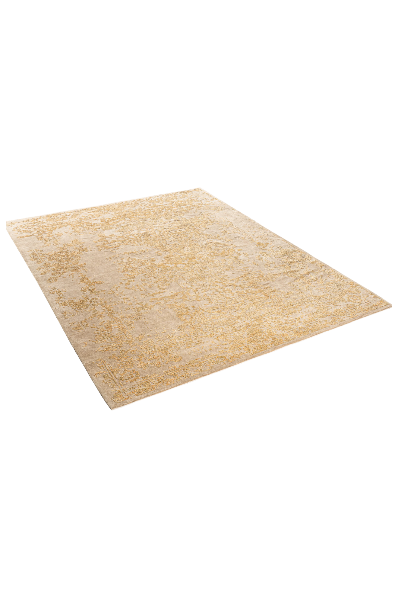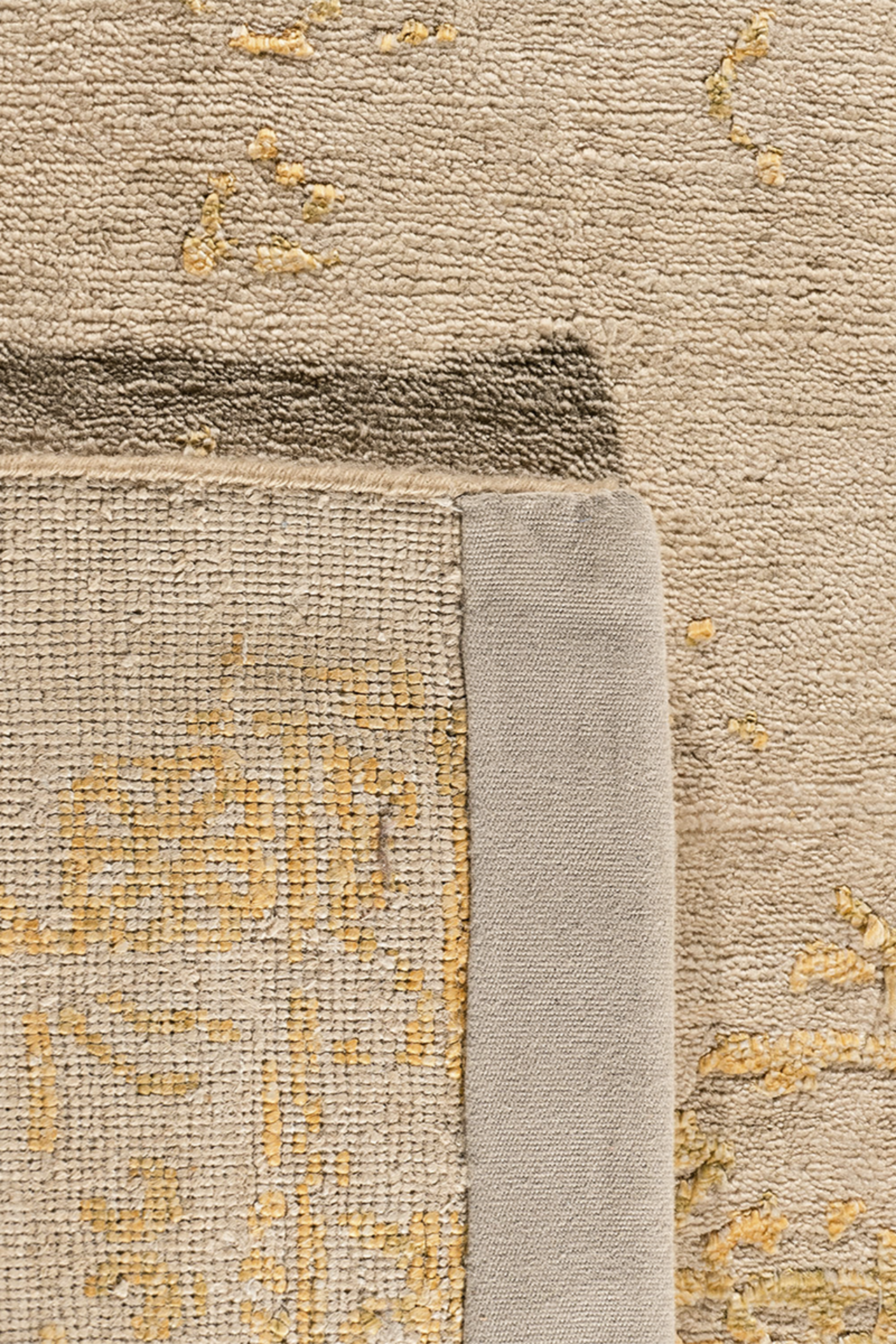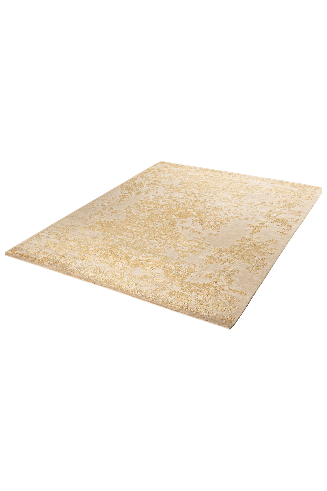 Dieser moderne, handgeknüpfte Teppich überzeugt mit seiner sehr feinen, eleganten Zeichnung. Der Hintergrund des Teppichs ist aus strapazierfähiger, von Hand versponnener Hochlandwolle, die golfarbenen Partien sind aus bester, handversponnener Pflanzenseide geknüpft. Die hochwertigen Materialien und die kontrollierten Farben sorgen für Qualität und Strapazierfähigkeit des Teppichs. Wir empfehlen unter unsere handgeknüpften Teppiche eine Unterlage zu legen. Diese sind für sämtliche Böden und Fußbodenheizung verwendbar.
