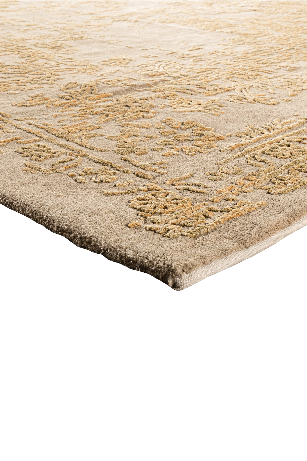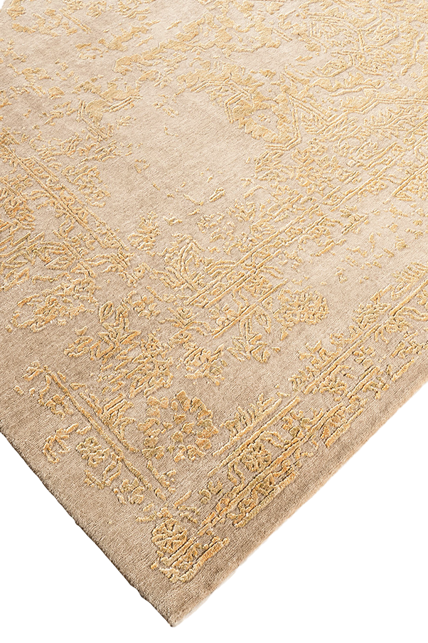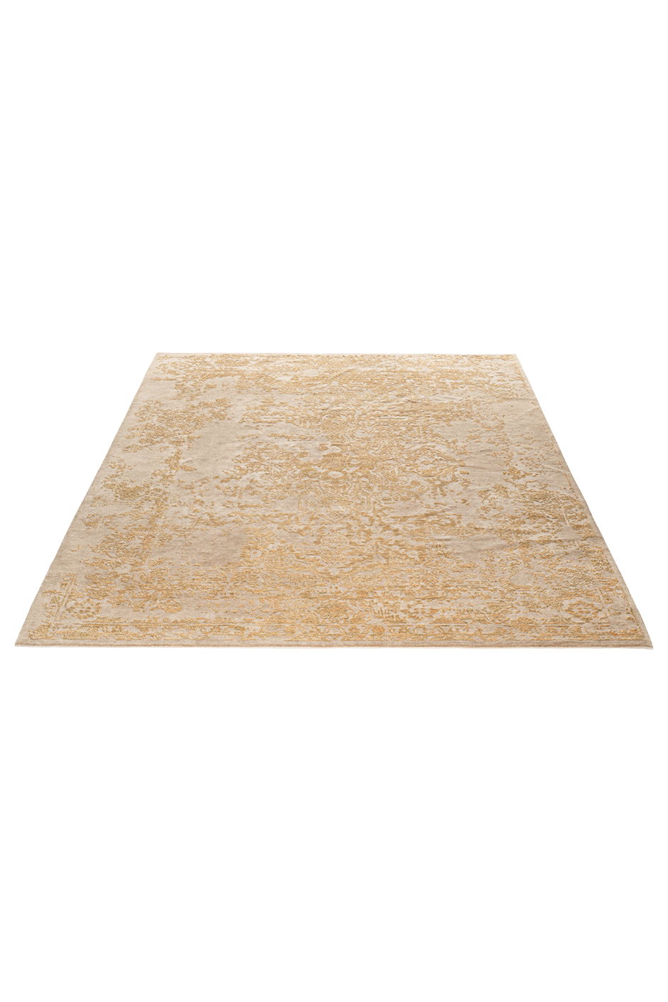 Dieser moderne, handgeknüpfte Teppich überzeugt mit seiner sehr feinen, eleganten Zeichnung. Der Hintergrund des Teppichs ist aus strapazierfähiger, von Hand versponnener Hochlandwolle, die golfarbenen Partien sind aus bester, handversponnener Pflanzenseide geknüpft. Die hochwertigen Materialien und die kontrollierten Farben sorgen für Qualität und Strapazierfähigkeit des Teppichs. Wir empfehlen unter unsere handgeknüpften Teppiche eine Unterlage zu legen. Diese sind für sämtliche Böden und Fußbodenheizung verwendbar.