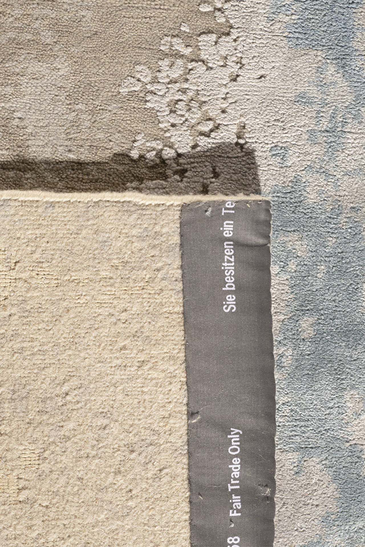 Dieser moderne, handgeknüpfte Teppich ist ein abstraktes Teppichkunstwerk am Boden. Der Hintergrund des Teppichs ist aus strapazierfähiger, von Hand versponnener Hochlandwolle, die farbigen Partien sind aus bester, handversponnener Naturseide geknüpft. Die hochwertigen Materialien und die kontrollierten Farben sorgen für Qualität und Strapazierfähigkeit des Teppichs. Wir empfehlen unter unsere handgeknüpften Teppiche eine Unterlage zu legen. Diese sind für sämtliche Böden und Fußbodenheizung verwendbar.