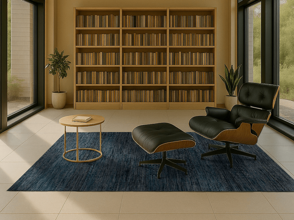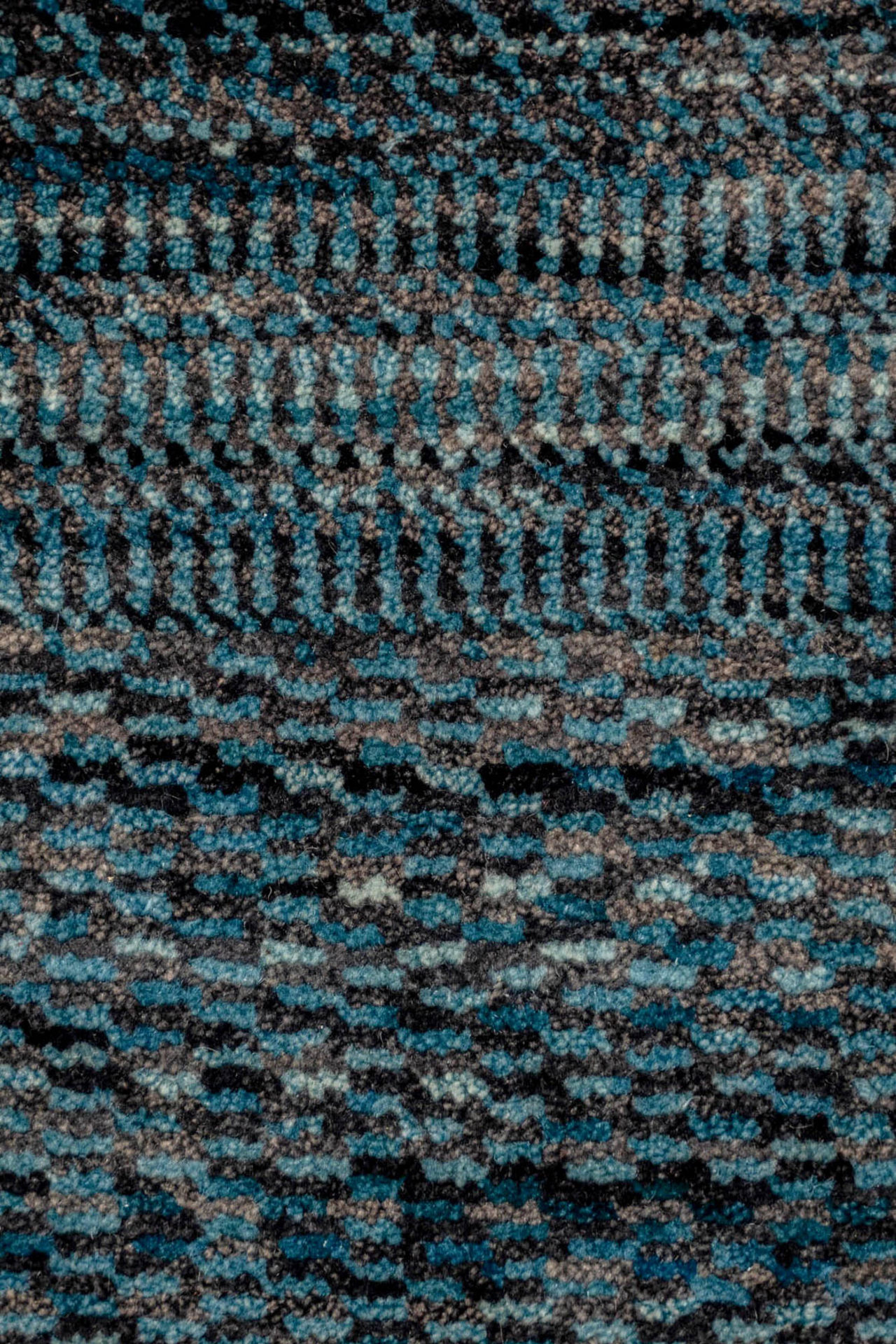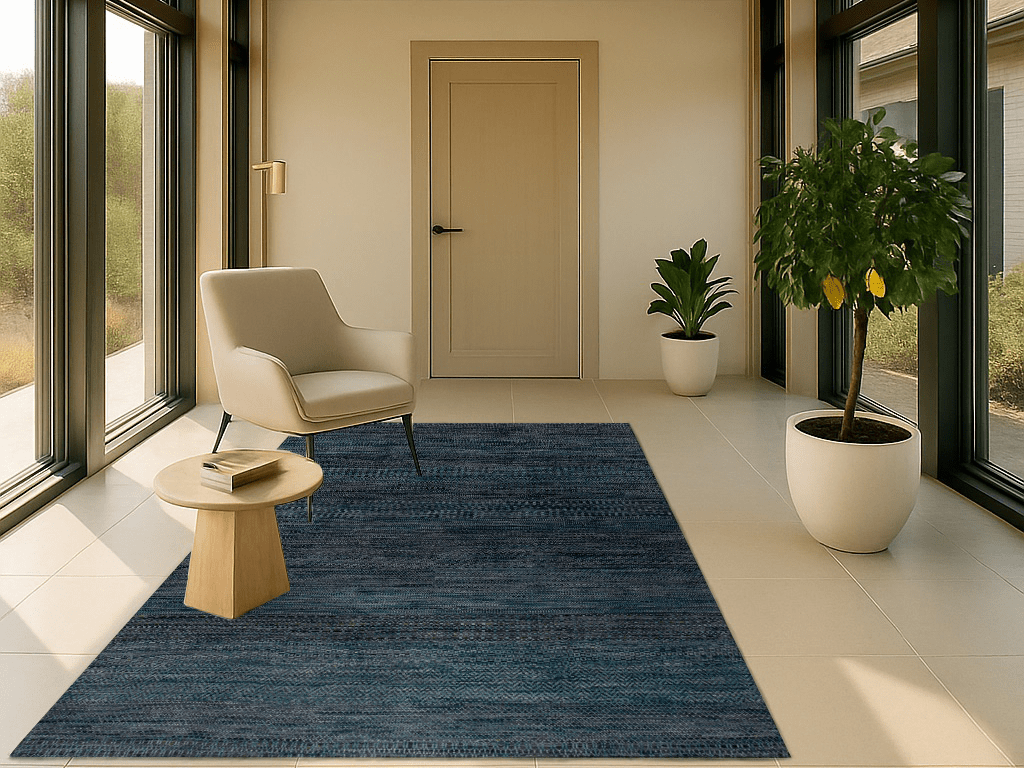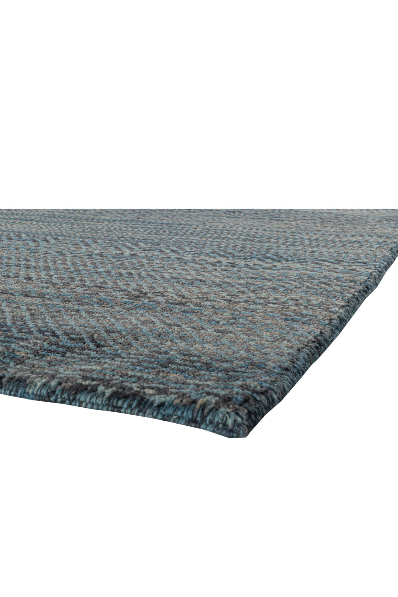 Sanjana ist ein handgeknüpfter Teppich aus reiner Schurwolle – Teil der Jordan Collection. In tiefem Blau, Petrol und Schwarzgrau entfaltet sich ein feines, horizontal gegliedertes Muster, das an gewebte Landschaften oder ruhige Wasseroberflächen erinnert. Die natürlichen Farbschattierungen bringen Tiefe und Bewegung in die Fläche, während die reine Wollstruktur für eine angenehme, matte Haptik sorgt. Sanjana steht für Textil gewordene Gelassenheit – kraftvoll, ruhig, geerdet. Ein Teppich, der wirkt – nicht laut, sondern mit stillem Charakter.