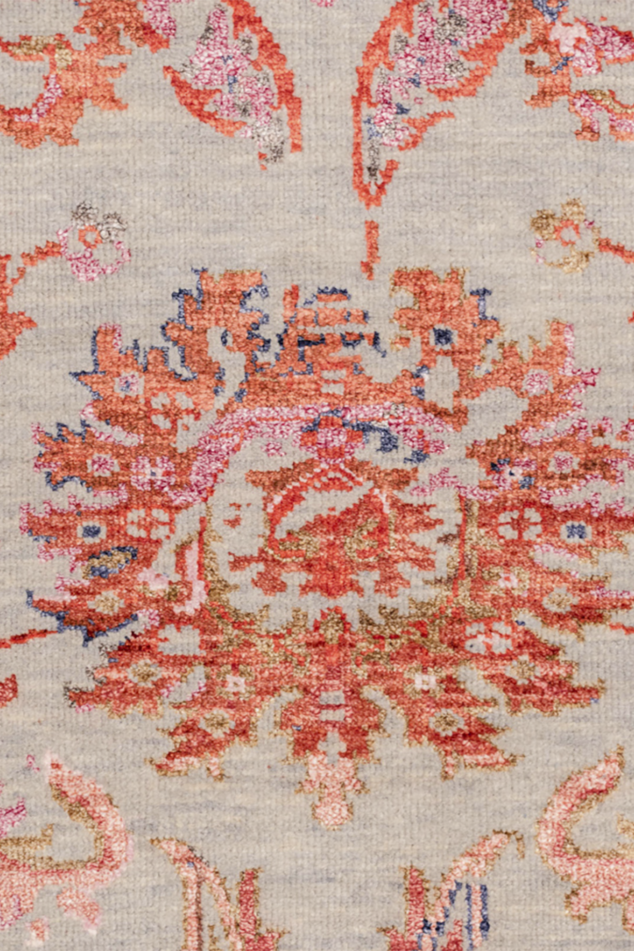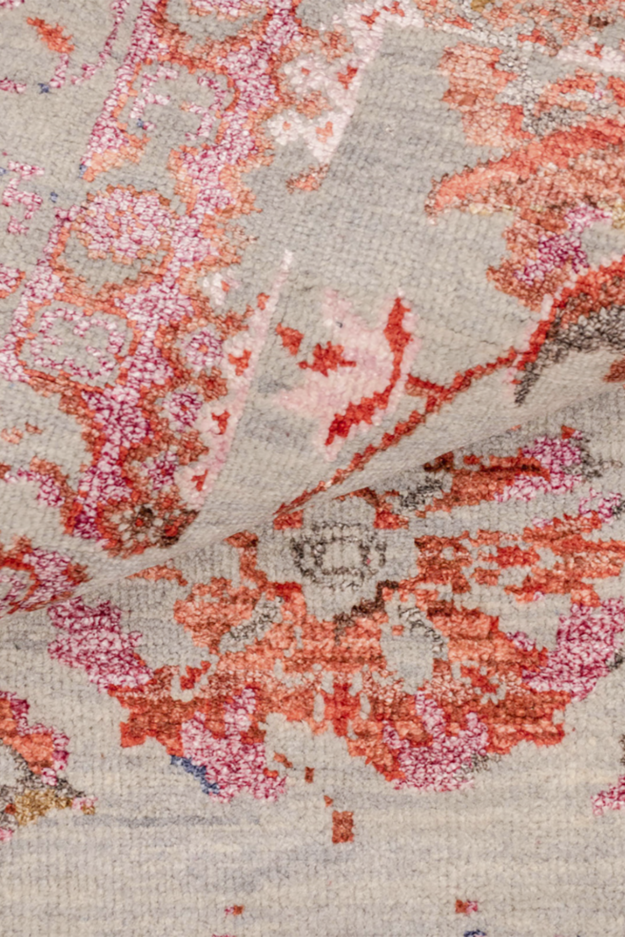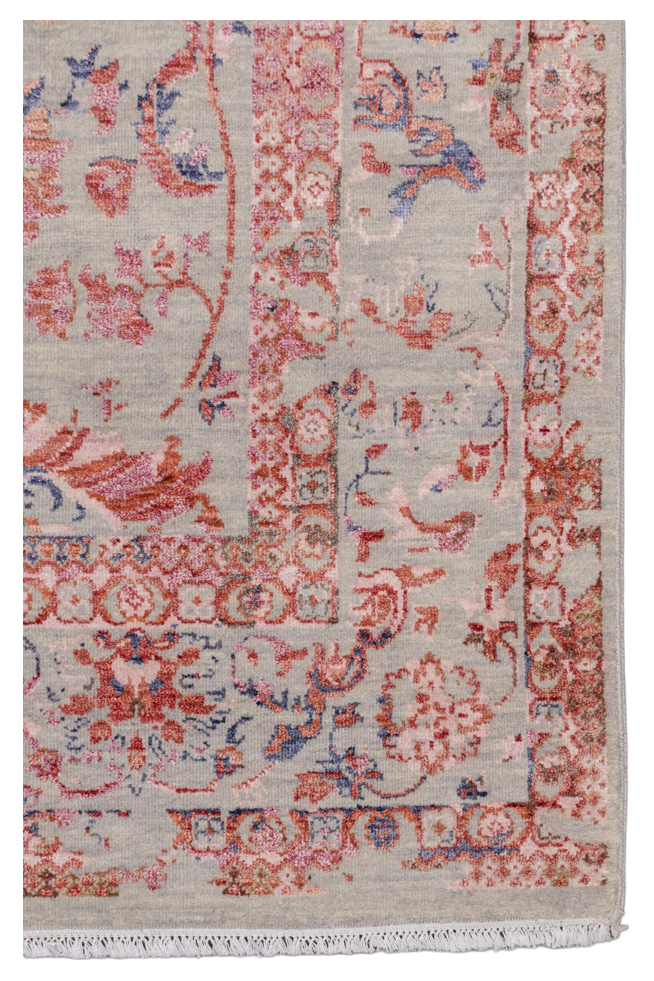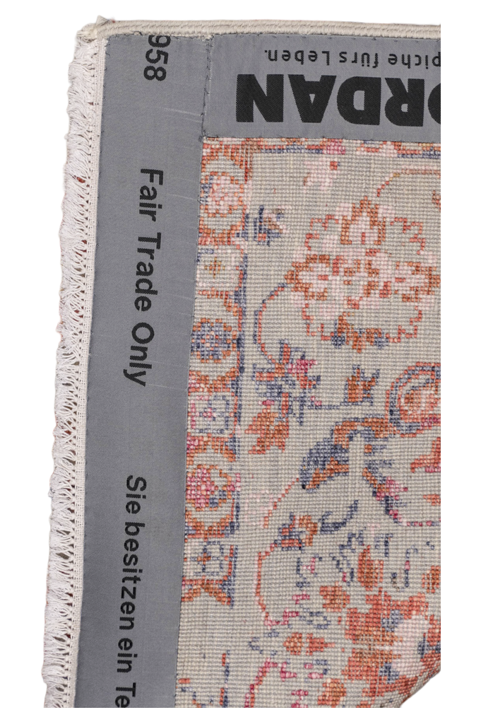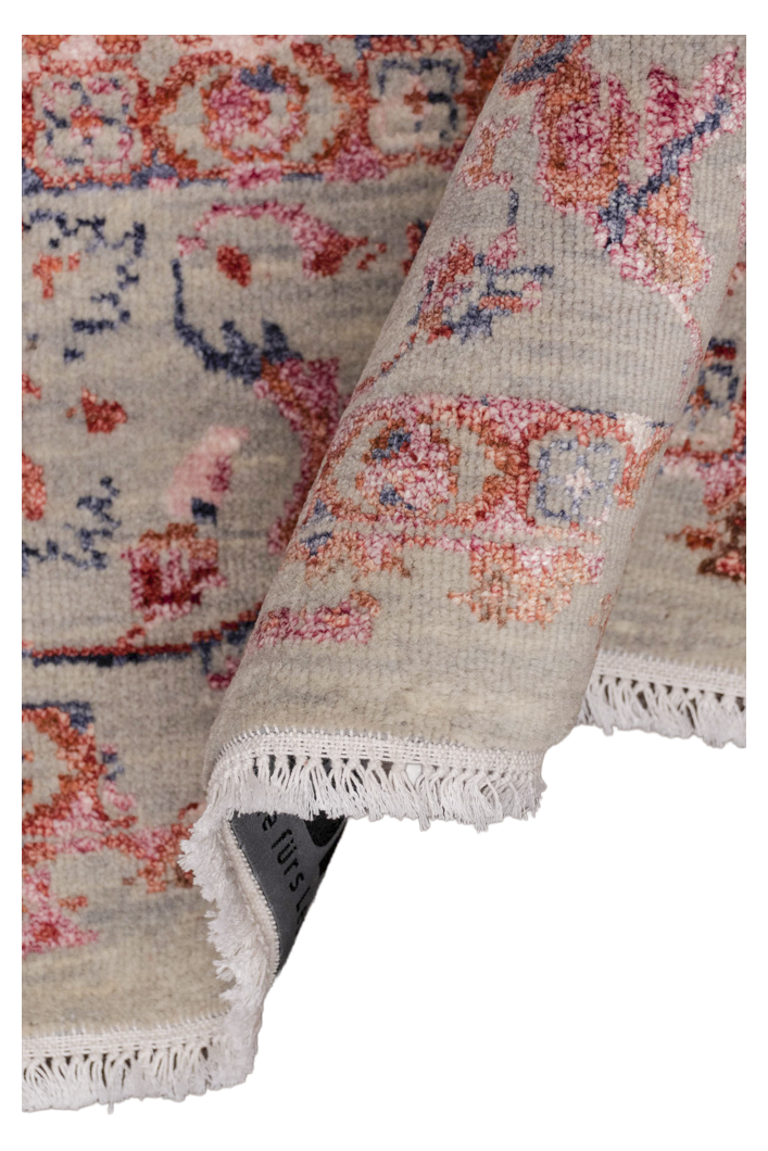 Ein bezaubernder, handgeknüpfter Design-Teppich aus der Jordan Collection. Den Teppich aus handversponnener Hochlandwolle in grau-beige zieren wunderschöne, orientalisch wirkenden Blumenmuster, aus bunter Bambusseide. Die Seide verleiht dem Teppich eine moderne Vintage Optik und sie strahlt je nach Lichteinfall in orange bis pink. Mit diesem modernen Teppich setzten Sie ein Statement und geben Ihrem Wohnkonzept einen tollen Charakter. In liebevoller Handarbeit wurde der Teppich Knoten für Knoten geknüpft und bekam so seinen ganz eigenen Charakter. Wir empfehlen Ihnen auf glatten Böden die Verwendung einer rutschfesten Teppichunterlage.