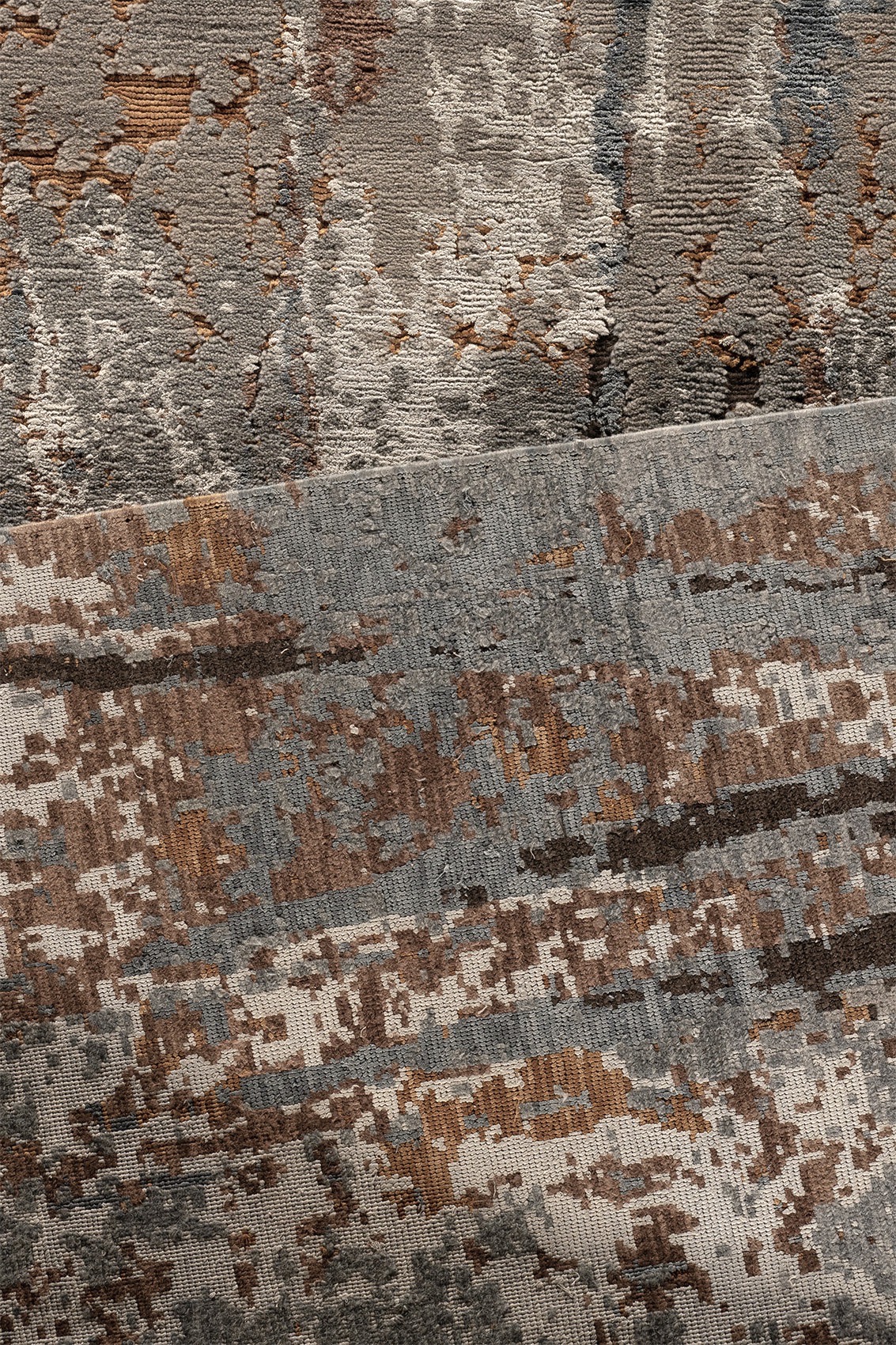 Abstraktes Design, fein illustriert aus handkardierter, handgesponnener Himalaya-Wolle, Leinen und Naturseide. Die Kombination aus feinsten Materialien macht den Designer Teppich Luminance zu einem echten Teppichkunstwerk. Der Teppich zeigt eine kunstvoll, neu interpretierte Verwendung von Farbe und Textur, die an oxidiertes Metall erinnert. Der außergewöhnliche Teppich ist handgeknüpft, in verschiedenen Farben und Florhöhen, einfach ein beispielhaftes Werk zeitgenössischen Designs. Durch die Verwendung der hochwertigen Materialien ist der Teppich nicht nur optisch eine Augenweide, sondern auch qualitativ sehr robust und einfach in der Pflege.
