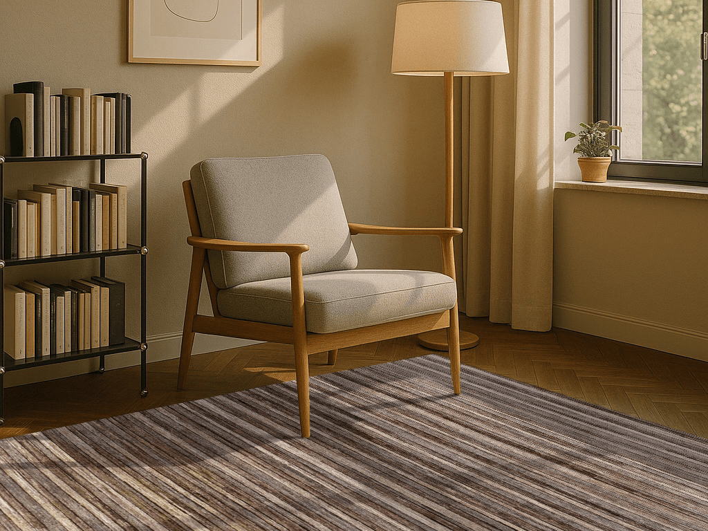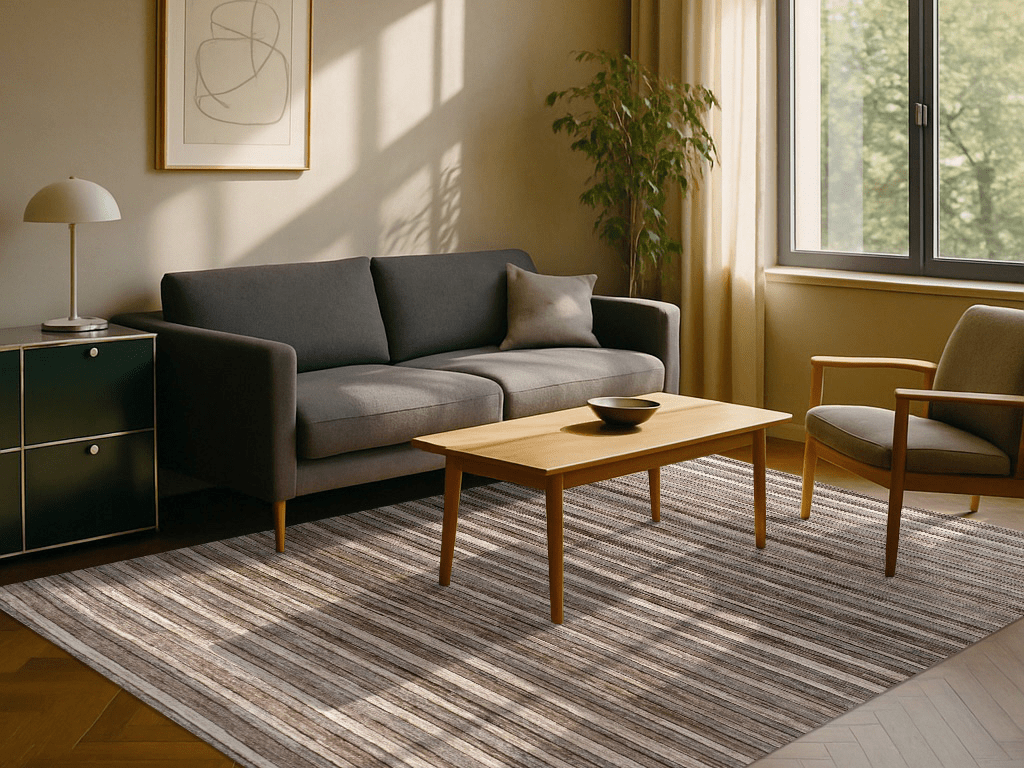 Der Teppich „Sandlinien“ überzeugt mit einem dezenten Streifendesign, das an die natürlichen Schichtungen von Sand, Stein und Erde erinnert. Die harmonische Farbpalette in warmen Beige-, Braun- und Grautönen fügt sich mühelos in moderne wie klassische Interieurs ein und schafft eine ruhige, stilvolle Atmosphäre.