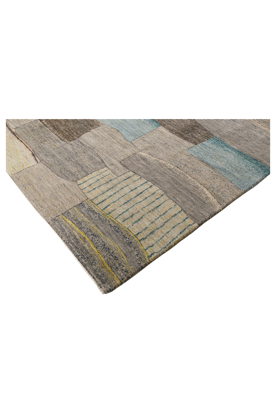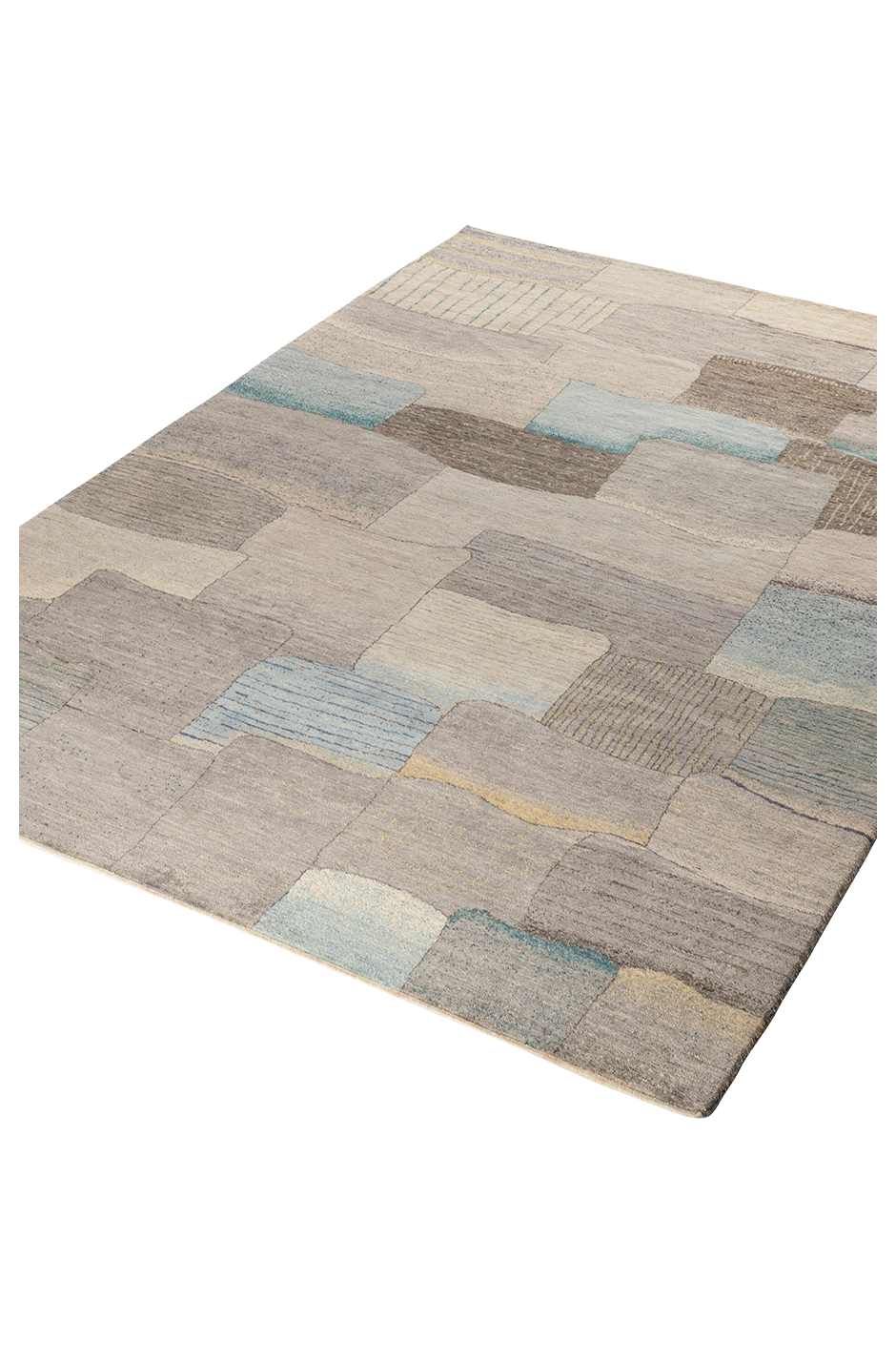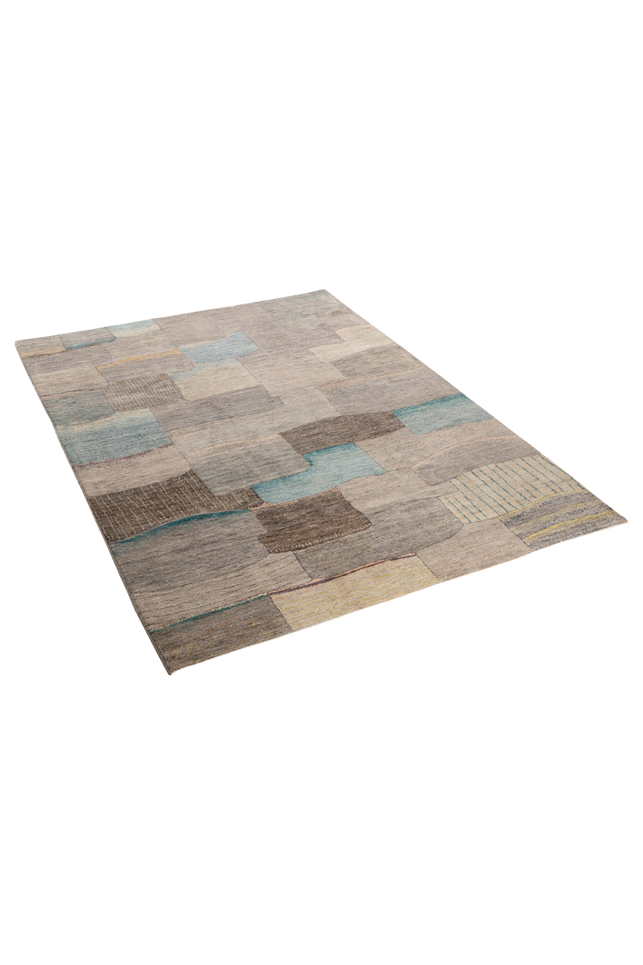 „Bachlauf“ ist ein Meisterstück reduzierter Textilkunst. In fließender Anordnung treffen handgeknüpfte Flächen in Grau-, Sand- und Aquatönen aufeinander – wie ein abstrahierter Flusslauf durch Stein und Erde. Die variierenden Strukturen und subtilen Linien erinnern an Wasser, das sich seinen Weg bahnt. Jeder Abschnitt wurde aus reiner Hochlandwolle gefertigt, pflanzlich gefärbt und meisterlich verarbeitet. Der Teppich wirkt beruhigend, grafisch und zugleich lebendig – ideal für moderne Interieurs mit Sinn für Materialität und Komposition.