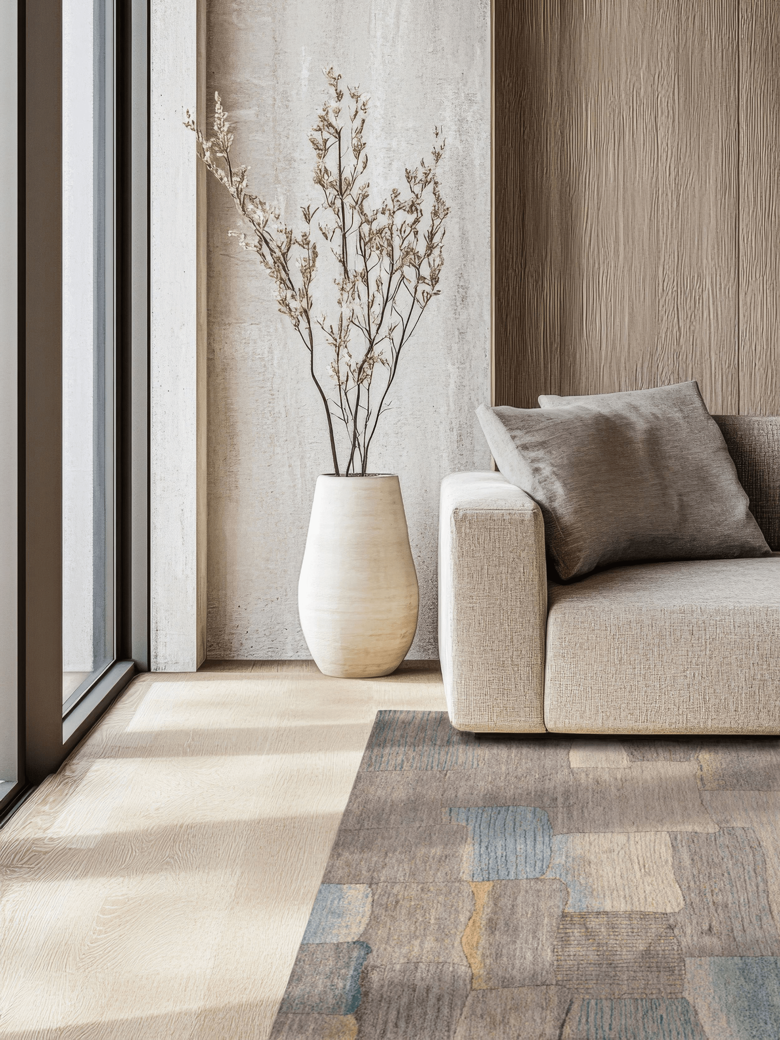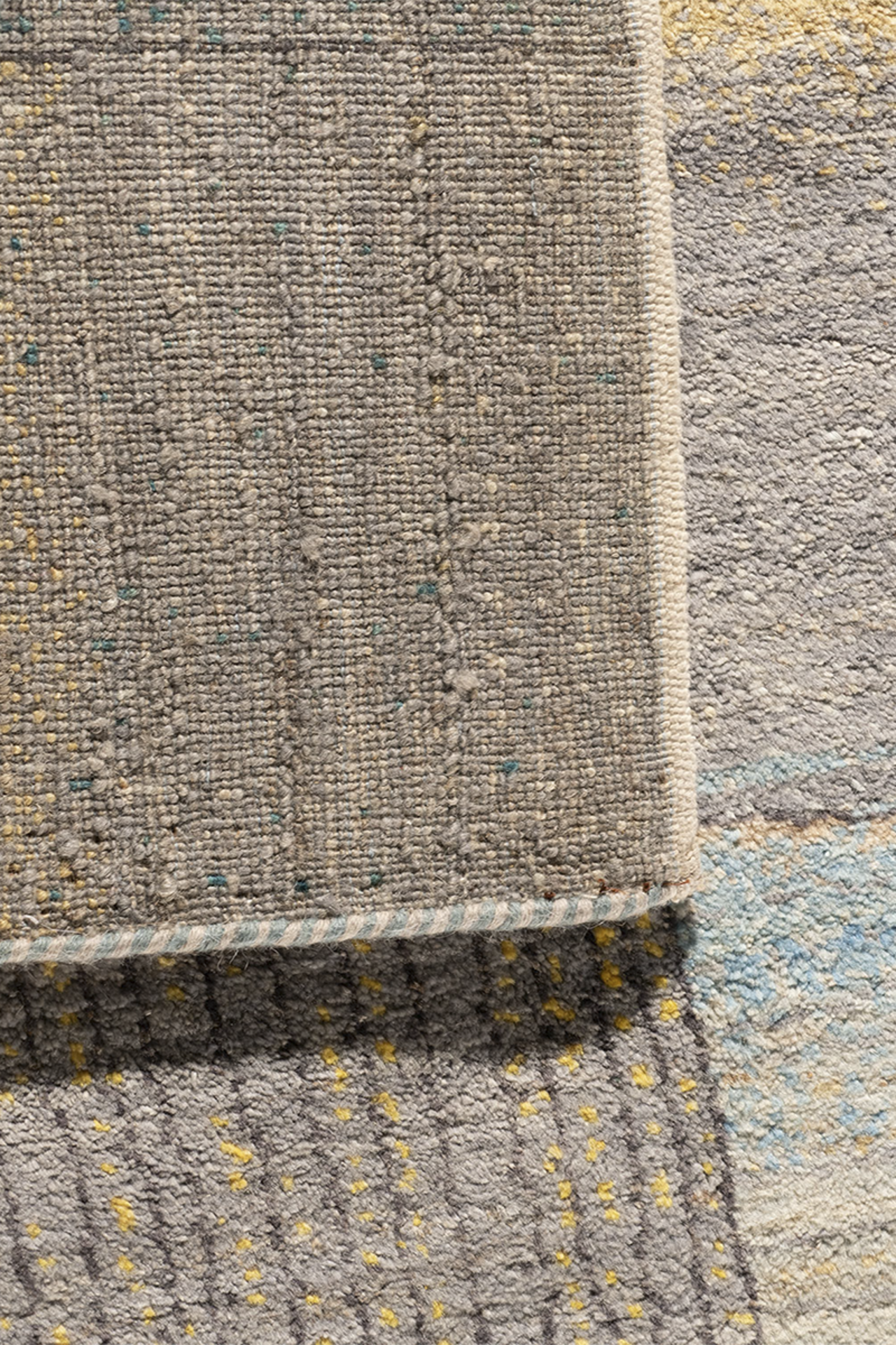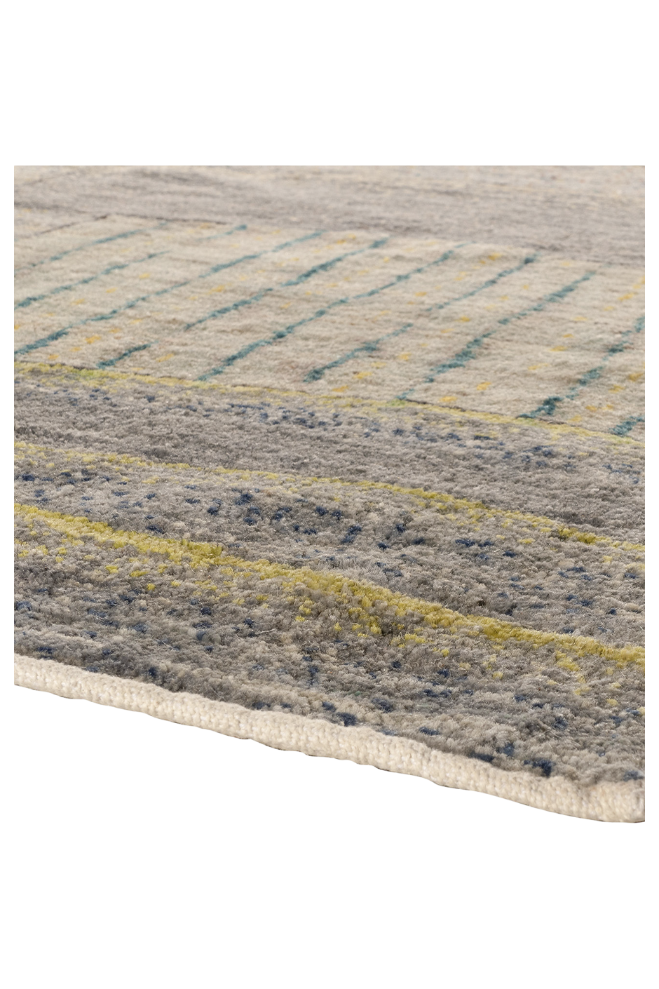 „Bachlauf“ ist ein Meisterstück reduzierter Textilkunst. In fließender Anordnung treffen handgeknüpfte Flächen in Grau-, Sand- und Aquatönen aufeinander – wie ein abstrahierter Flusslauf durch Stein und Erde. Die variierenden Strukturen und subtilen Linien erinnern an Wasser, das sich seinen Weg bahnt. Jeder Abschnitt wurde aus reiner Hochlandwolle gefertigt, pflanzlich gefärbt und meisterlich verarbeitet. Der Teppich wirkt beruhigend, grafisch und zugleich lebendig – ideal für moderne Interieurs mit Sinn für Materialität und Komposition.