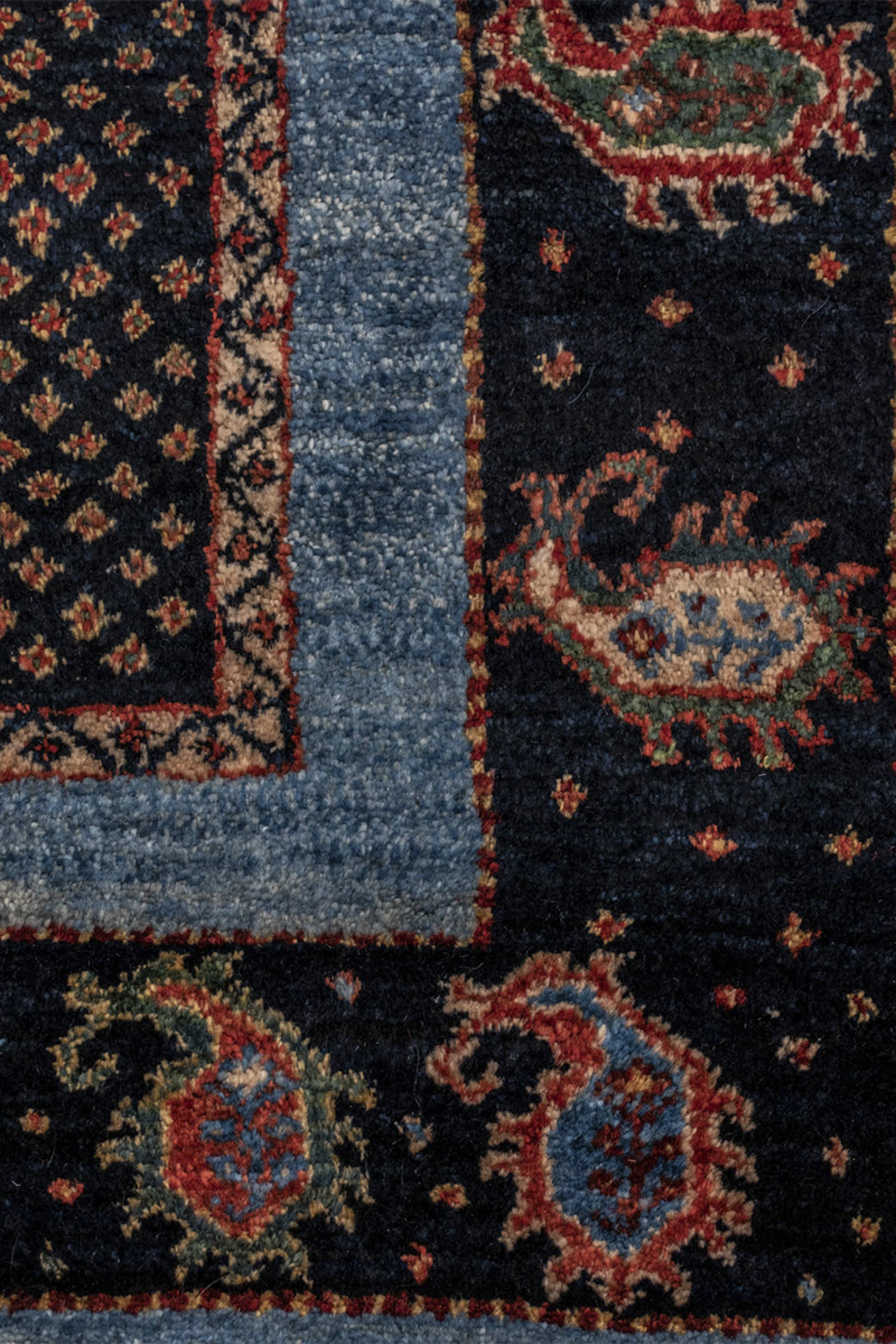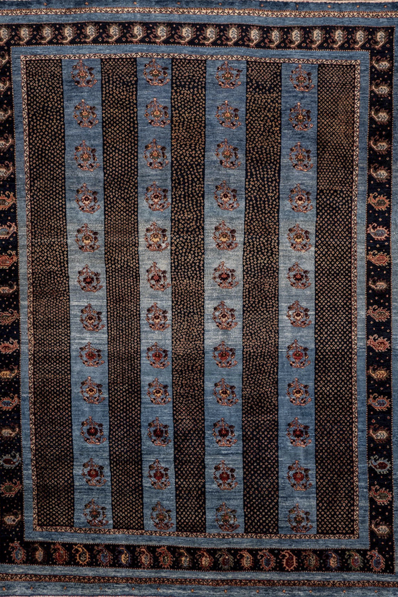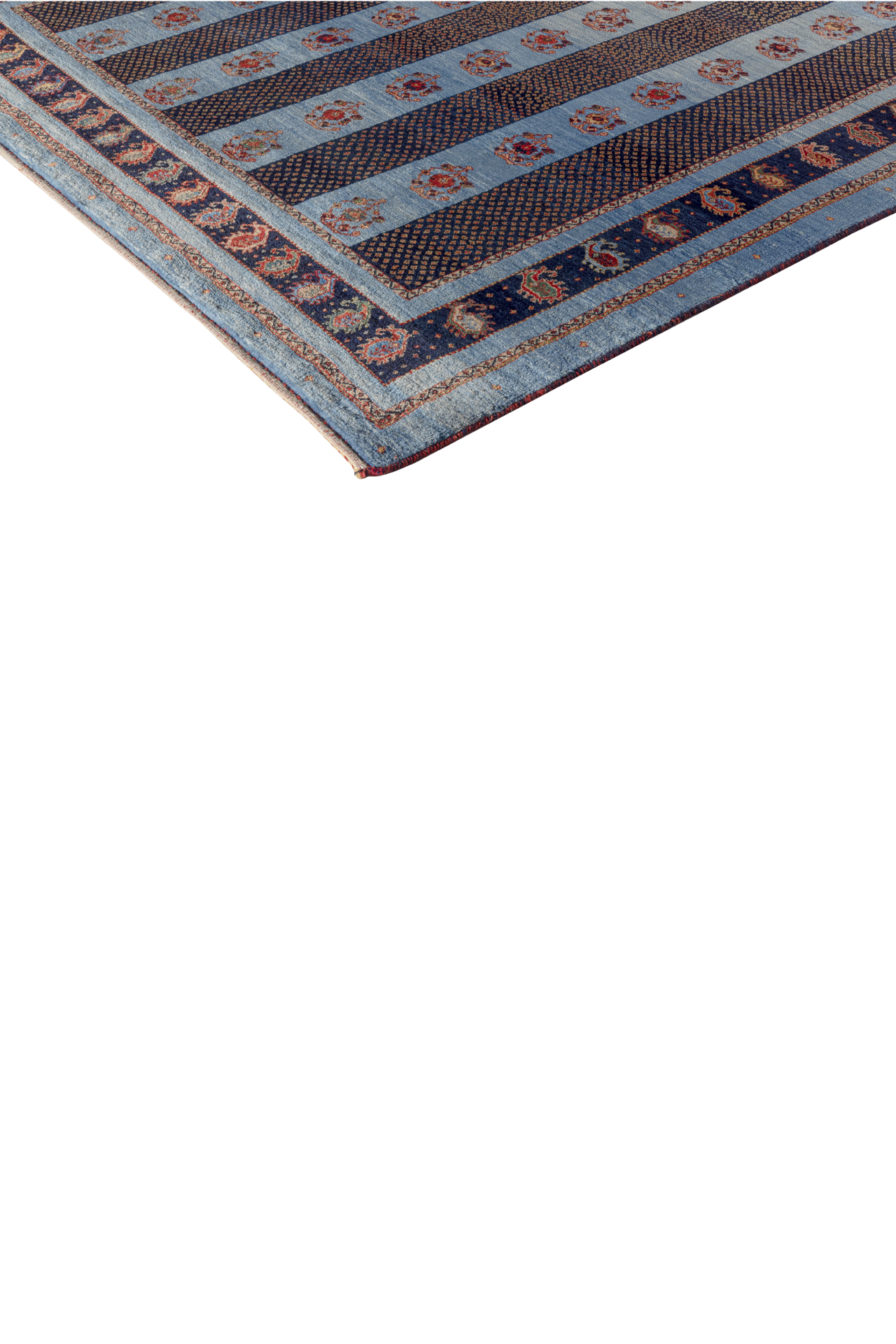 Der Teppich „Boteh-Melodien“ erzählt Geschichten in feinster Rhythmik: Wie musikalische Takte reihen sich die ikonischen Boteh-Motive – Tropfenformen voller Symbolik – auf einem samtigen Hintergrund aus tiefem Blau und warmem Rot. Dieses Design steht für Wachstum, Energie und den ewigen Wandel – ein Sinnbild aus der persischen Kultur, stilvoll interpretiert.
