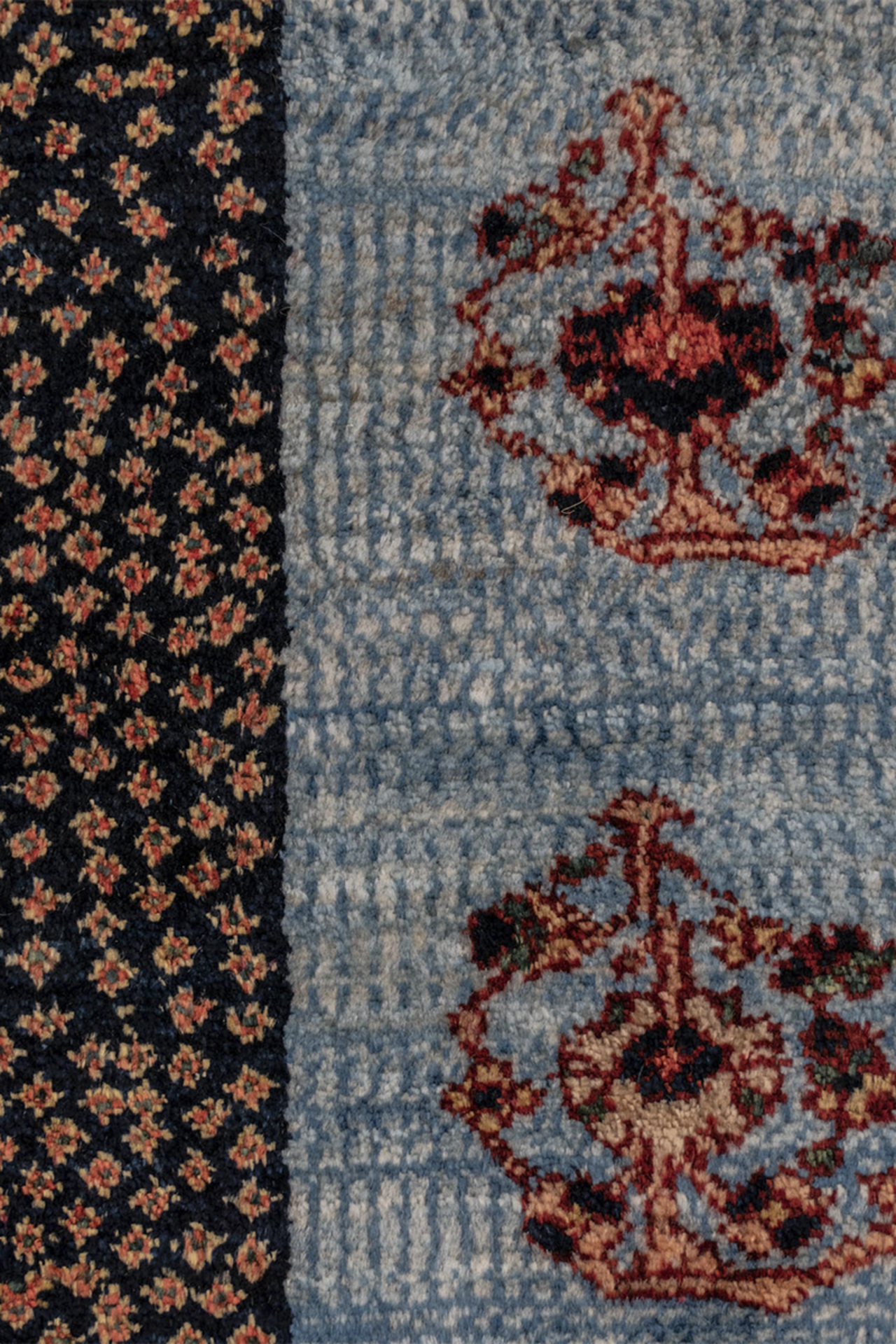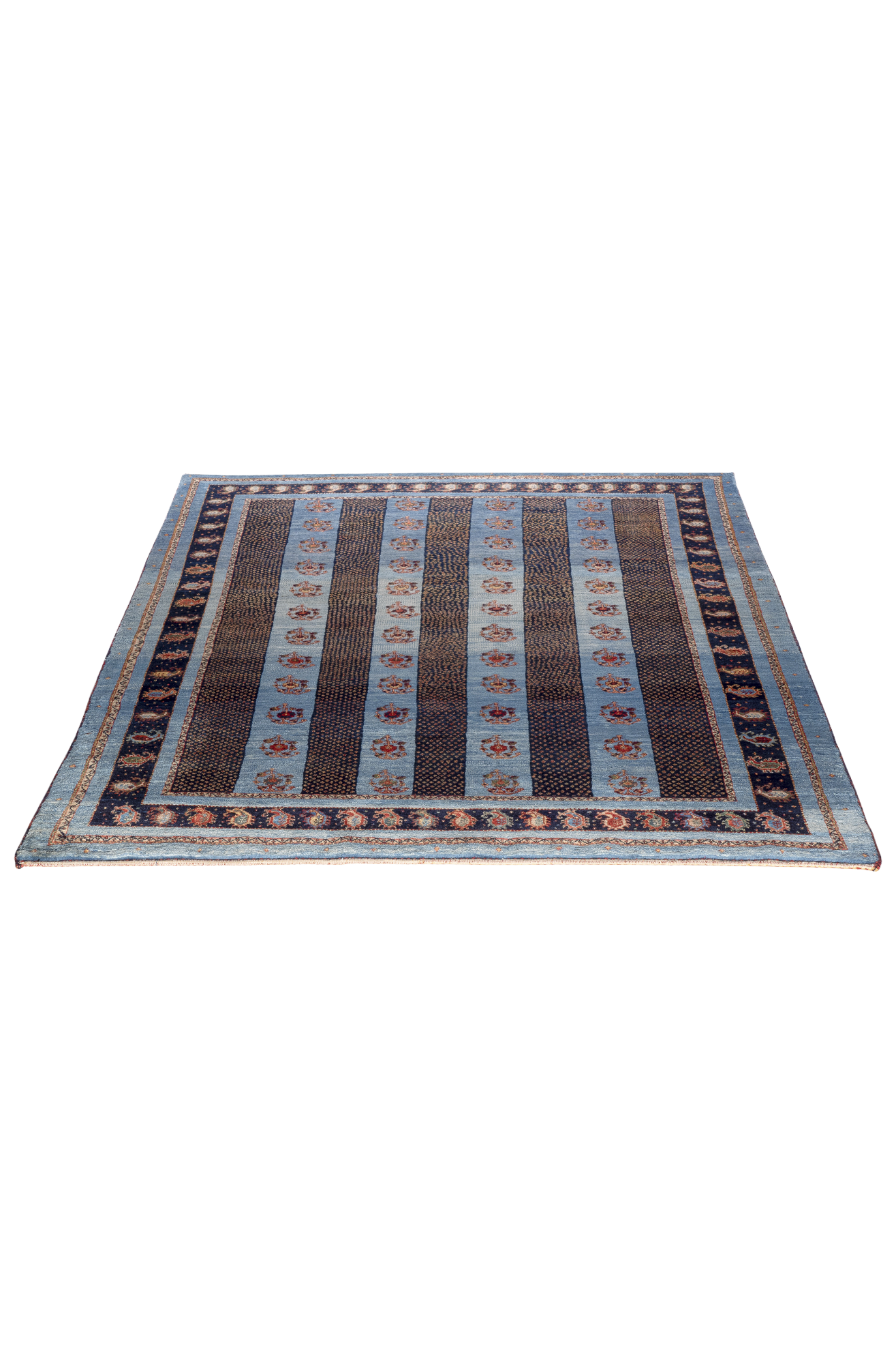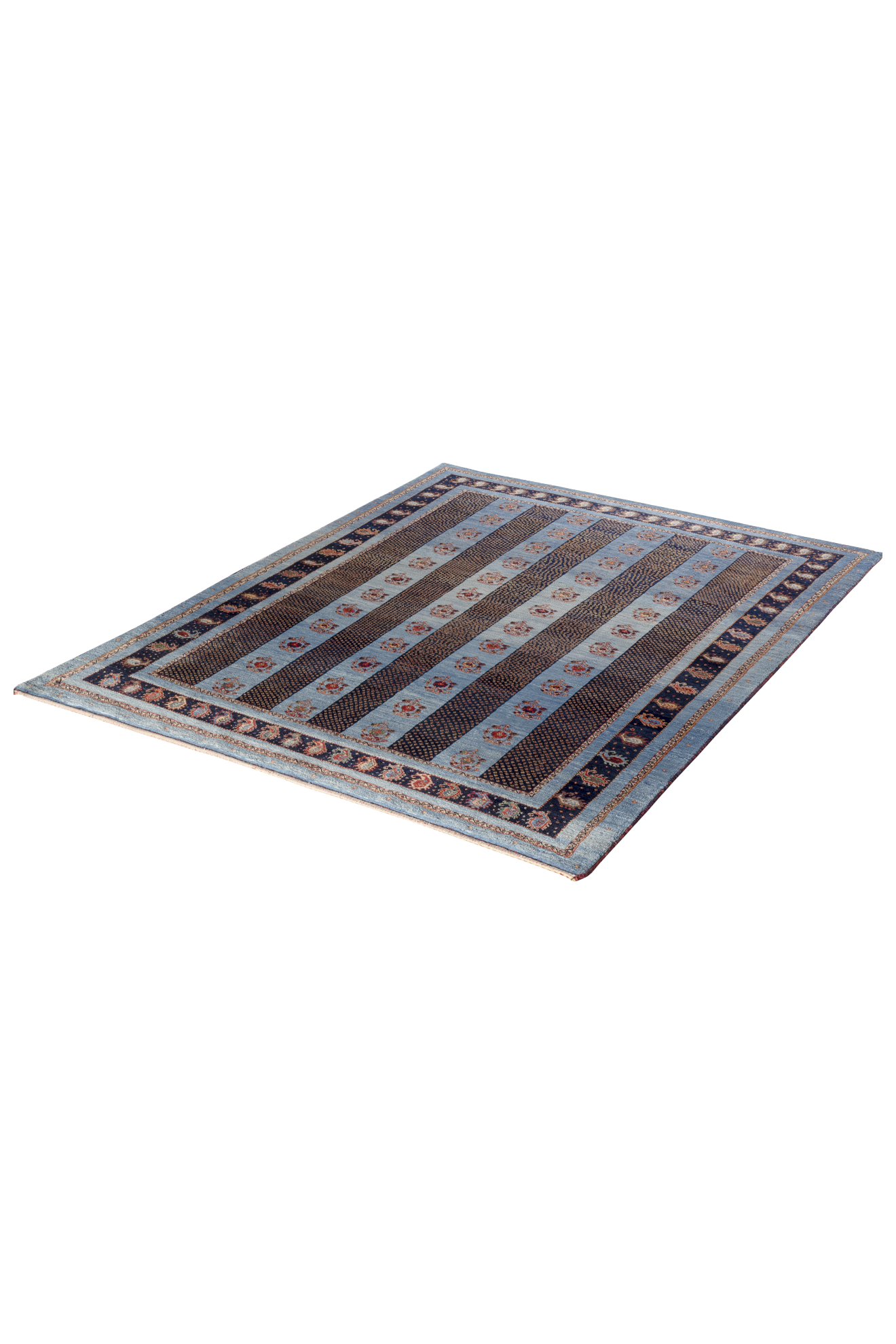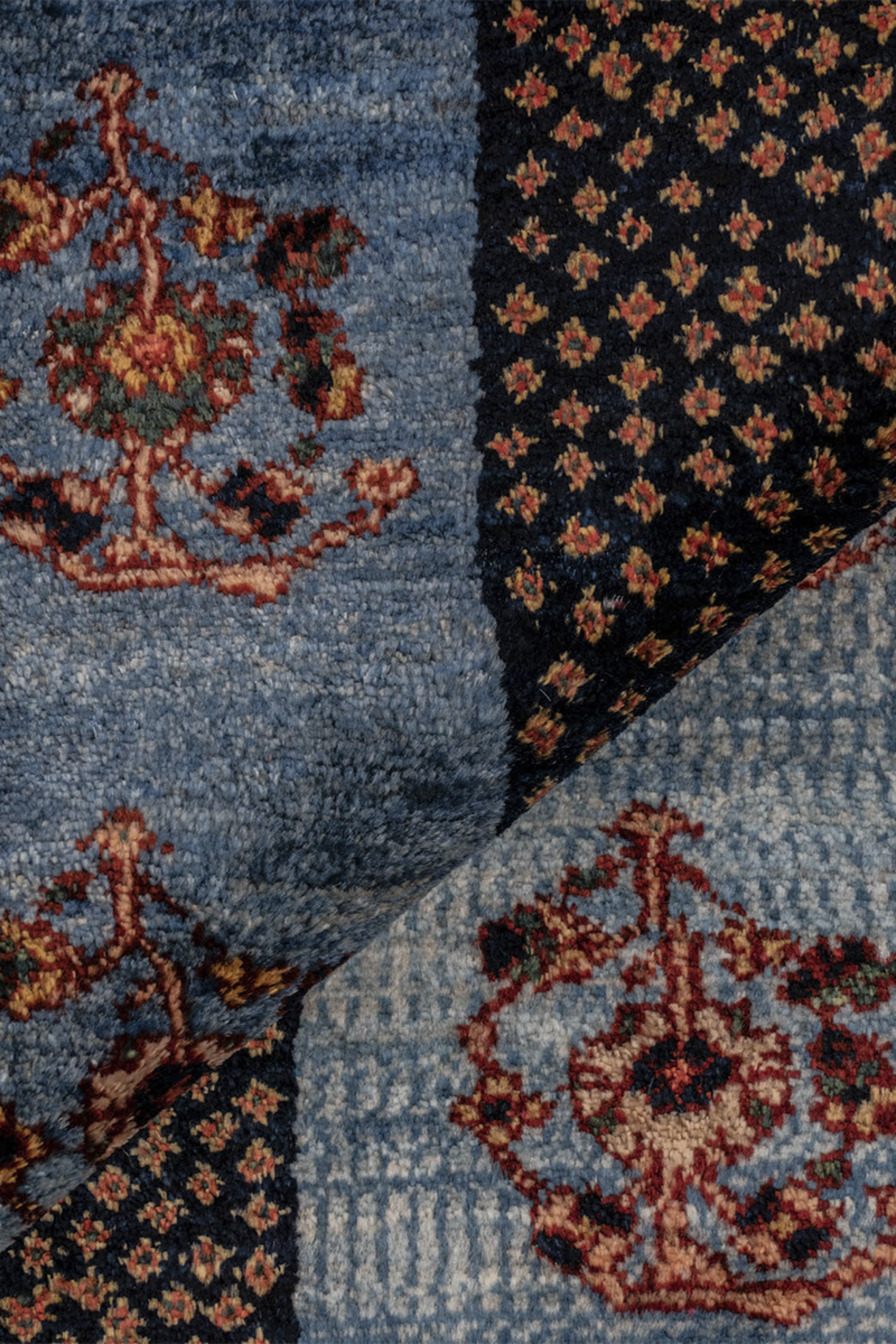 Der Teppich „Boteh-Melodien“ erzählt Geschichten in feinster Rhythmik: Wie musikalische Takte reihen sich die ikonischen Boteh-Motive – Tropfenformen voller Symbolik – auf einem samtigen Hintergrund aus tiefem Blau und warmem Rot. Dieses Design steht für Wachstum, Energie und den ewigen Wandel – ein Sinnbild aus der persischen Kultur, stilvoll interpretiert.