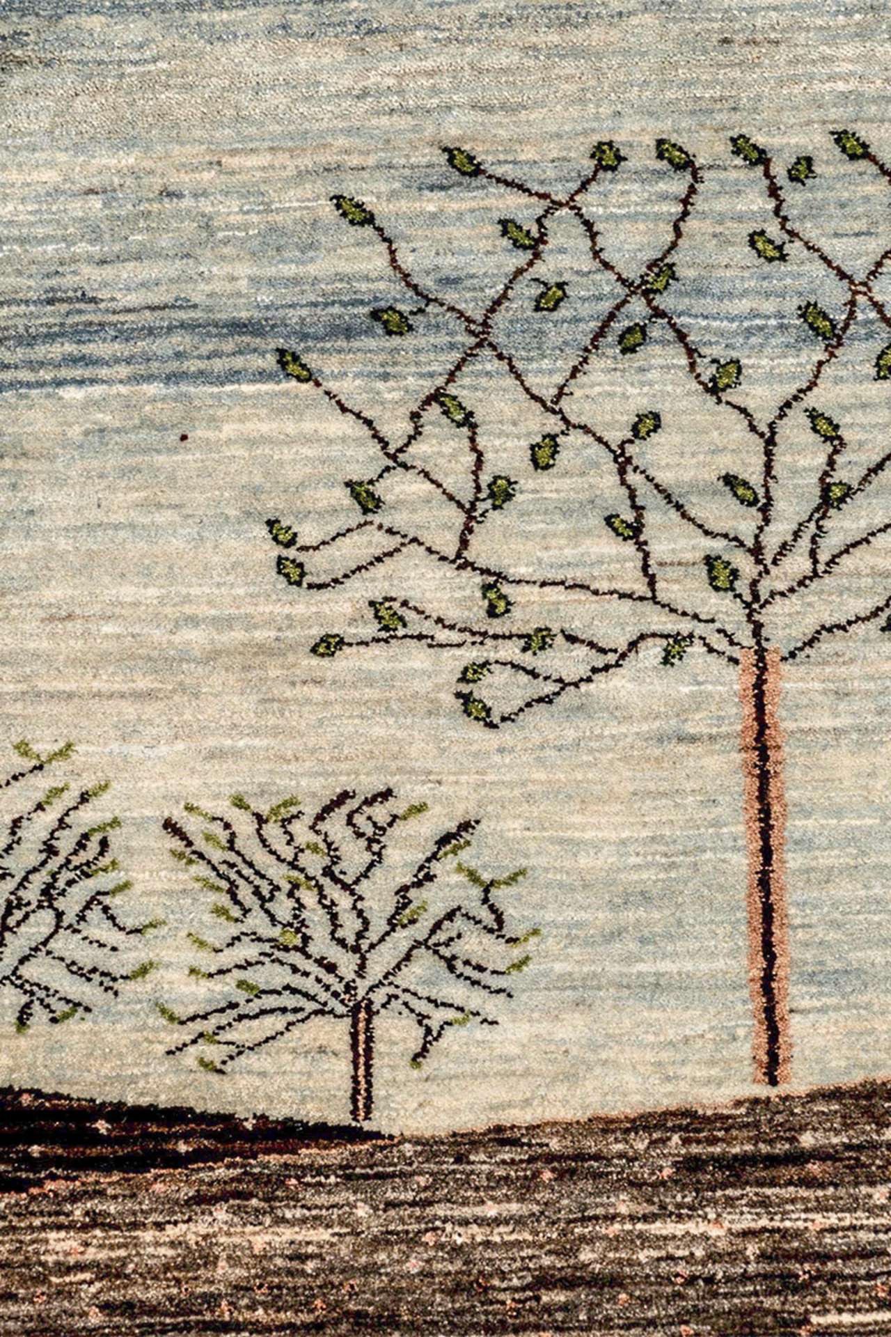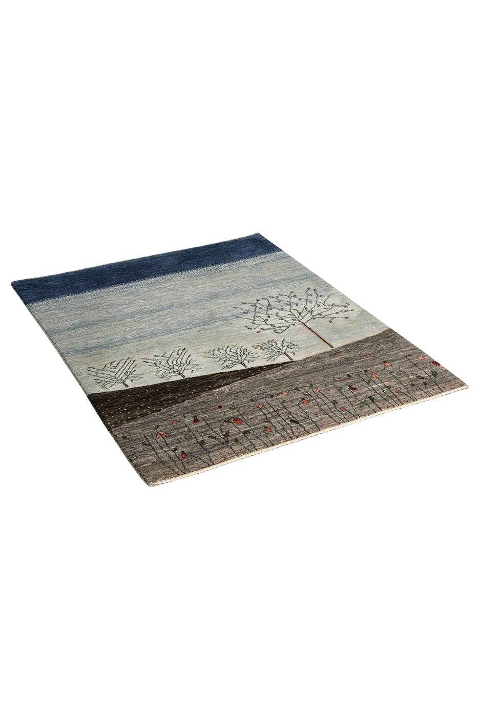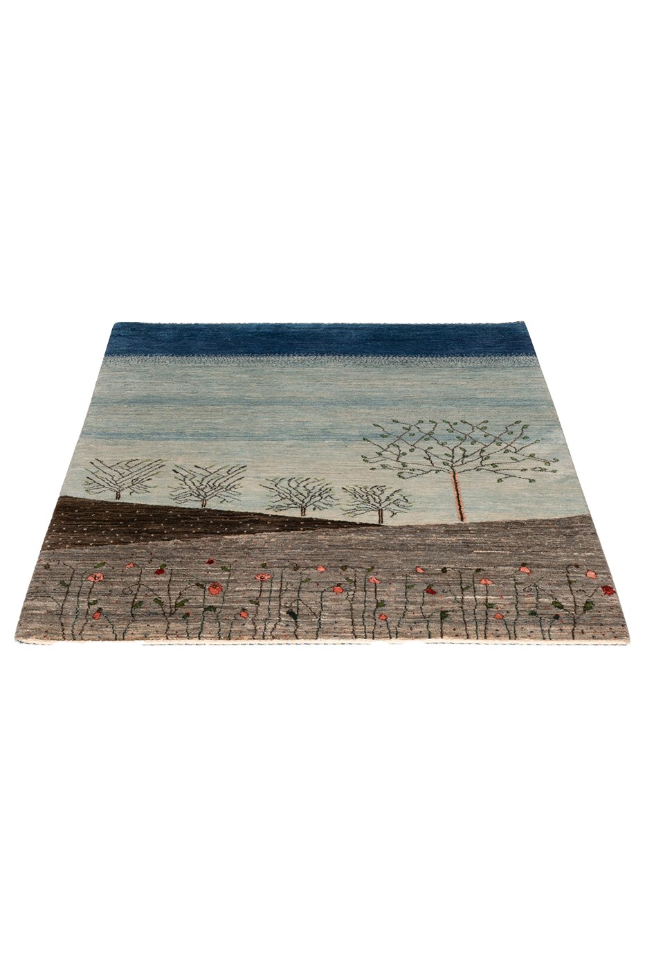 rwachenden Frühlings. In sanftem Hellblau gehalten, symbolisiert der Teppich den klaren Himmel eines neuen Morgens. Am unteren Rand sprießen kunstvoll gestaltete Blumen, die das zarte Wachstum und die Farbenpracht der Jahreszeit widerspiegeln. Stilisiert dargestellte Bäume verleihen dem Design eine harmonische Verbindung zur Natur und verdeutlichen das stetige Erblühen und Wachsen. Der Teppich wird aus hochwertiger Schurwolle gefertigt und von Hand geknüpft, wobei Naturfarben verwendet werden, um die sanften Töne und die floralen Details hervorzuheben. Ein Kunstwerk, das nicht nur die Natur, sondern auch das Leben und die Frische des Frühlings in Ihr Zuhause bringt.