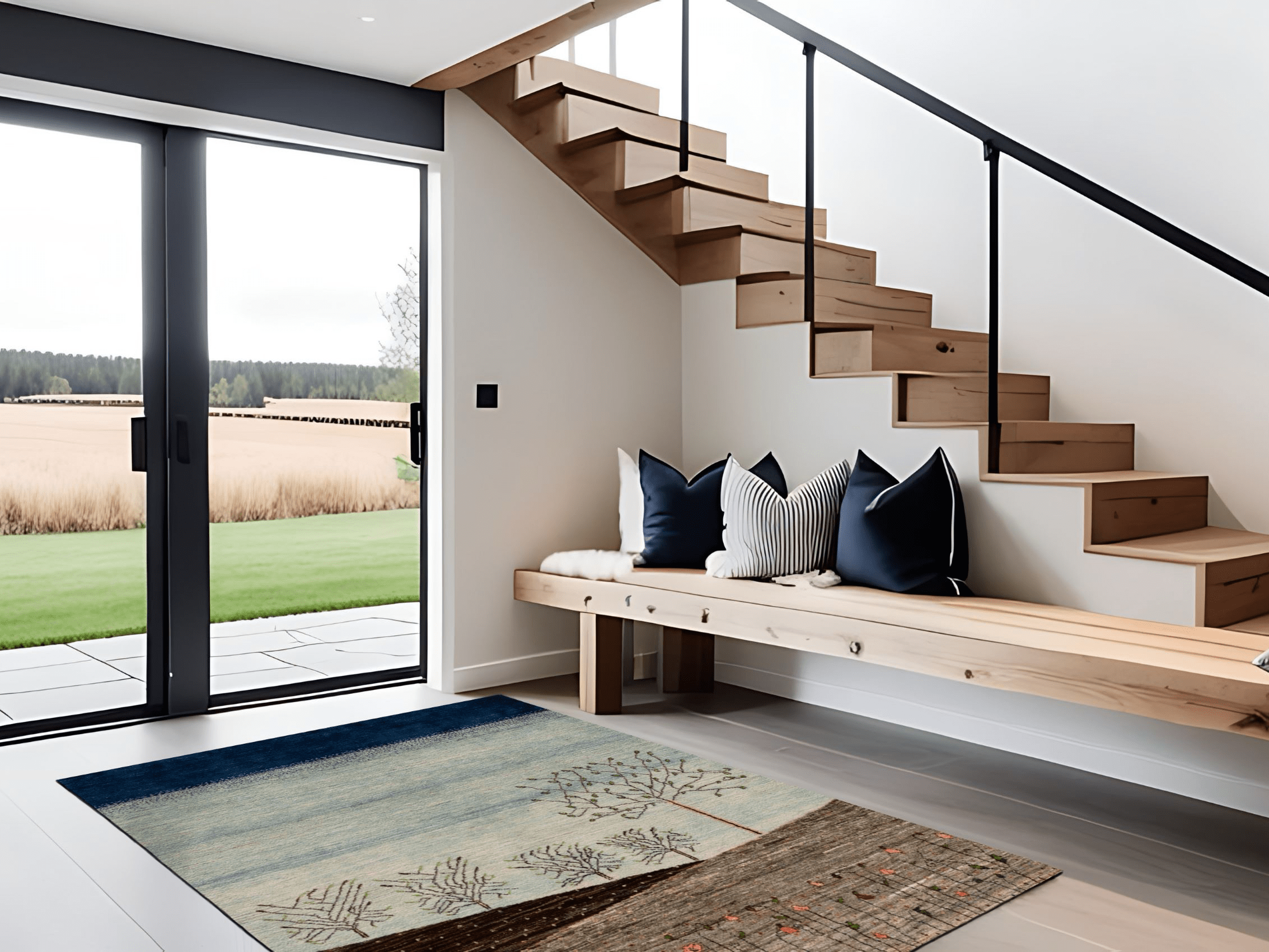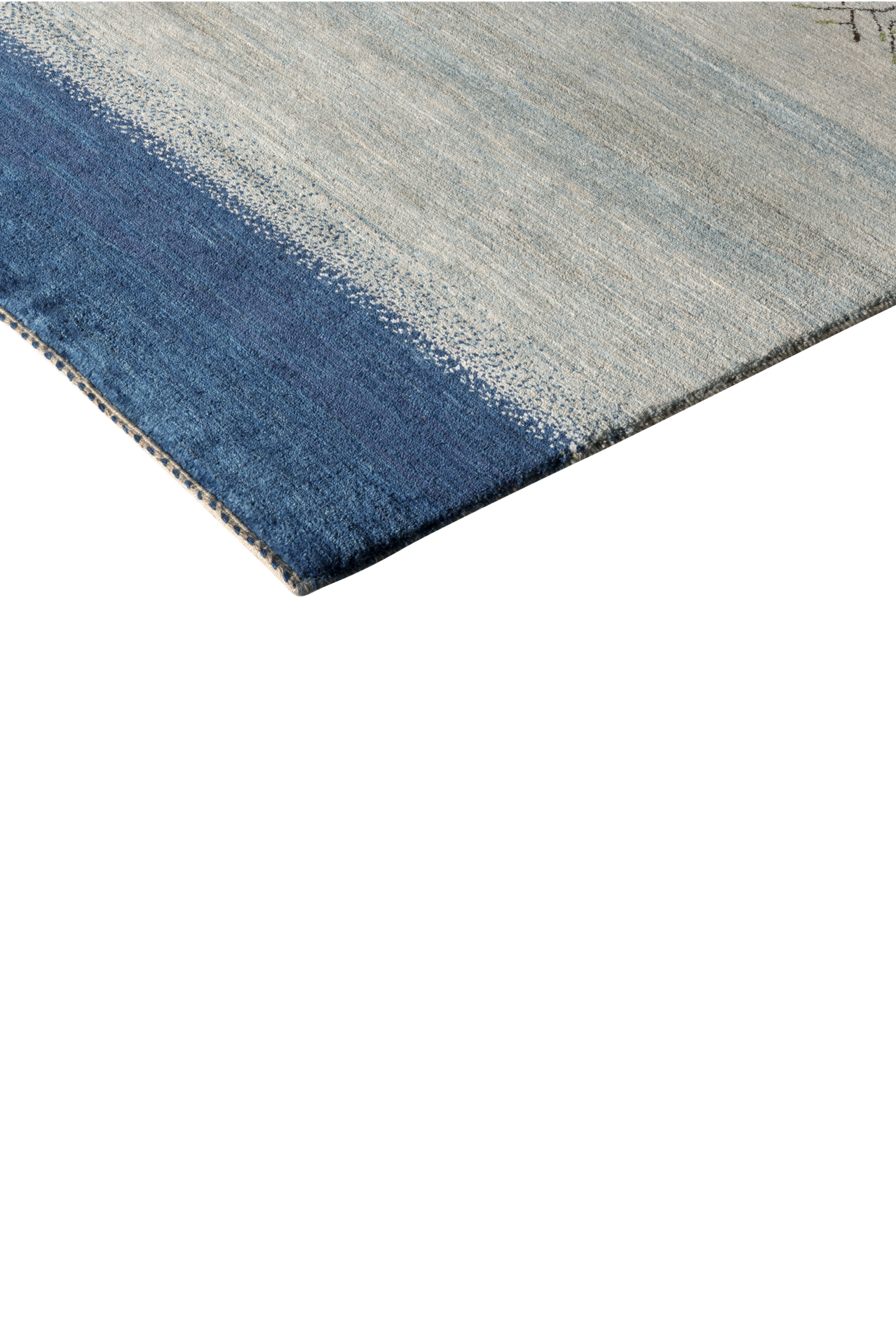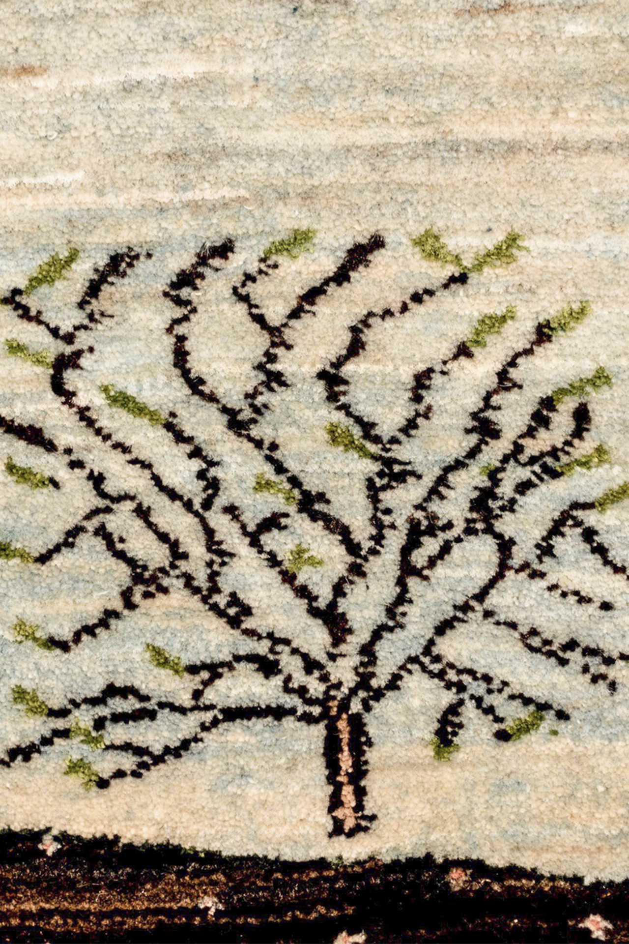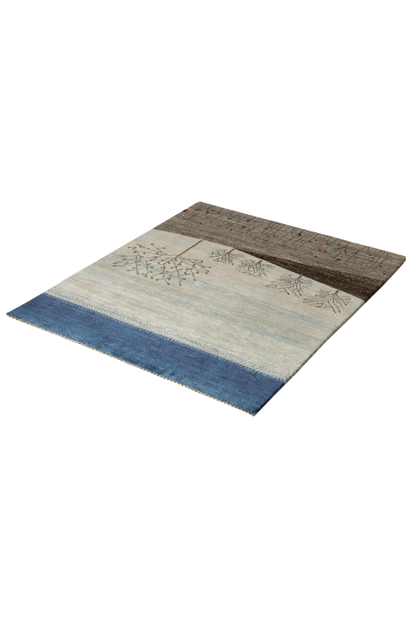rwachenden Frühlings. In sanftem Hellblau gehalten, symbolisiert der Teppich den klaren Himmel eines neuen Morgens. Am unteren Rand sprießen kunstvoll gestaltete Blumen, die das zarte Wachstum und die Farbenpracht der Jahreszeit widerspiegeln. Stilisiert dargestellte Bäume verleihen dem Design eine harmonische Verbindung zur Natur und verdeutlichen das stetige Erblühen und Wachsen. Der Teppich wird aus hochwertiger Schurwolle gefertigt und von Hand geknüpft, wobei Naturfarben verwendet werden, um die sanften Töne und die floralen Details hervorzuheben. Ein Kunstwerk, das nicht nur die Natur, sondern auch das Leben und die Frische des Frühlings in Ihr Zuhause bringt.