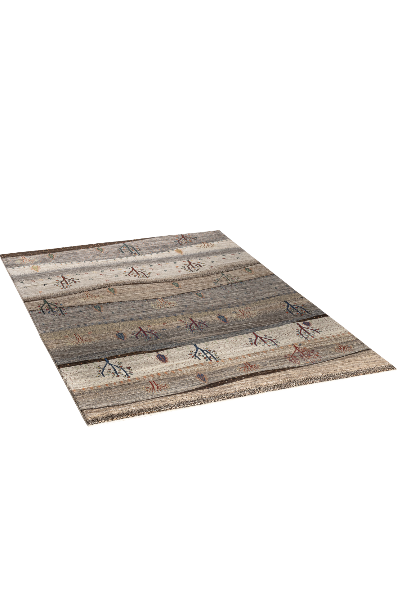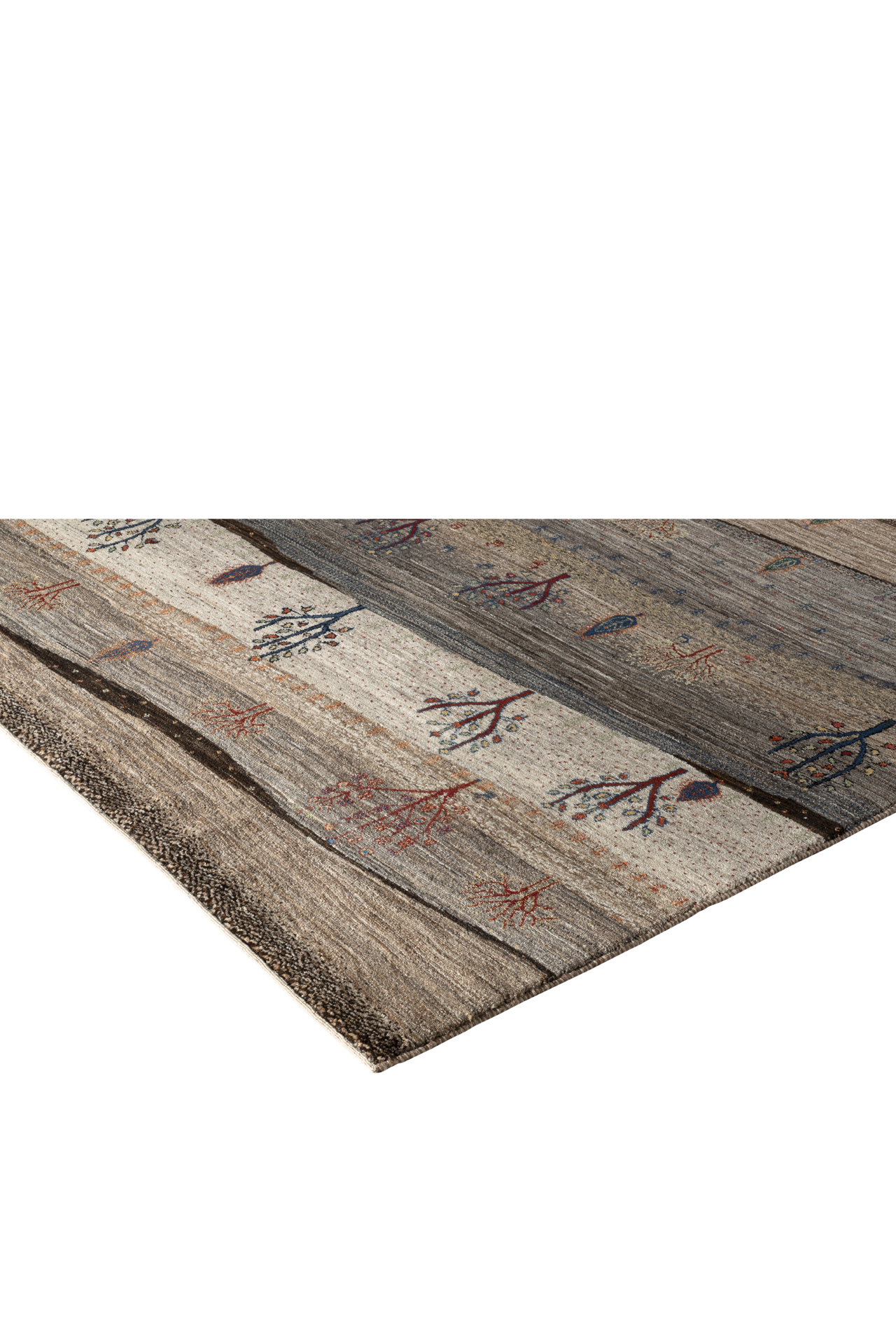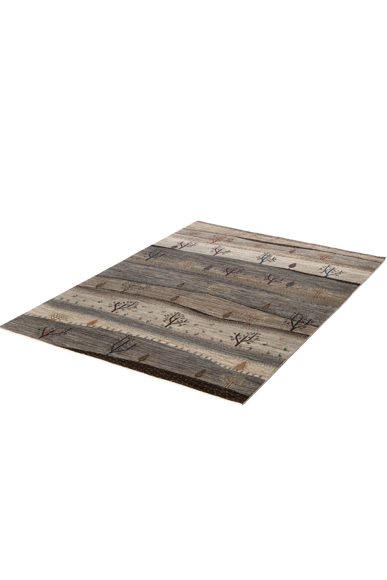 Der Teppich „Gebirgswüste“ erzählt von einem stillen, weiten Land – Hügel um Hügel in Erdtönen, durchzogen von stilisierten Bäumen, zarten Pflanzen und kleinen Tieren. Die wellenförmige Komposition erinnert an die rhythmische Linie einer Wüstenlandschaft im Gebirge – rau, reduziert und zugleich lebendig. Jeder Farbwechsel ist wie ein Höhenzug, jeder Baum ein stilles Zeichen von Leben im Kargen.