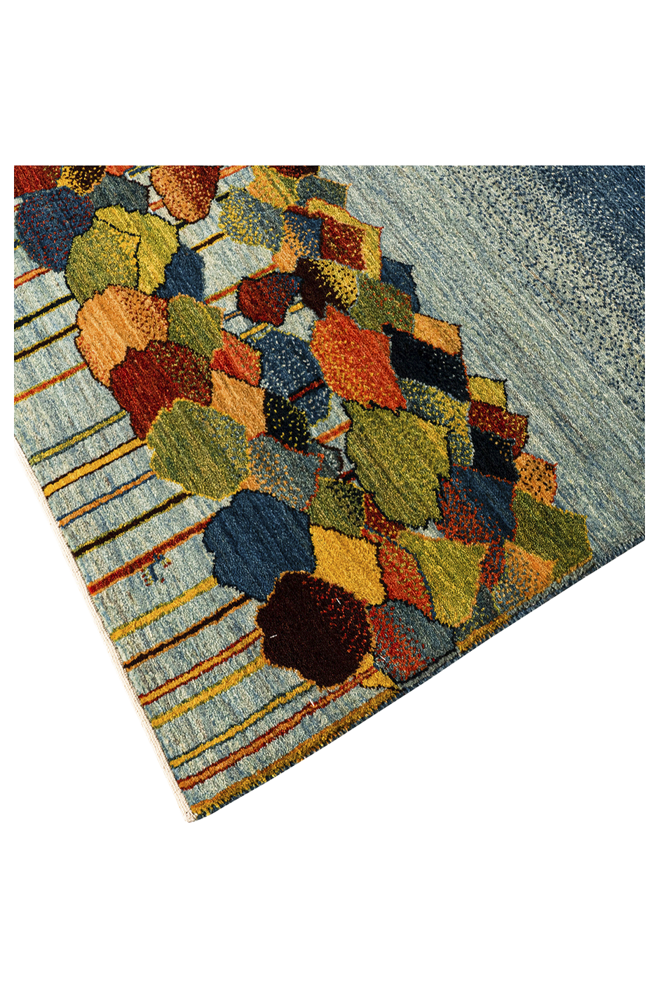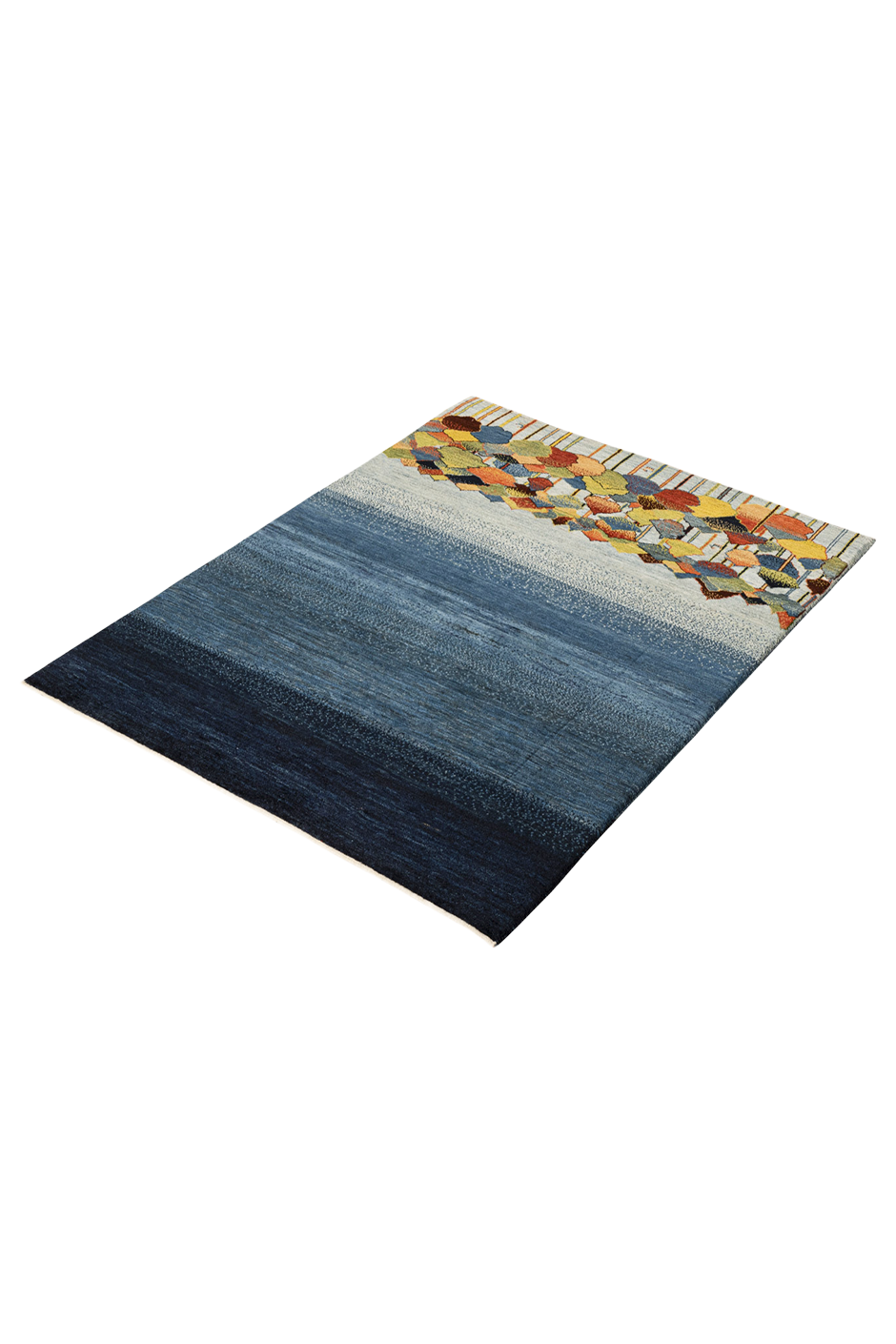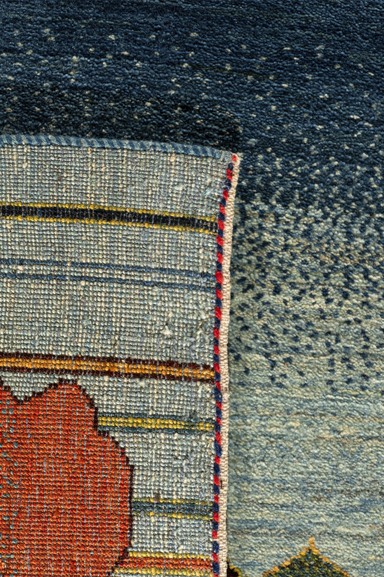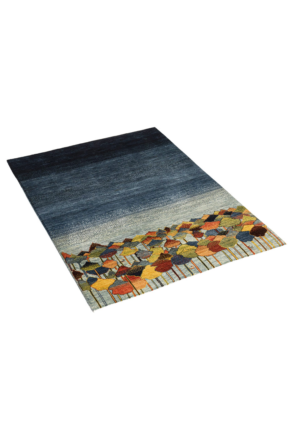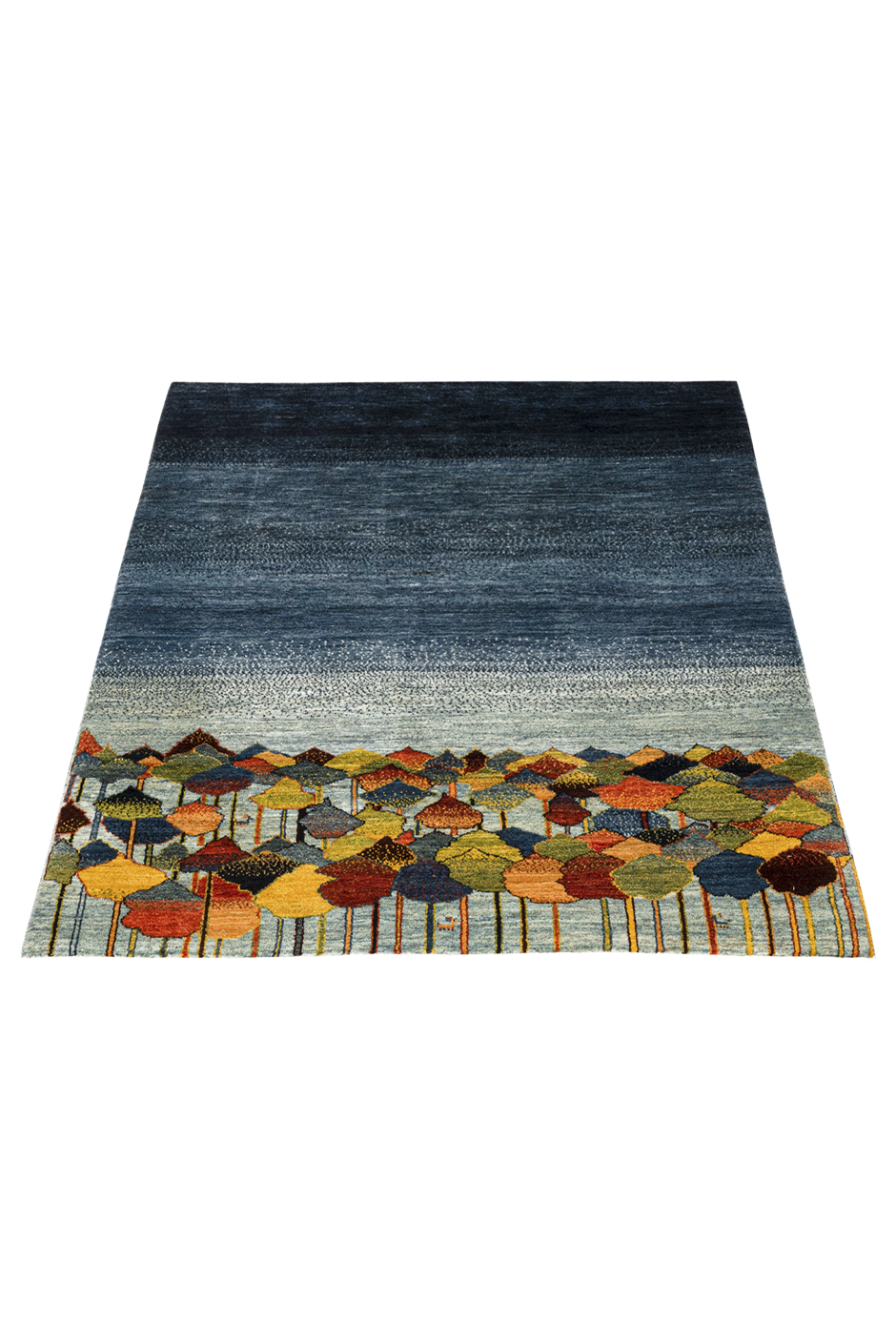 Dieser exquisite Teppich besticht durch einen tiefen royalblauen Hintergrund, der die leuchtenden Farben von bunten Bäumen am unteren Rand elegant kontrastiert. Die kunstvoll gestalteten Bäume in warmen, lebhaften Farbtönen wie Rot, Orange und Gelb symbolisieren das Leben und die Schönheit der Natur. Der Teppich ist ein wahres Meisterwerk der Nomadenkunst, das die floralen Elemente der persischen Tradition mit modernen Akzenten kombiniert. Handgeknüpft aus hochwertiger Schurwolle, überzeugt dieser Teppich nicht nur durch seine visuelle Ausstrahlung, sondern auch durch außergewöhnliche Weichheit und Langlebigkeit. Die Verwendung natürlicher Pflanzenfarben unterstreicht die Authentizität dieses Kunstwerks und macht ihn zu einem einzigartigen Accessoire für Ihr Zuhause.