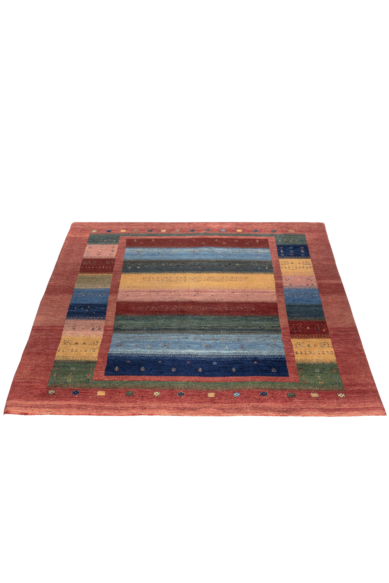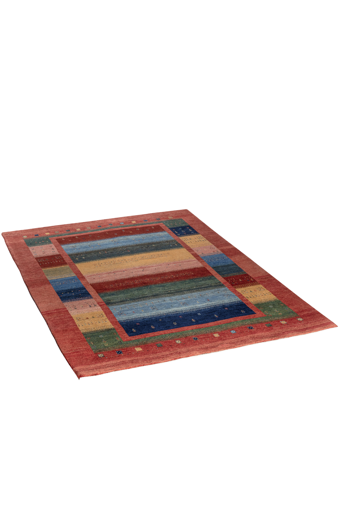 Das Teppichunikat „Horizonte“ entfaltet seine besondere Wirkung durch farbige Streifen, die sich in sanfter Abfolge über die Fläche legen – in warmem Ocker, tiefem Blau, weichem Rosé und sattem Grün. Dazwischen: kleine, fein eingearbeitete Symbole wie Erinnerungen – Bäume, Blumen, Tiere – wie zufällig gestreut, und doch geordnet wie ein inneres Muster.
