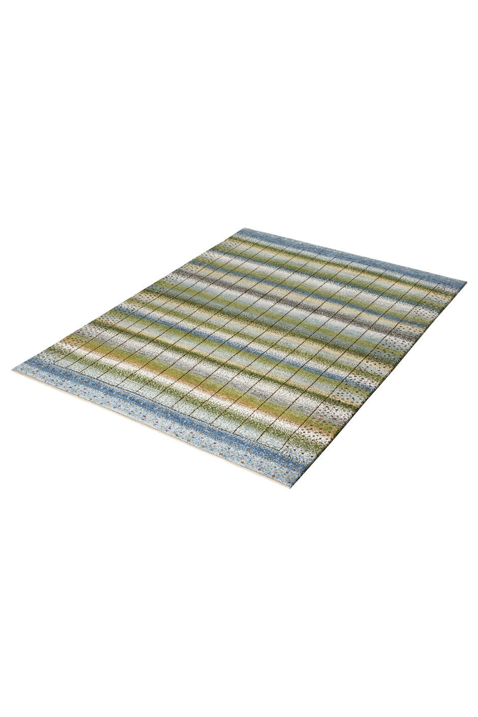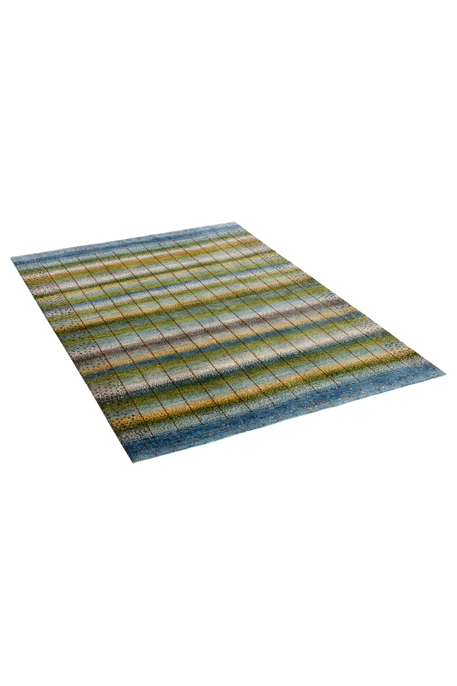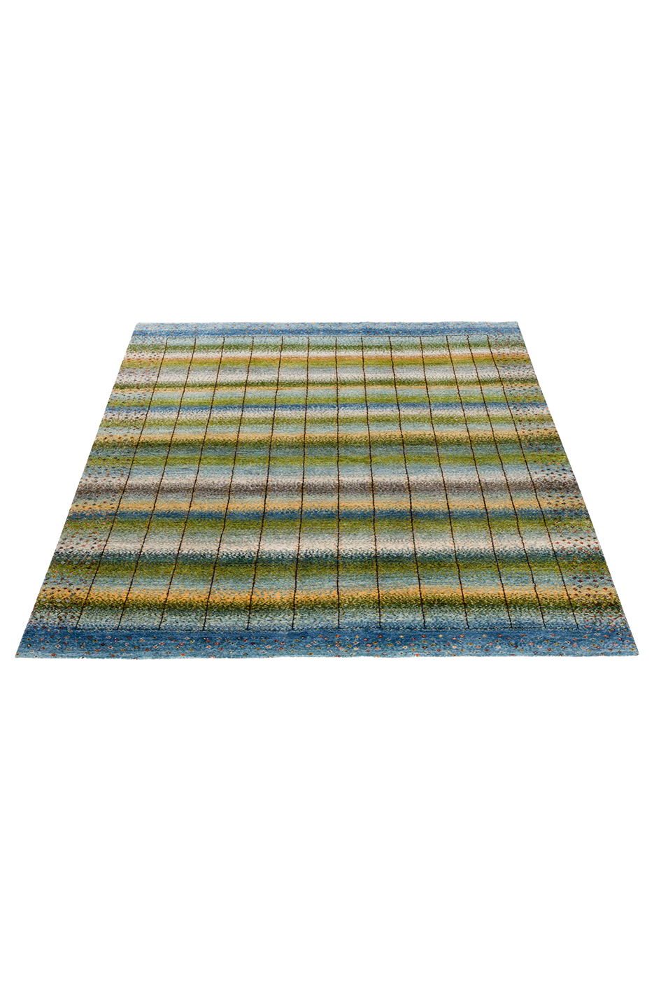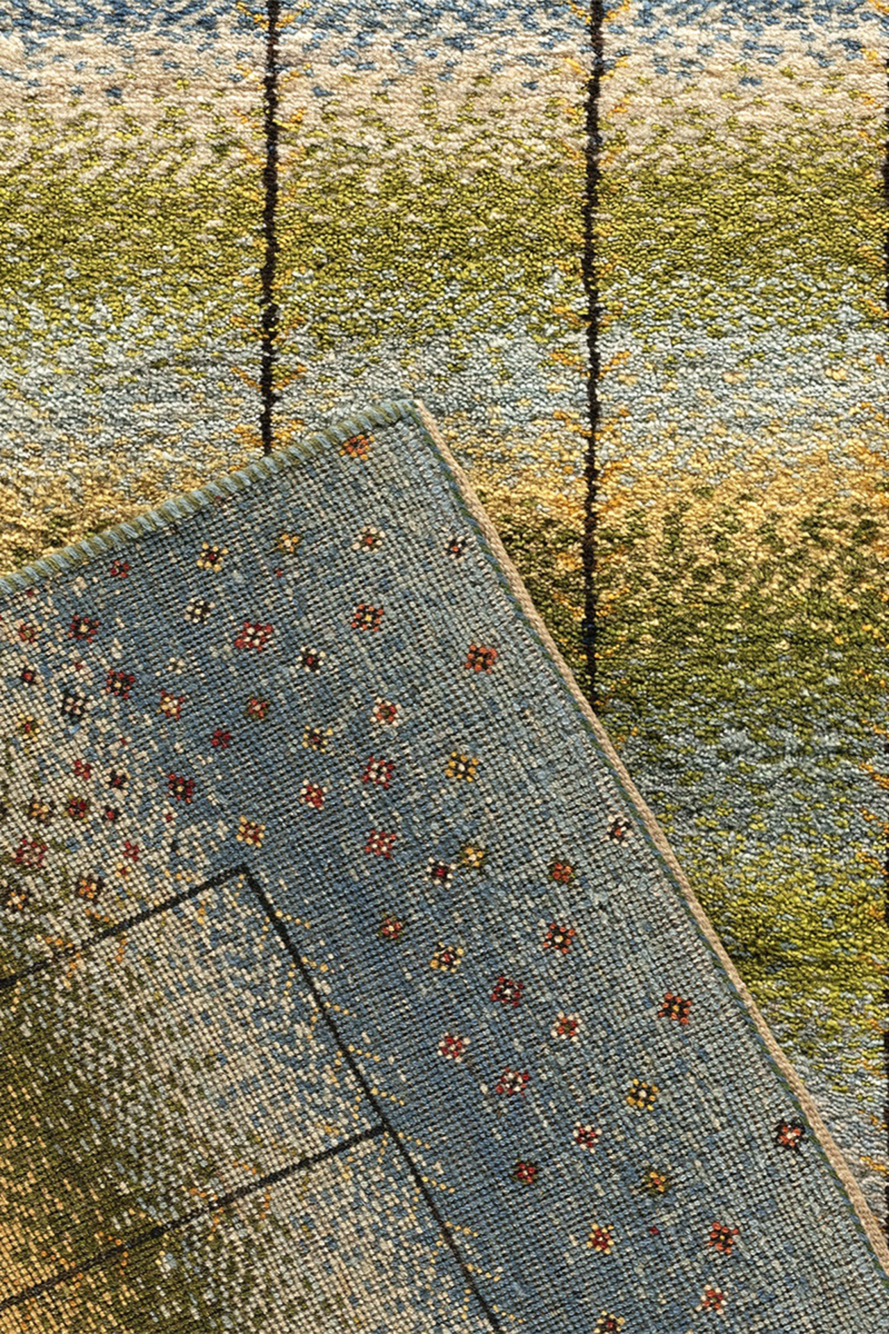 Lebenslinien ist ein Teppich, der Geschichten erzählt – in sanften Bahnen aus Blau, Grün, Beige und Gold, durchzogen von vertikalen Linien, die wie Pfade wirken: Wege des Lebens, Erinnerungen, Begegnungen. Das Design vereint meditative Ruhe mit subtiler Bewegung – ein Kunstwerk, das wirkt, ohne laut zu sein.