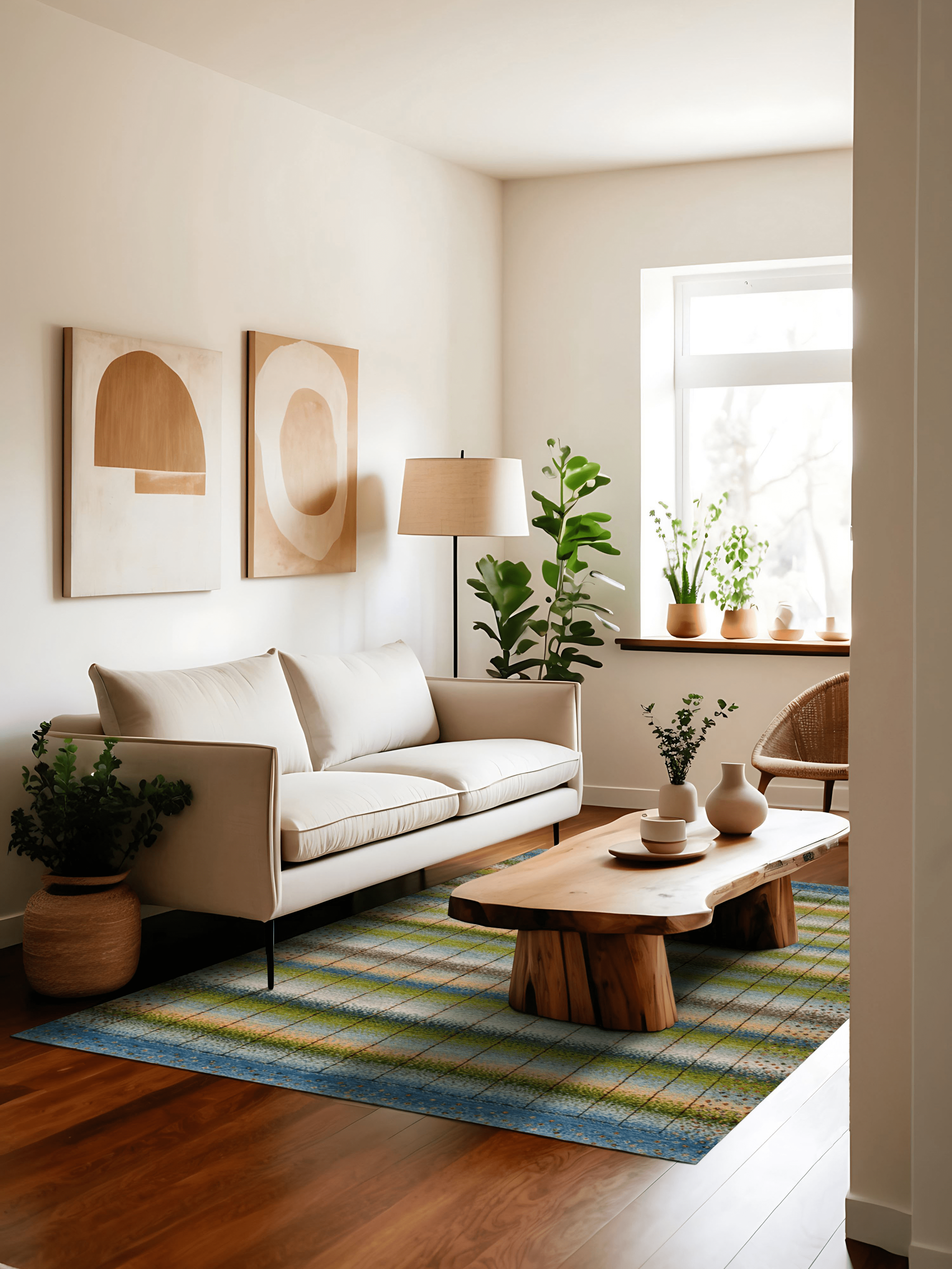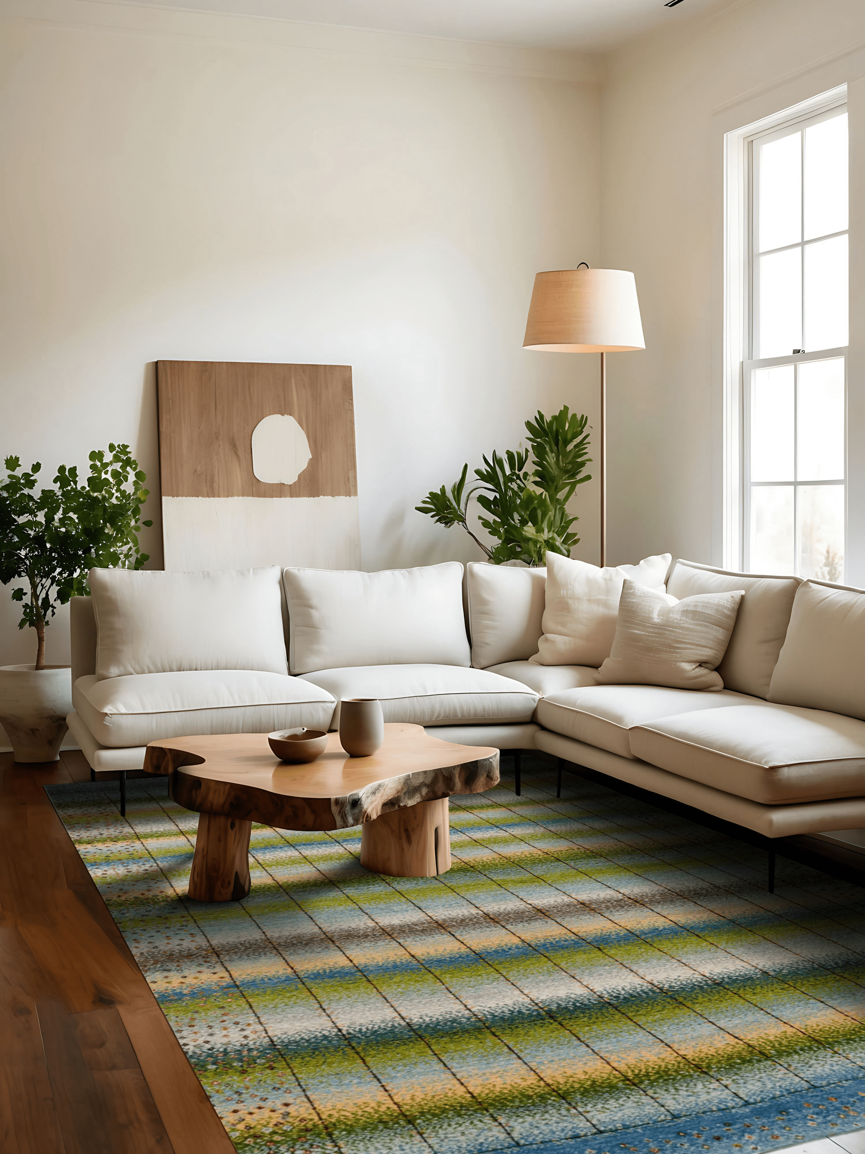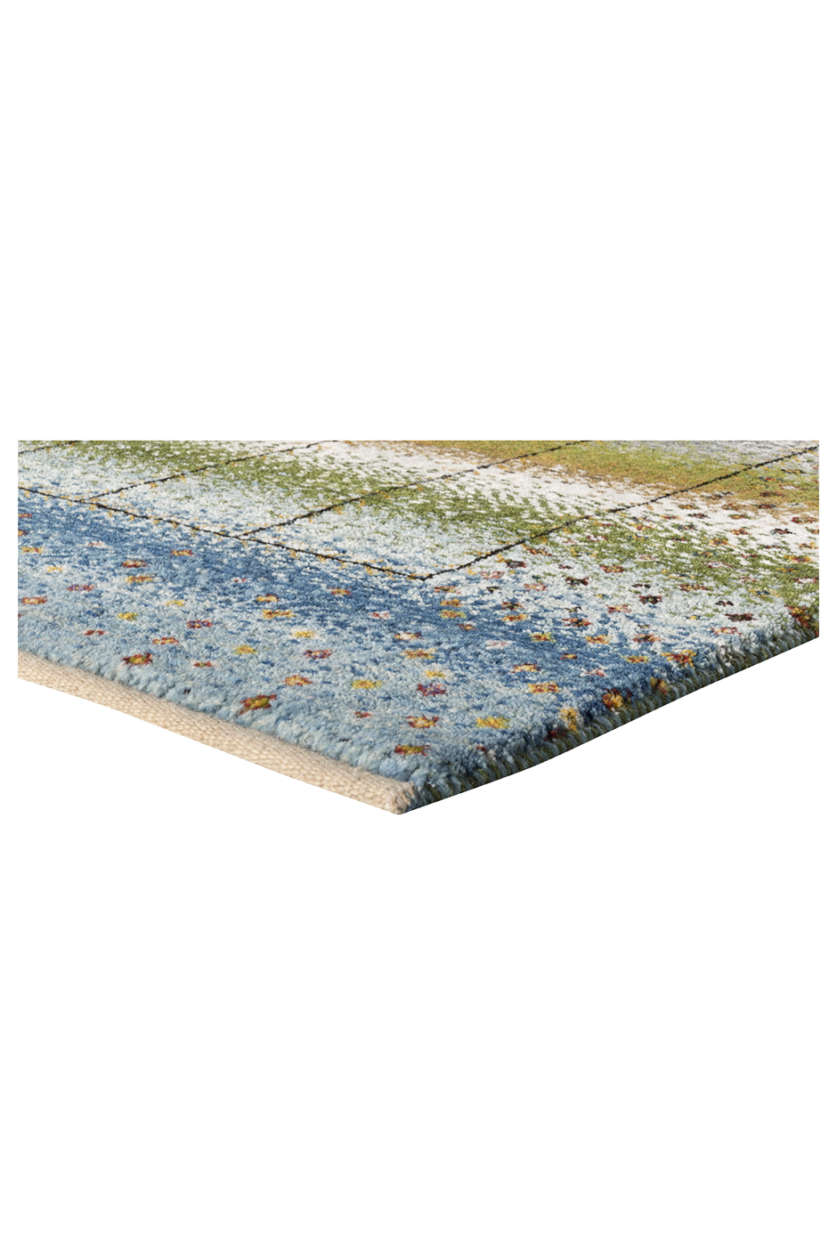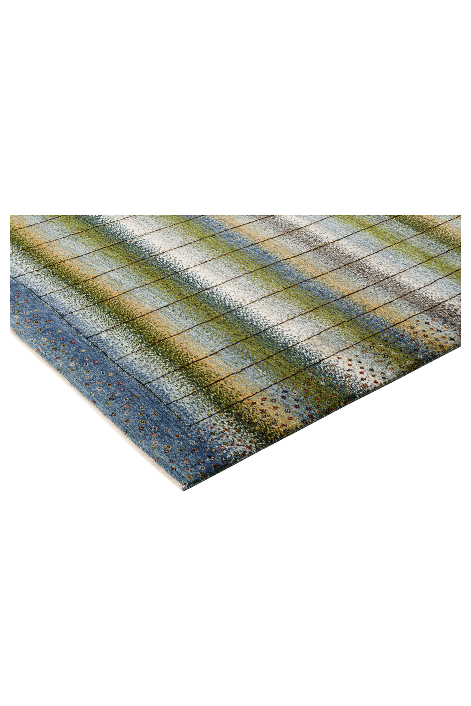 Lebenslinien ist ein Teppich, der Geschichten erzählt – in sanften Bahnen aus Blau, Grün, Beige und Gold, durchzogen von vertikalen Linien, die wie Pfade wirken: Wege des Lebens, Erinnerungen, Begegnungen. Das Design vereint meditative Ruhe mit subtiler Bewegung – ein Kunstwerk, das wirkt, ohne laut zu sein.