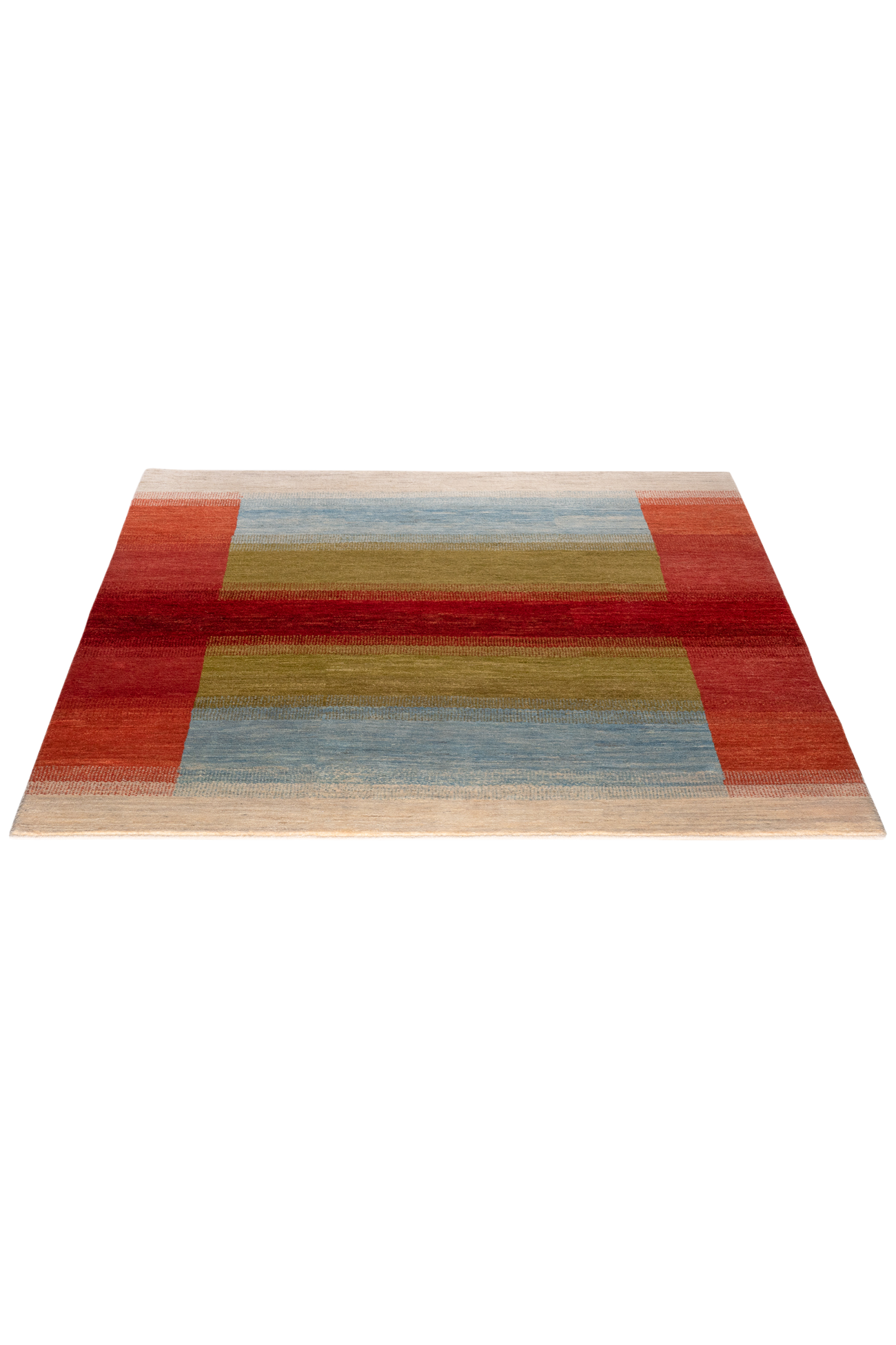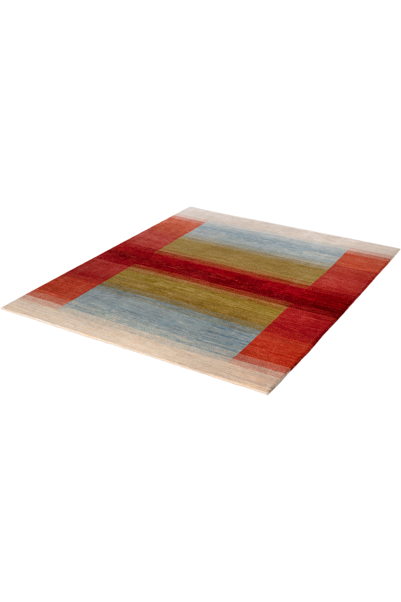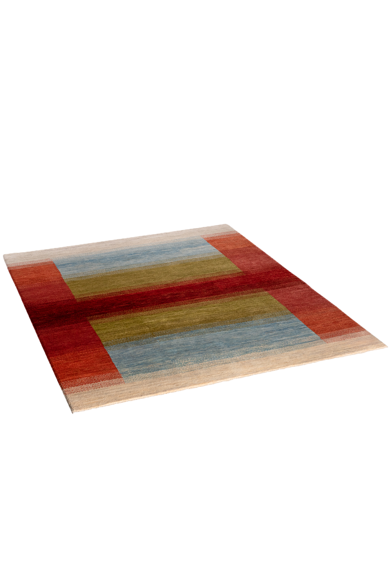 Der Gabbeh-Teppich „Lichtspiel“ verwebt Horizonte und Übergänge zu einem poetischen Farbspiel. Handgeknüpft aus reiner Schurwolle, leuchten in diesem Unikat warme Rottöne, erdiges Olivgrün, weiches Himmelblau und cremiges Naturweiß in harmonischer Balance. Jeder Farbstreifen fließt sanft in den nächsten über – wie ein flirrendes Lichtspiel am Horizont.