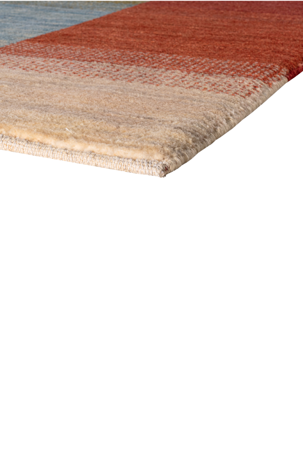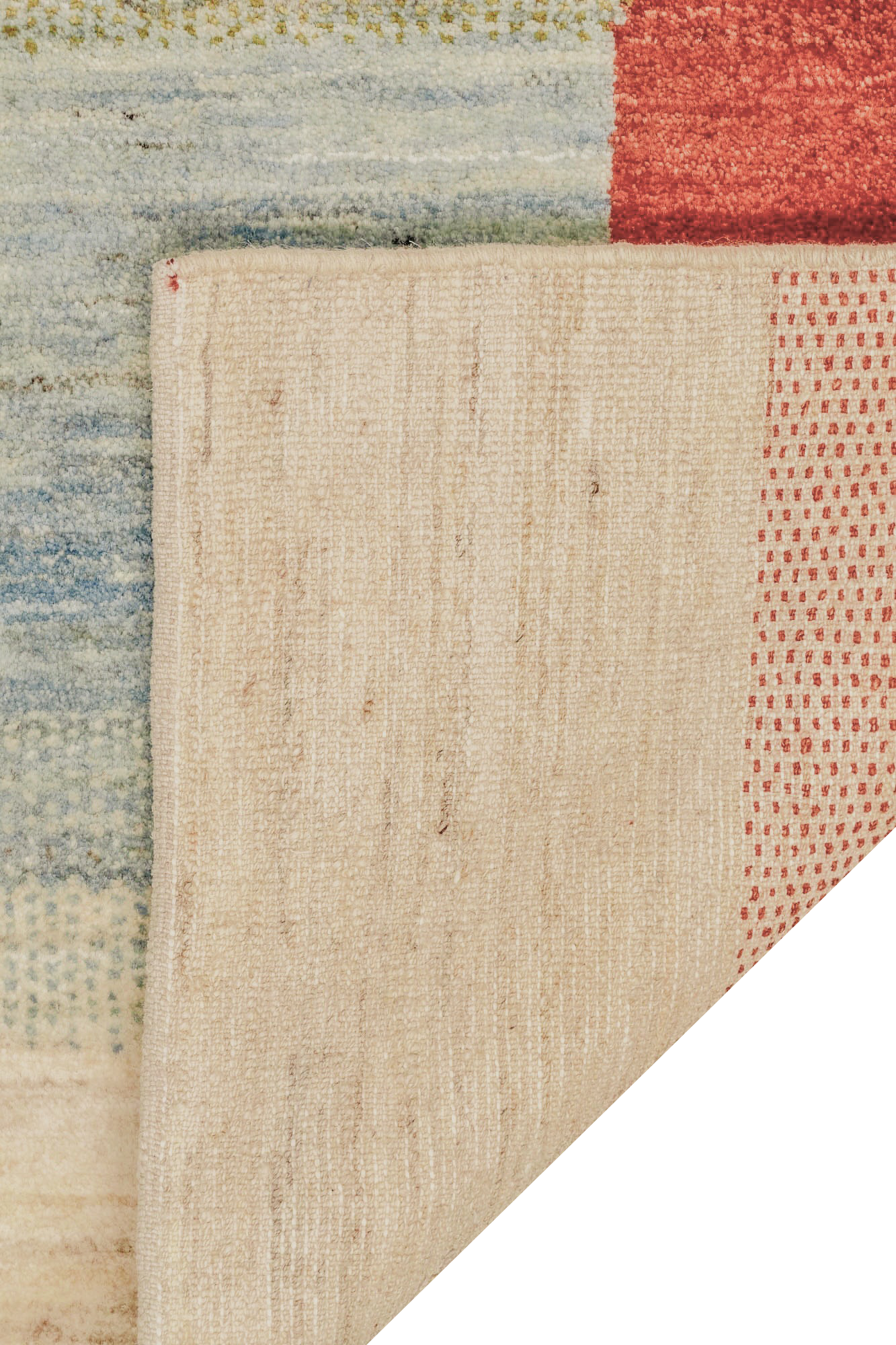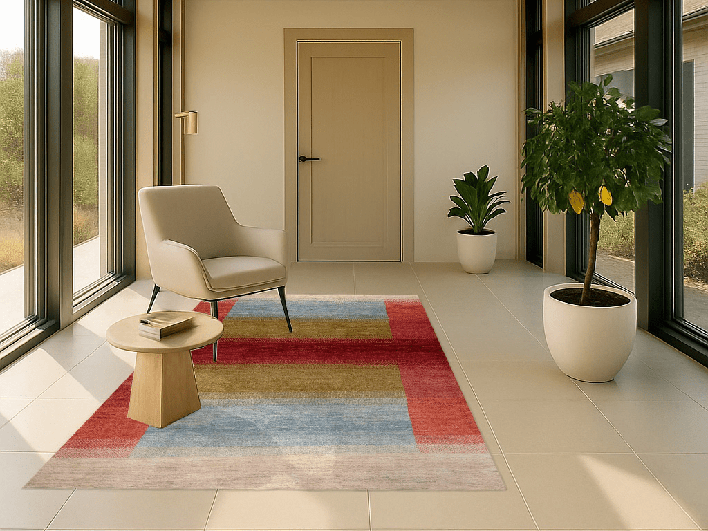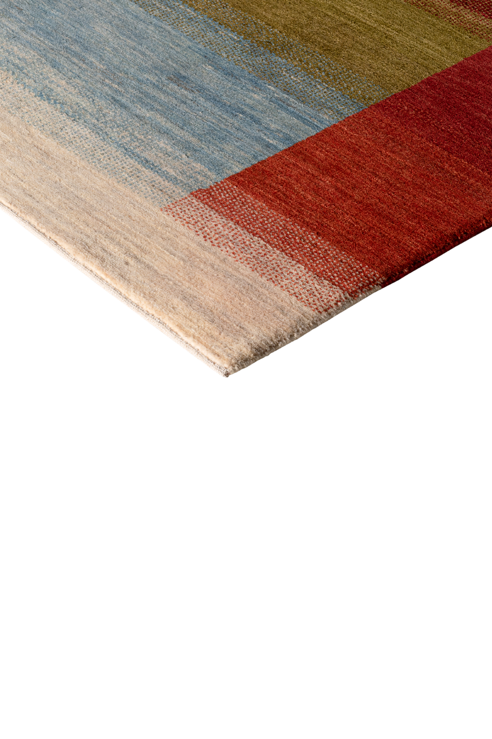 Der Gabbeh-Teppich „Lichtspiel“ verwebt Horizonte und Übergänge zu einem poetischen Farbspiel. Handgeknüpft aus reiner Schurwolle, leuchten in diesem Unikat warme Rottöne, erdiges Olivgrün, weiches Himmelblau und cremiges Naturweiß in harmonischer Balance. Jeder Farbstreifen fließt sanft in den nächsten über – wie ein flirrendes Lichtspiel am Horizont.