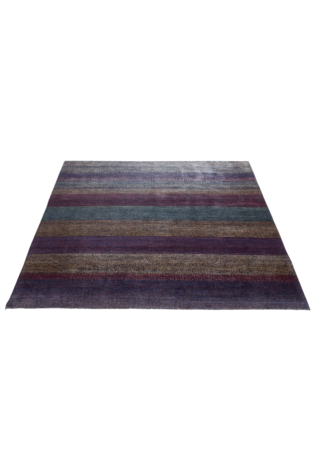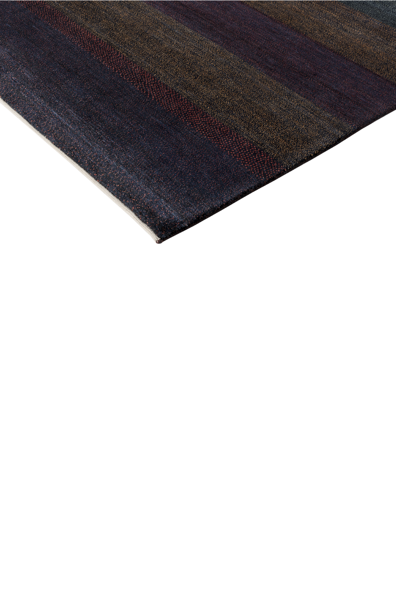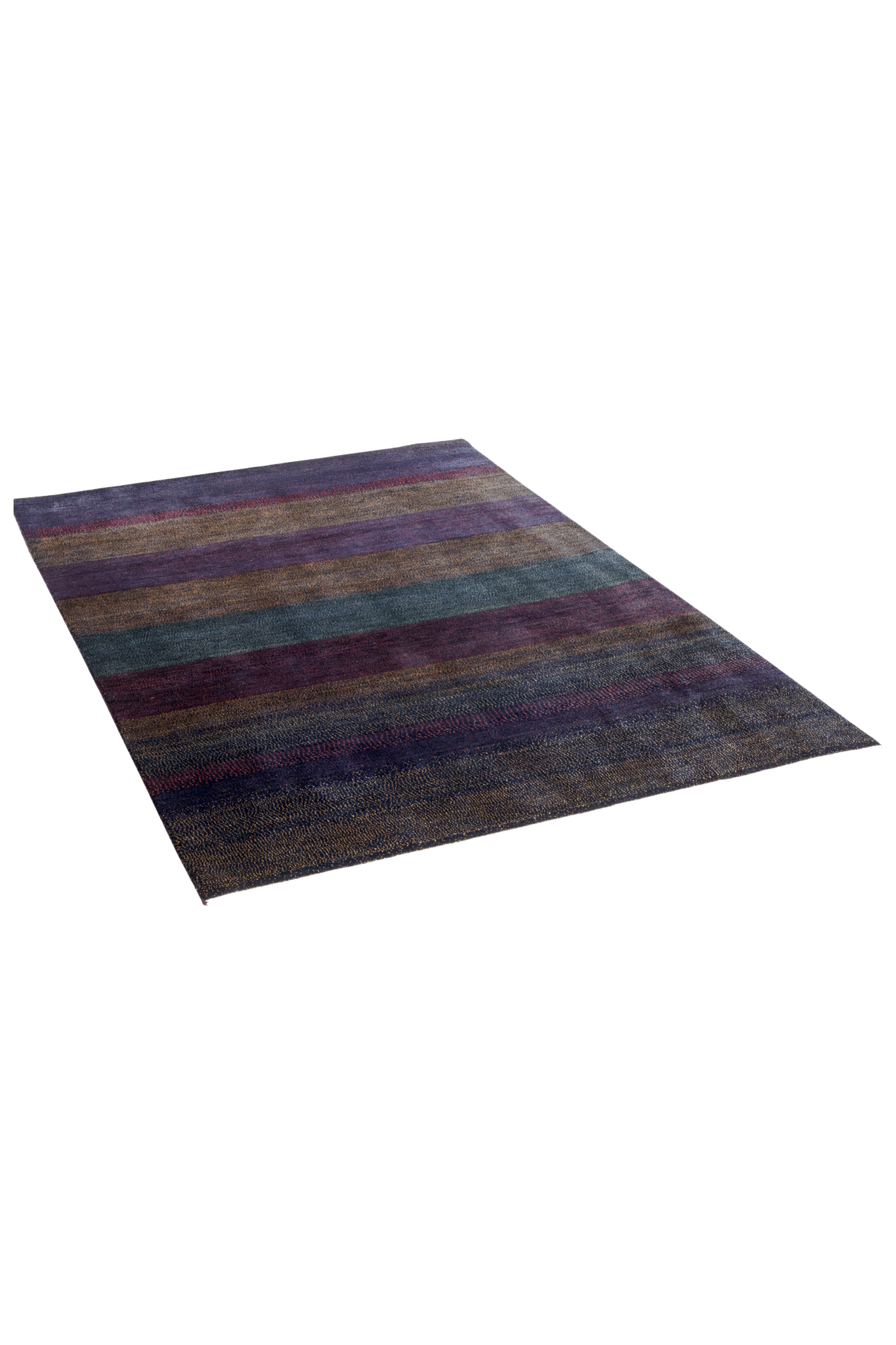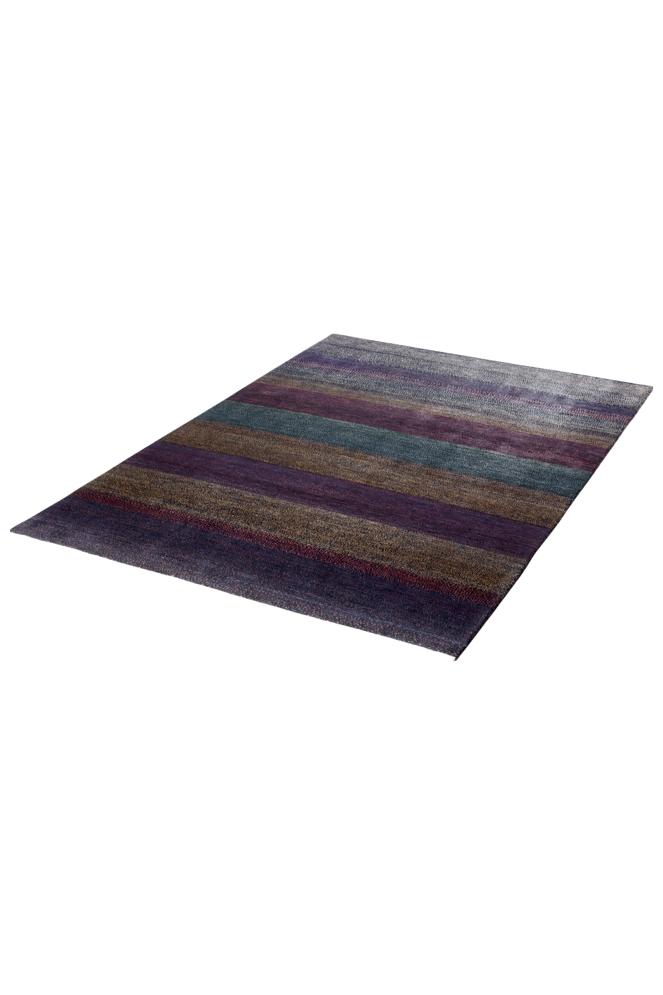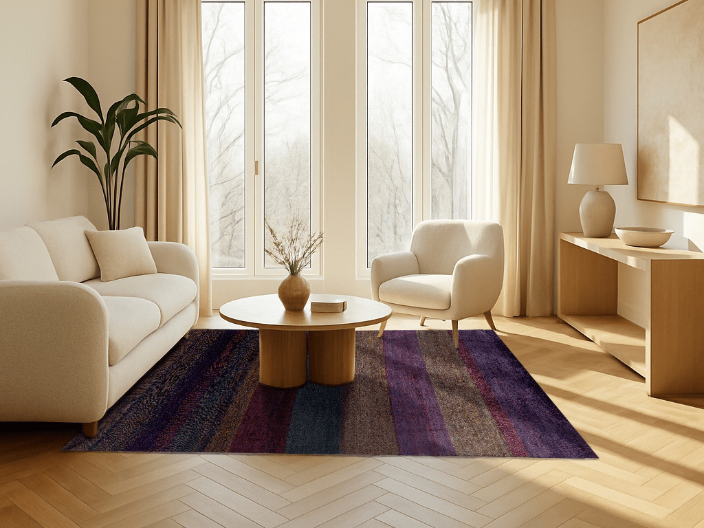 Dunkelviolett, tiefes Indigo, Bordeauxrot und moosiges Grün fügen sich in sanften Streifen zu einer Melodie aus Farbe und Gefühl. „Nachtklang“ wirkt wie eine nächtliche Landschaft, in der alles zur Ruhe kommt – ein Teppich, der nicht laut gestaltet ist, sondern durch seine Tiefe spricht. Jeder Streifen ist wie ein Ton, jede Nuance ein Klang im Dunkeln.