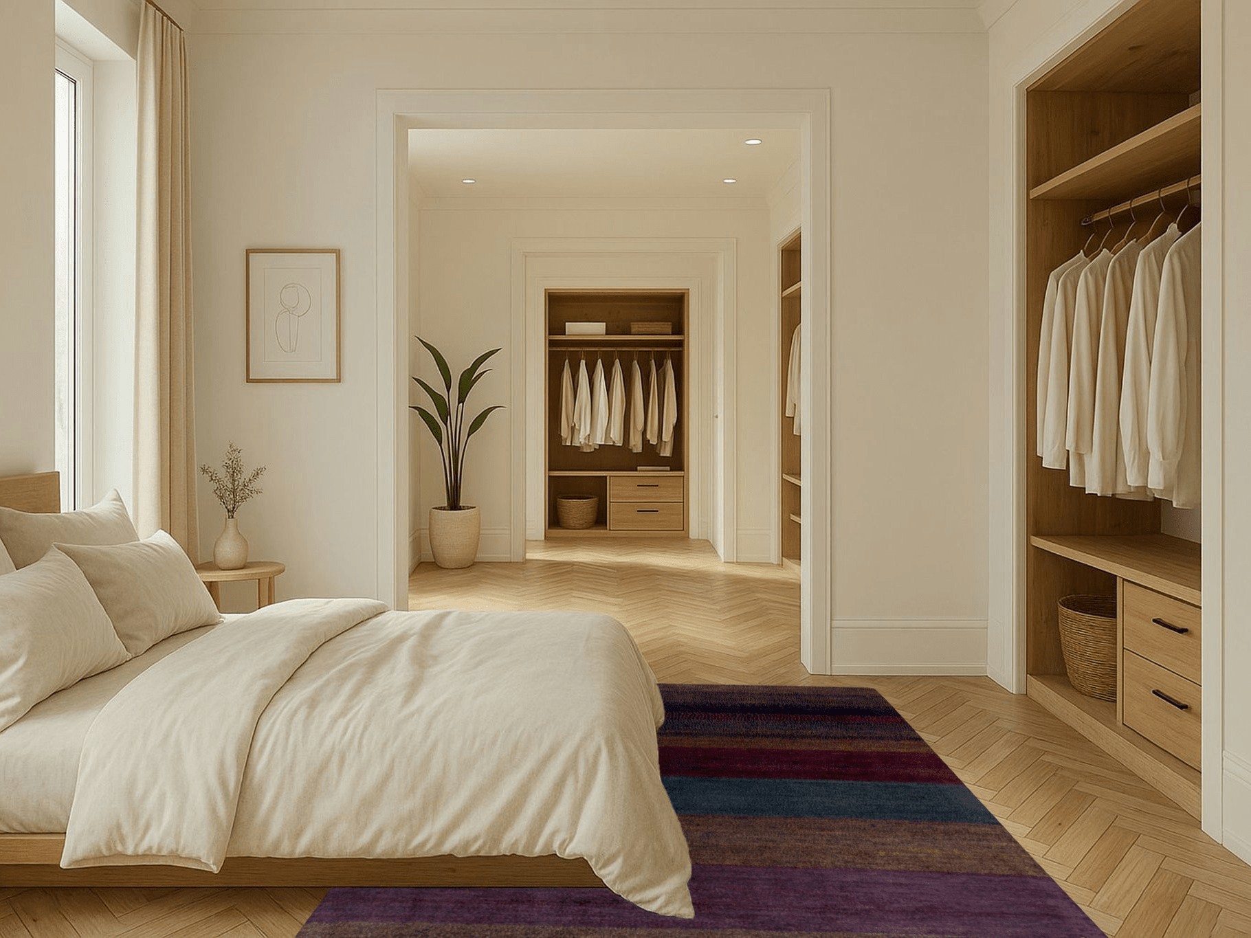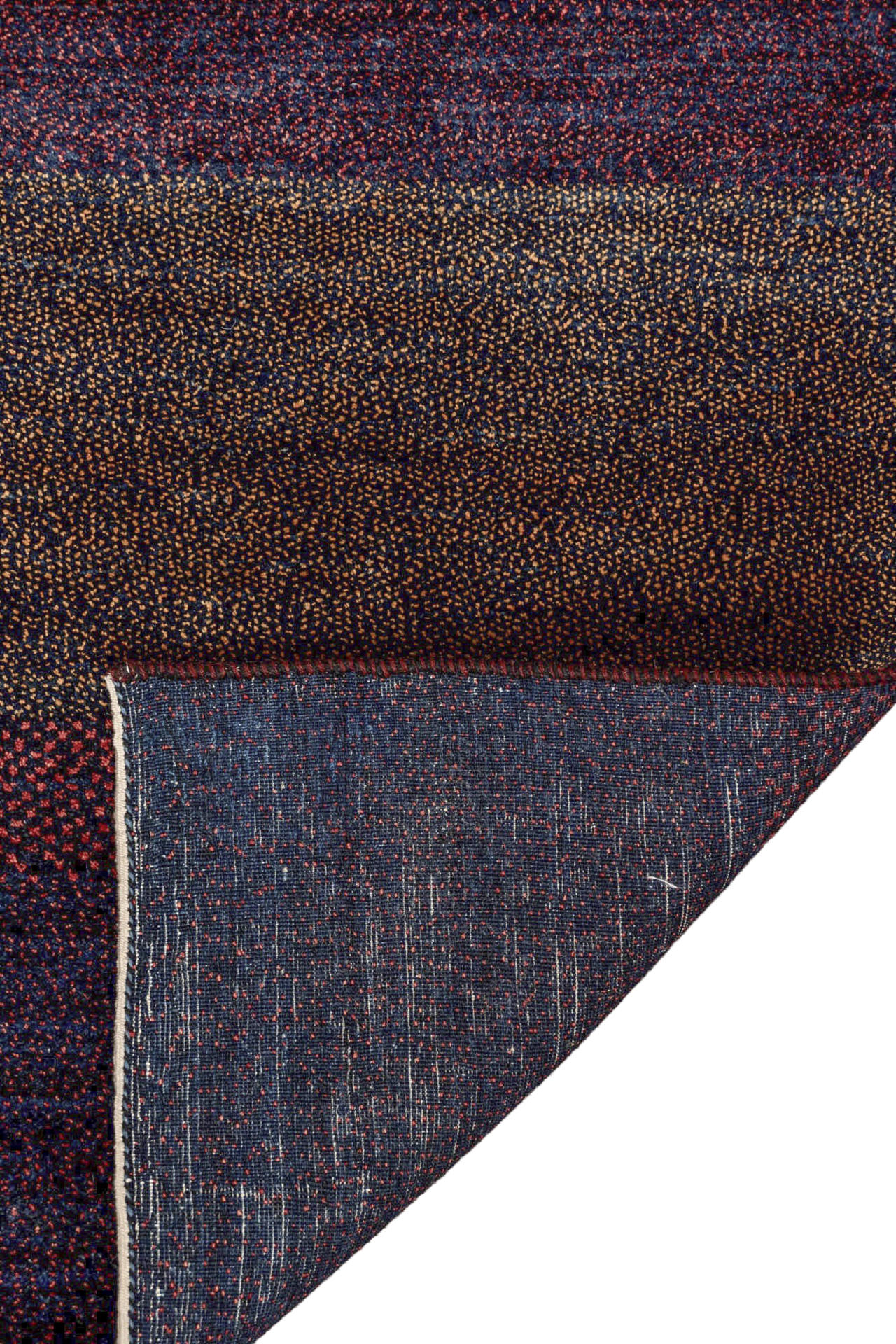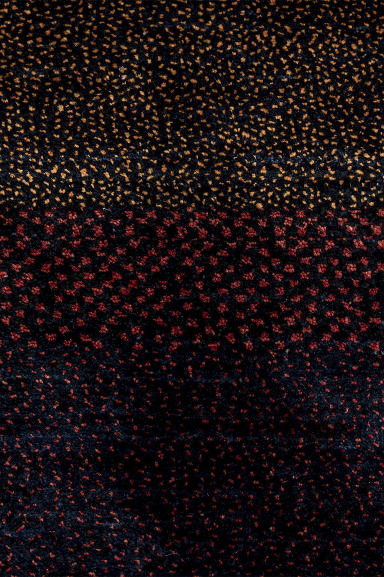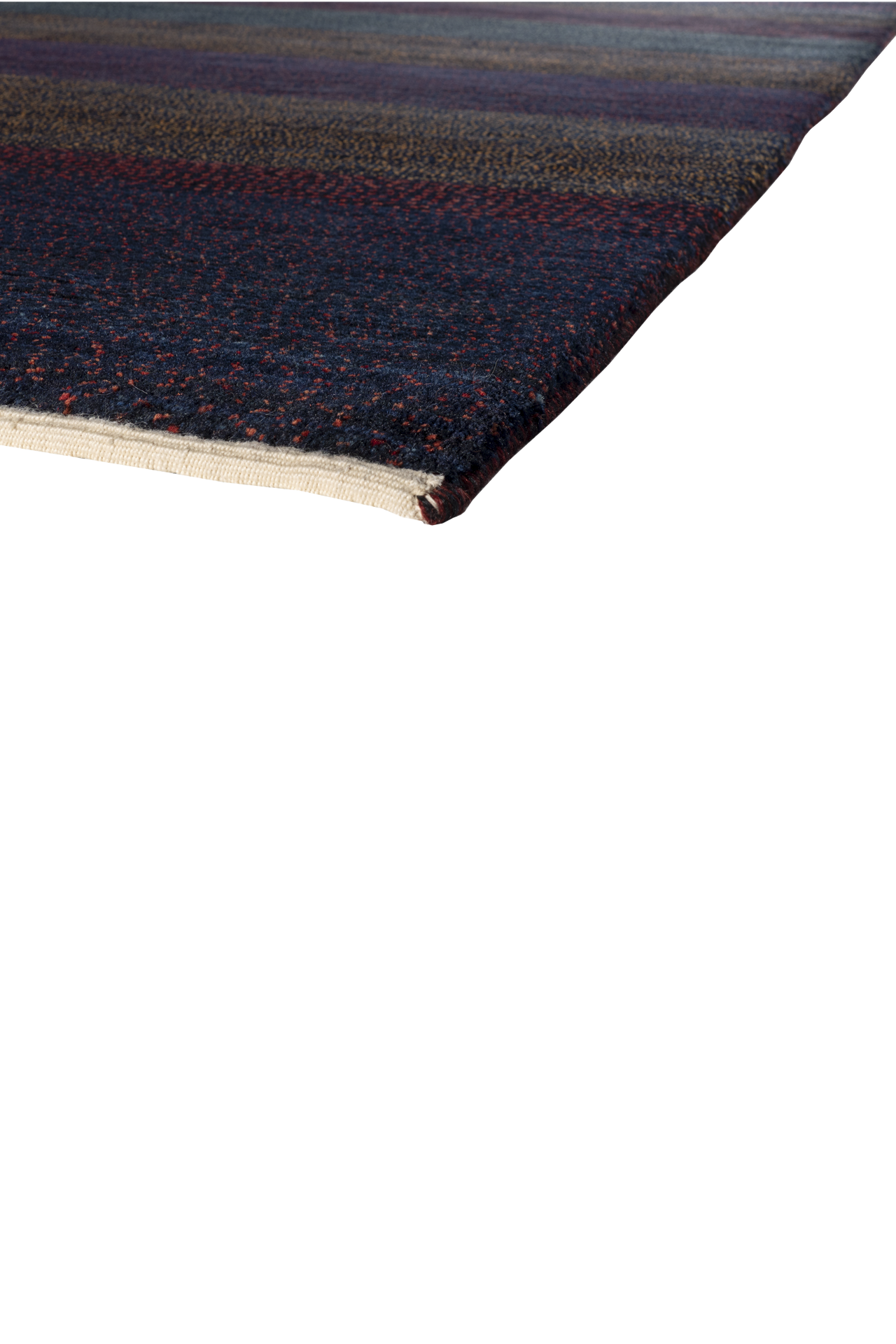 Dunkelviolett, tiefes Indigo, Bordeauxrot und moosiges Grün fügen sich in sanften Streifen zu einer Melodie aus Farbe und Gefühl. „Nachtklang“ wirkt wie eine nächtliche Landschaft, in der alles zur Ruhe kommt – ein Teppich, der nicht laut gestaltet ist, sondern durch seine Tiefe spricht. Jeder Streifen ist wie ein Ton, jede Nuance ein Klang im Dunkeln.