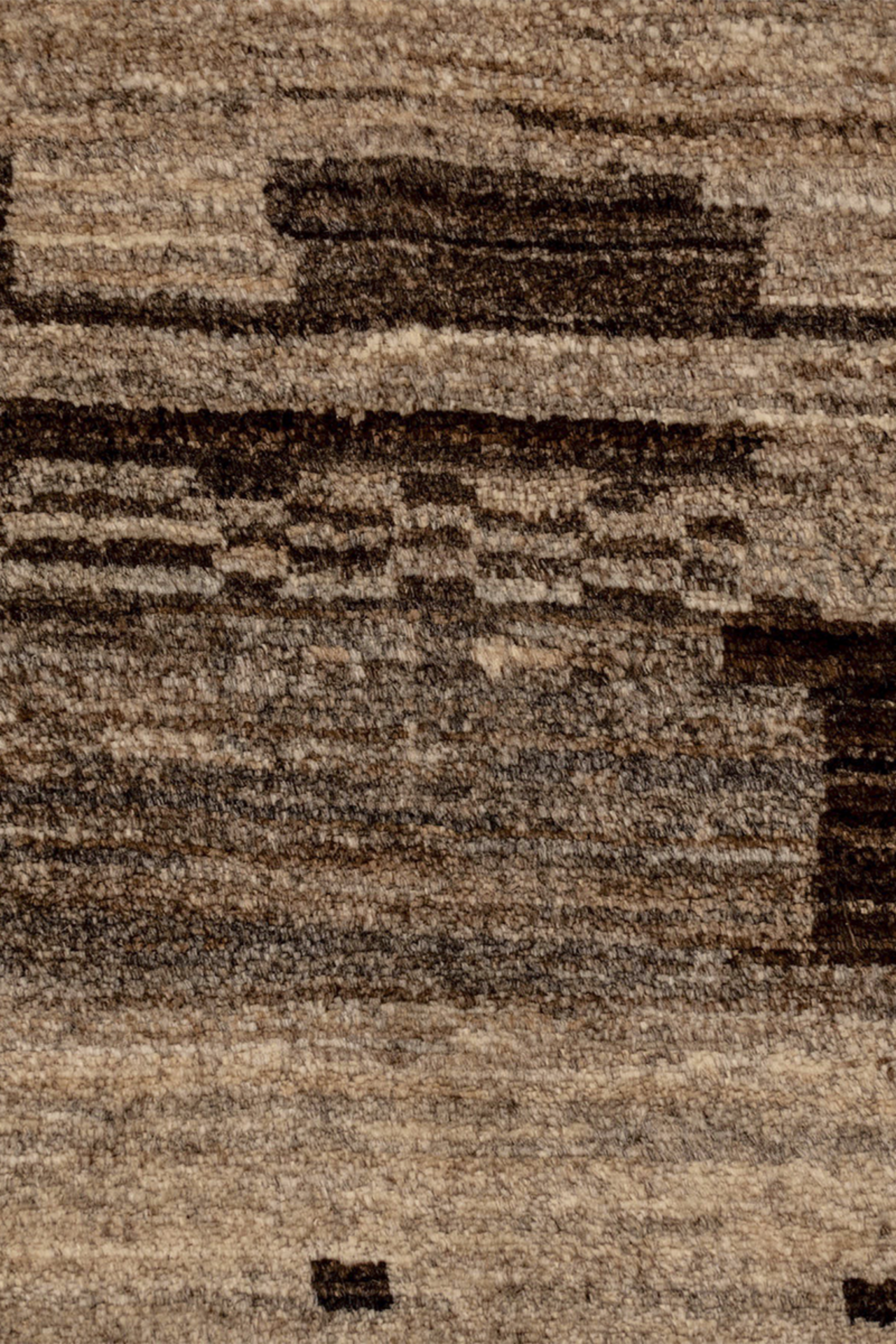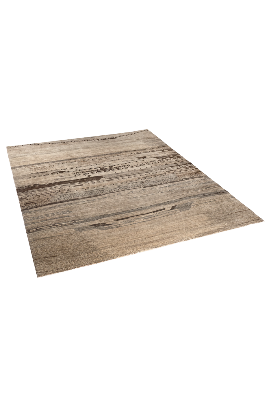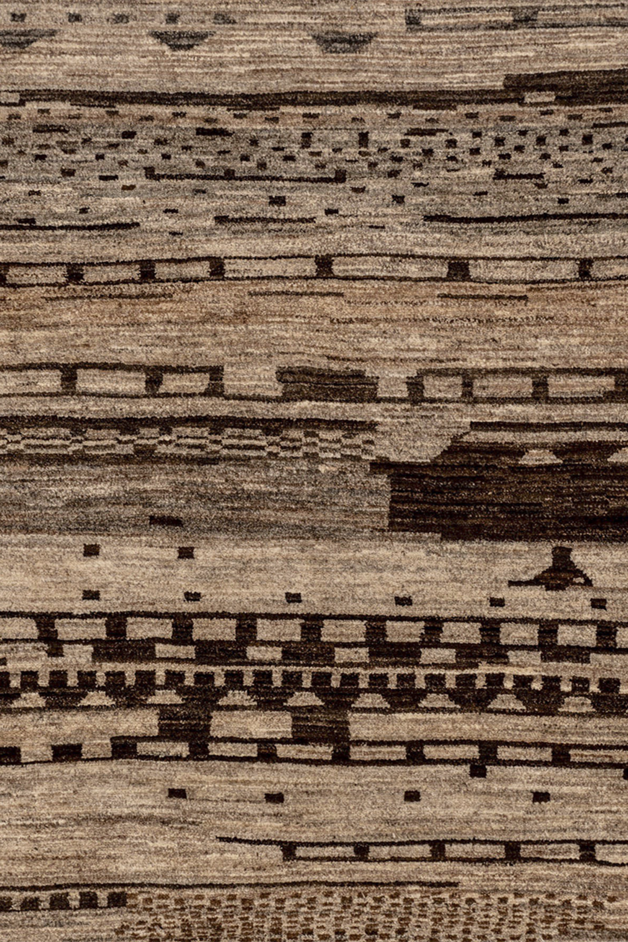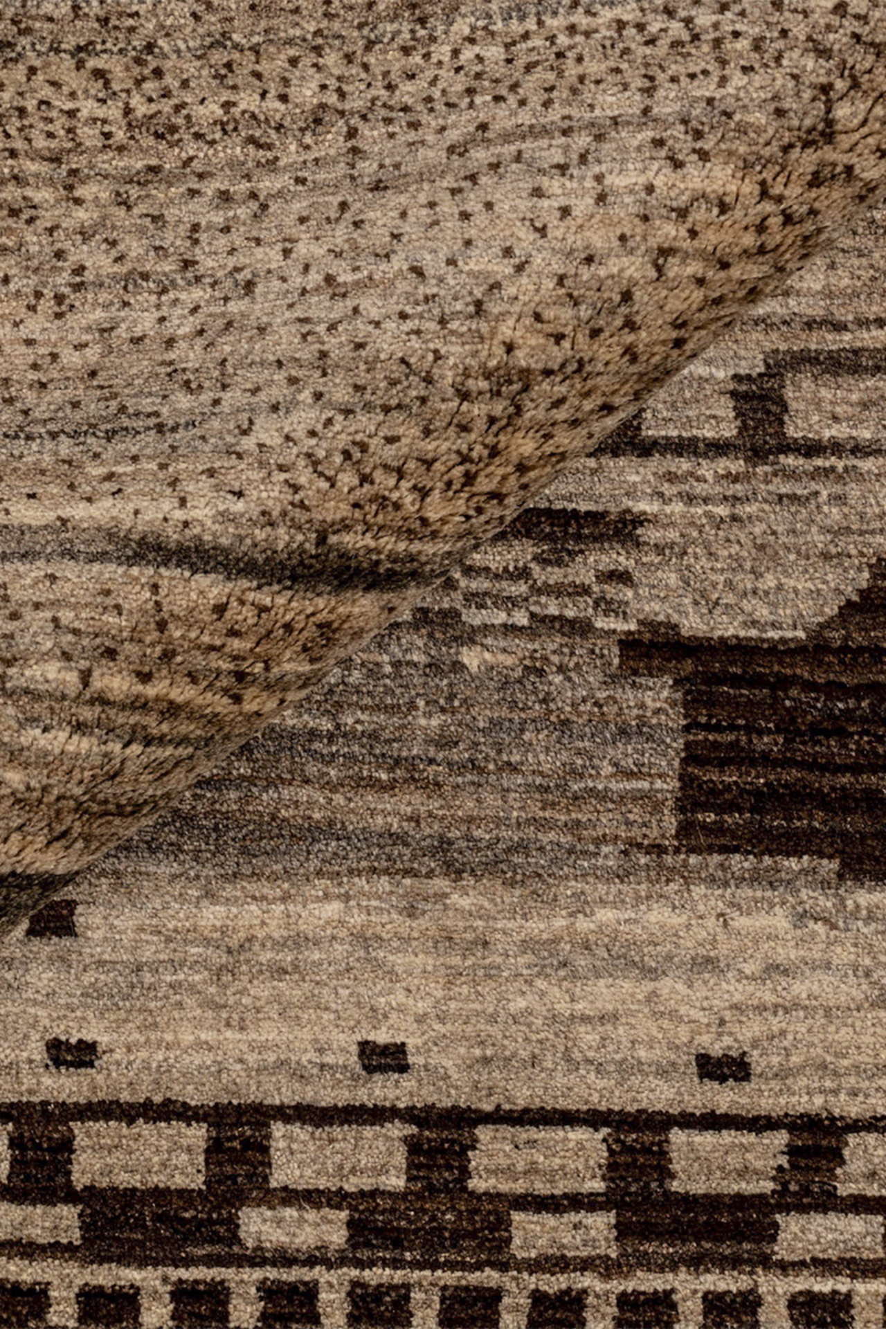 Die Wolle bleibt in ihrem ursprünglichen Farbspiel: von hellem Wollweiß bis zu erdigem Braun, mit all den feinen Zwischennuancen, die nur natürliche Wolle kennt. So entsteht ein Teppich, der nicht nur Wärme und Struktur in den Raum bringt, sondern auch eine Verbindung zur Landschaft und zum nomadischen Ursprung.