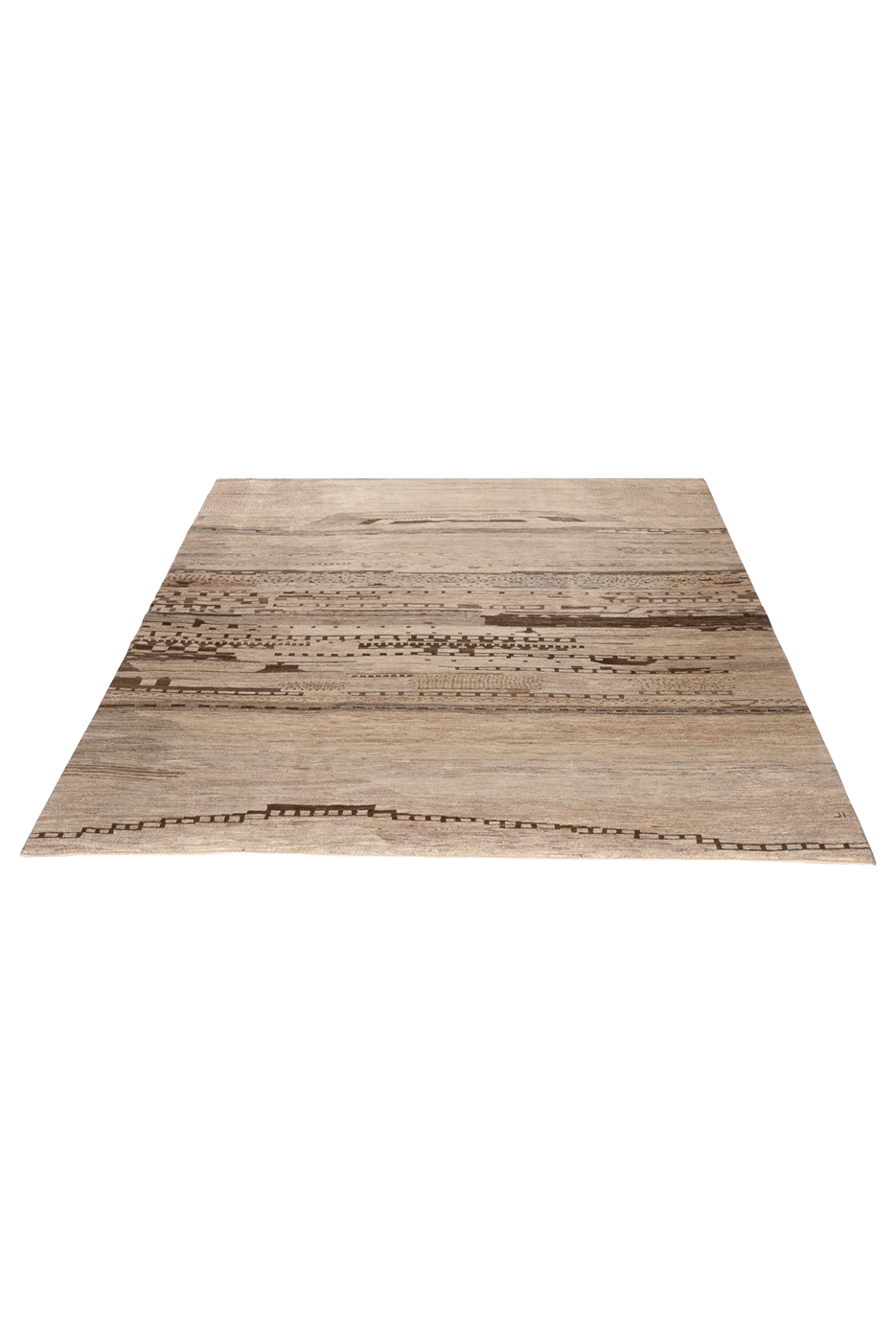 Der Teppich „Nomadenspuren“ ist ein archaisches Meisterwerk. Aus ungefärbter, naturbelassener Schurwolle geknüpft, erzählt er in Linien, Rechtecken und Punktstrukturen von uralten Pfaden, Behausungen und Landschaftsformen. Die Muster wirken wie Luftaufnahmen von Feldern und Dörfern, wie Spuren im Boden – abstrahiert, grafisch, sinnlich.