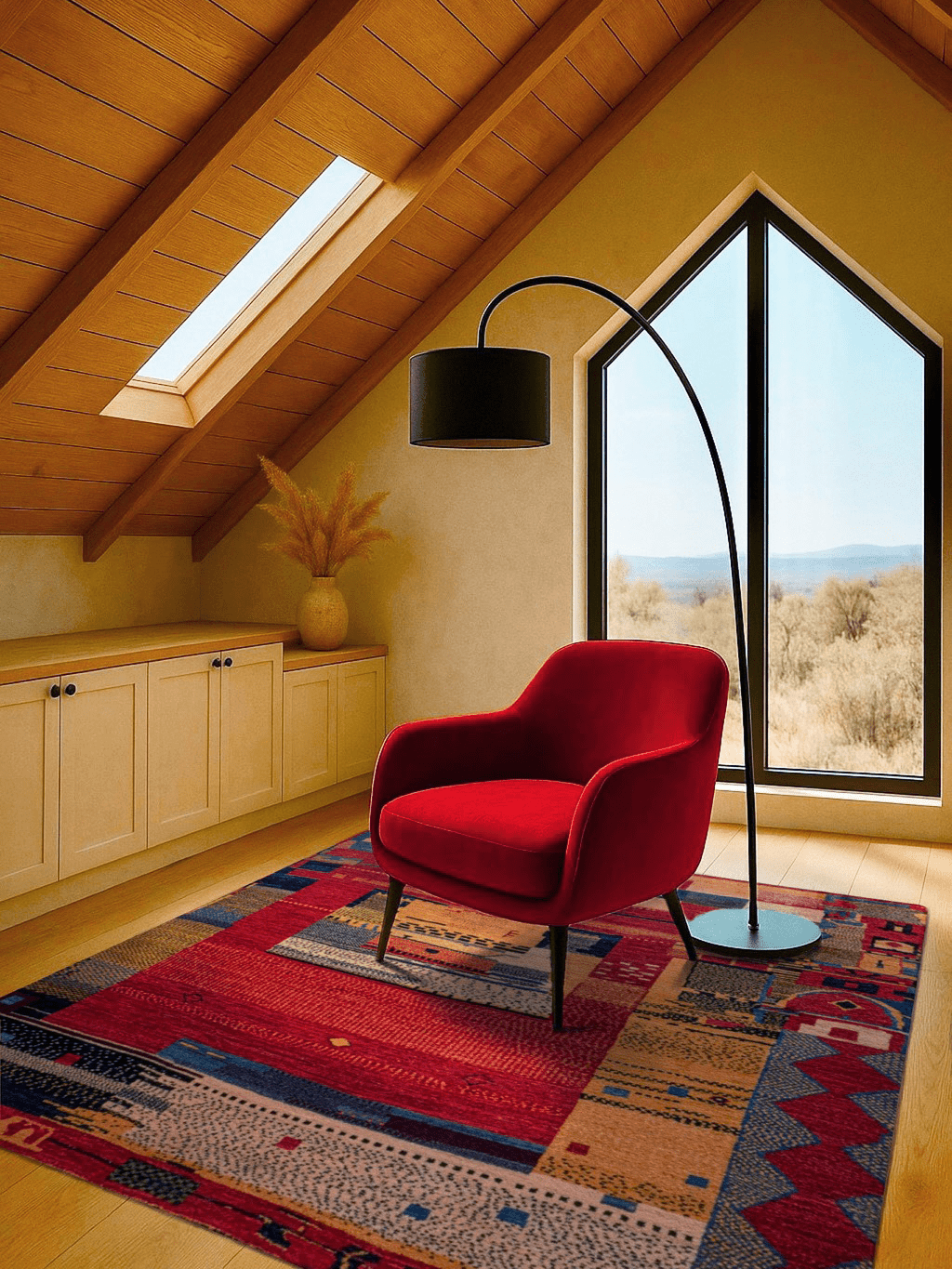 „Stadt der Muster“ ist ein handgeknüpfter Gabbeh-Teppich, der an eine archaische Stadtlandschaft erinnert – voller verwinkelter Gassen, farbiger Mosaike und symbolischer Architektur. In warmen Rottönen, Gold, Indigo und Beige komponiert, wirkt er wie eine gewebte Landkarte der Fantasie. Jeder Abschnitt erzählt von Nomadenkultur, alten Ornamenten und der freien Hand der Knüpfkunst. Das Unikat wurde aus feinster Hochlandwolle gefertigt – naturbelassen, von Hand versponnen und pflanzlich gefärbt. Der dichte Flor sorgt für außergewöhnliche Haptik und Langlebigkeit. Ein Teppich, der künstlerisch wie ethnisch inspiriert ist und jedem Raum einen ausdrucksstarken, individuellen Charakter verleiht.