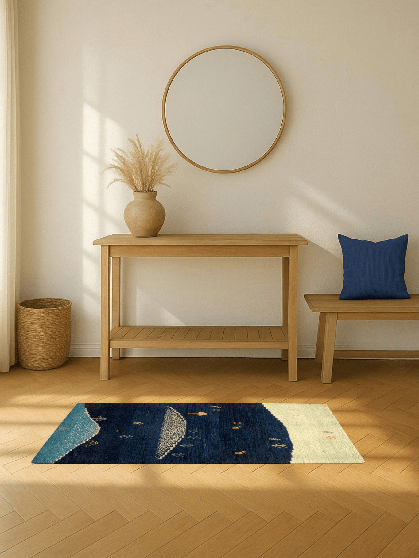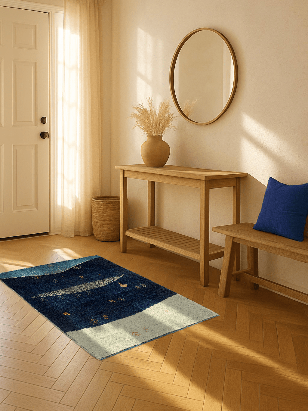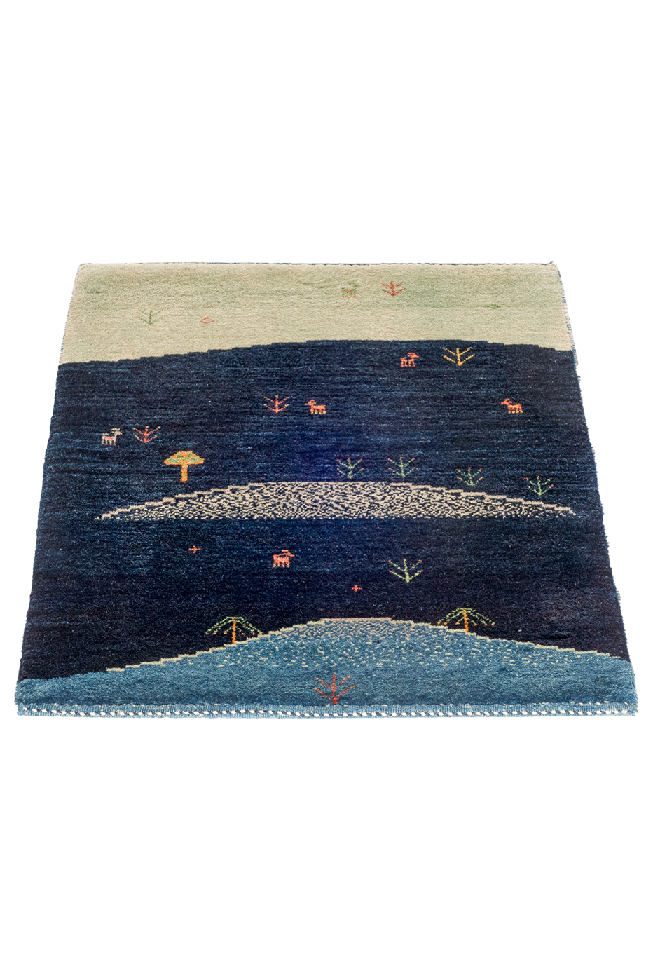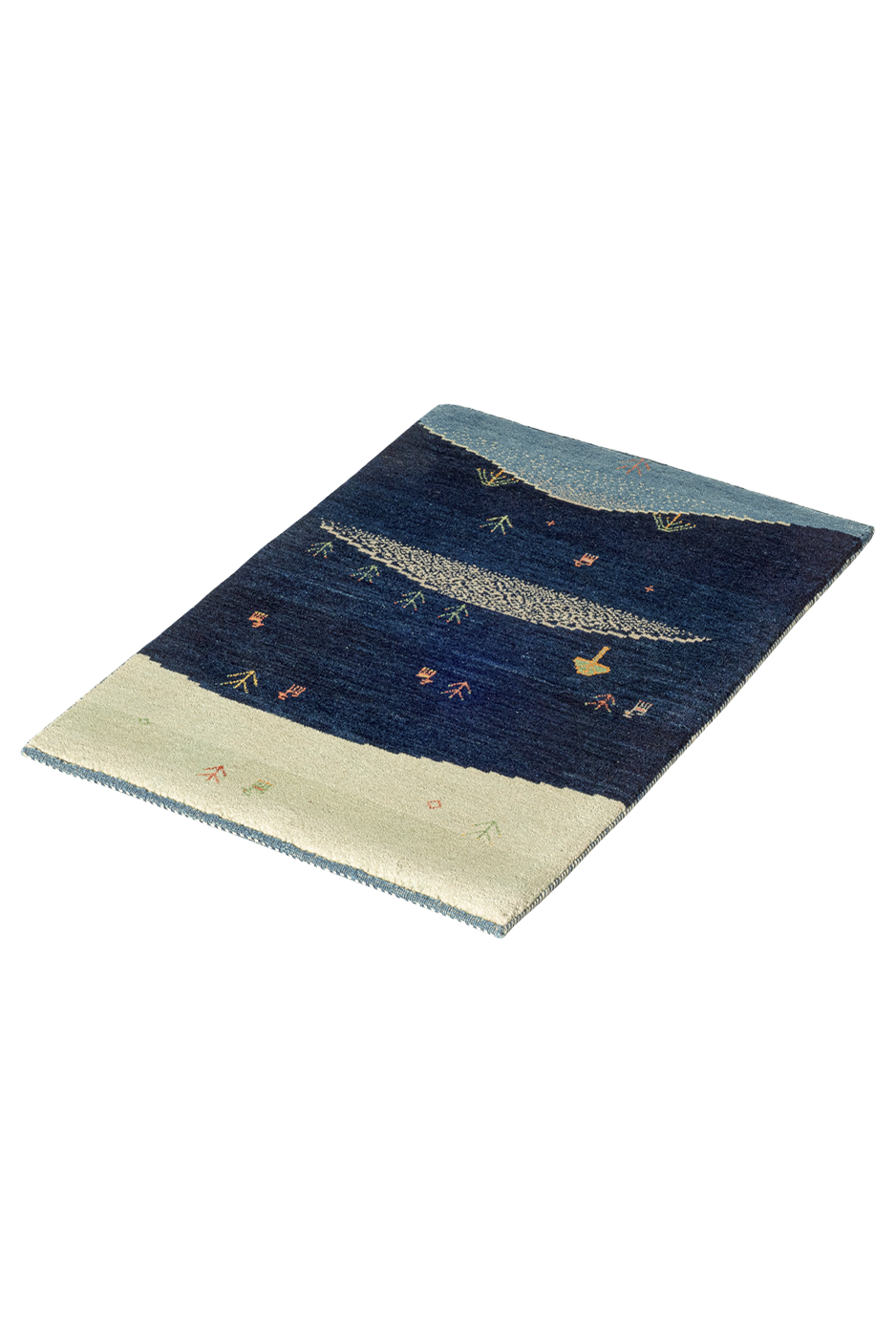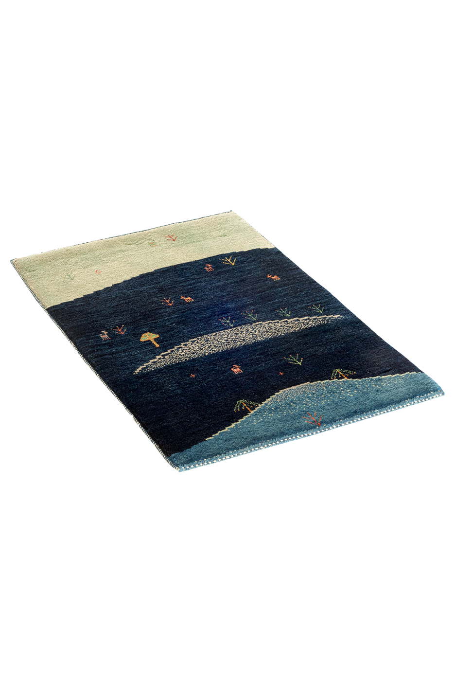 Wie eine stille Erzählung aus der Steppe entfaltet sich der Teppich „Sternenweide“ in leuchtenden Blautönen – von tiefem Mitternachtsblau über Nachtgrün bis hin zu hellem Horizontlicht. Hügelartig abgestuft, mit kleinen Tierfiguren, Pflanzen und einem stilisierten Baum, wirkt das Bild wie eine friedliche Weidelandschaft im Schutz der Nacht.