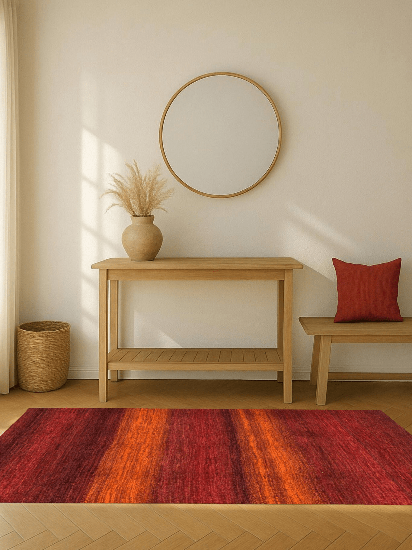 Sunlights ist ein ausdrucksstarkes Teppichunikat, das in leuchtenden Nuancen von Kupferrot, Orange und Glutrot spielt. Der handgeknüpfte Nomadenteppich entfaltet durch seine satten Farben eine fast meditative Tiefe wie flimmernde Sonnenstrahlen, die auf eine warme Wüstenlandschaft treffen. In reiner Handarbeit gefertigt, trägt jeder Knoten die Handschrift seiner Knüpferinnen. Die verwendete Hochlandschurwolle stammt von Schafen, deren Wolle besonders fettreich, strapazierfähig und langlebig ist. Ungefärbte Fasern und natürliche Farbstoffe machen den Teppich zu einem nachhaltigen Begleiter ideal für Menschen mit Sinn für Ursprünglichkeit, Qualität und künstlerischen Ausdruck.