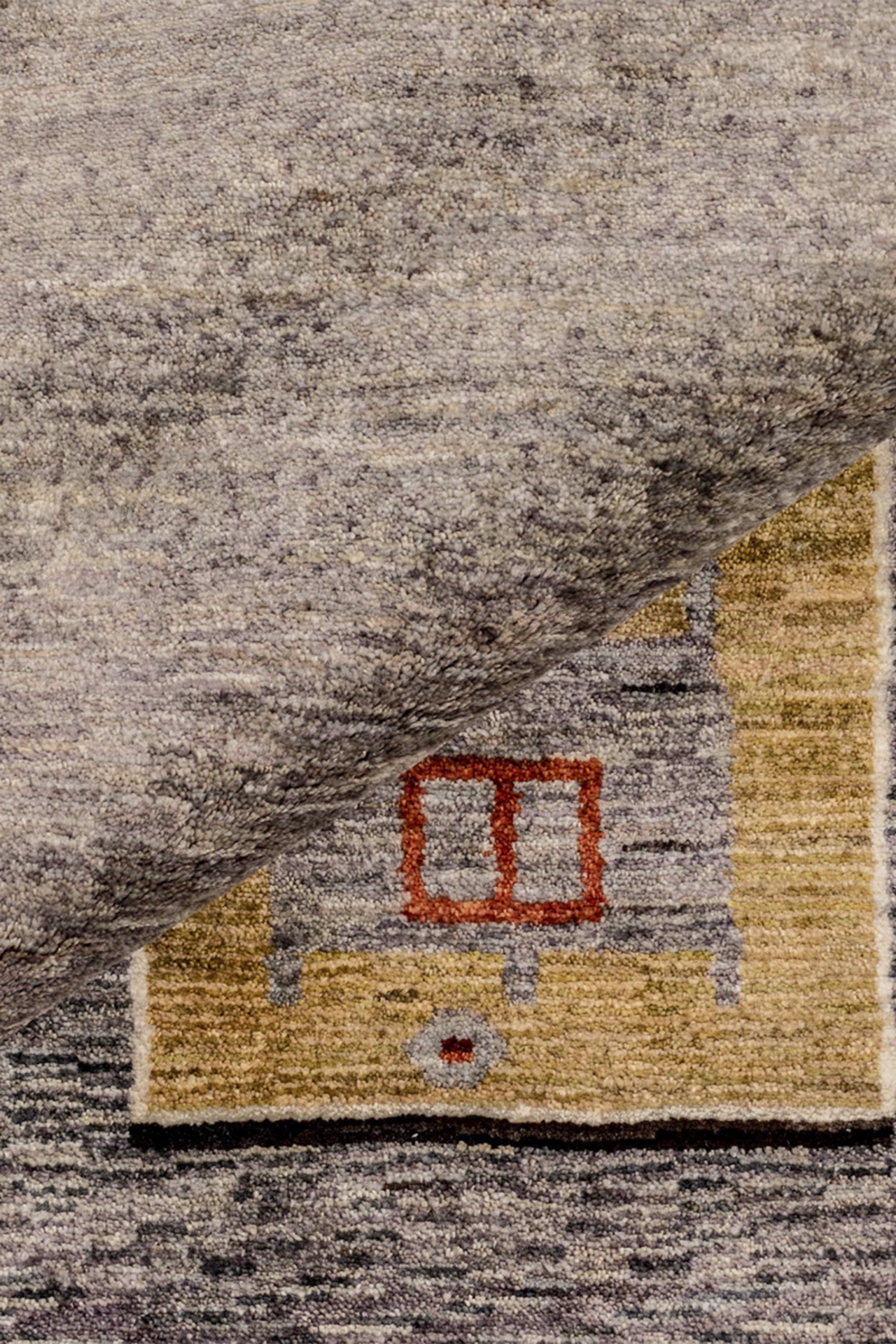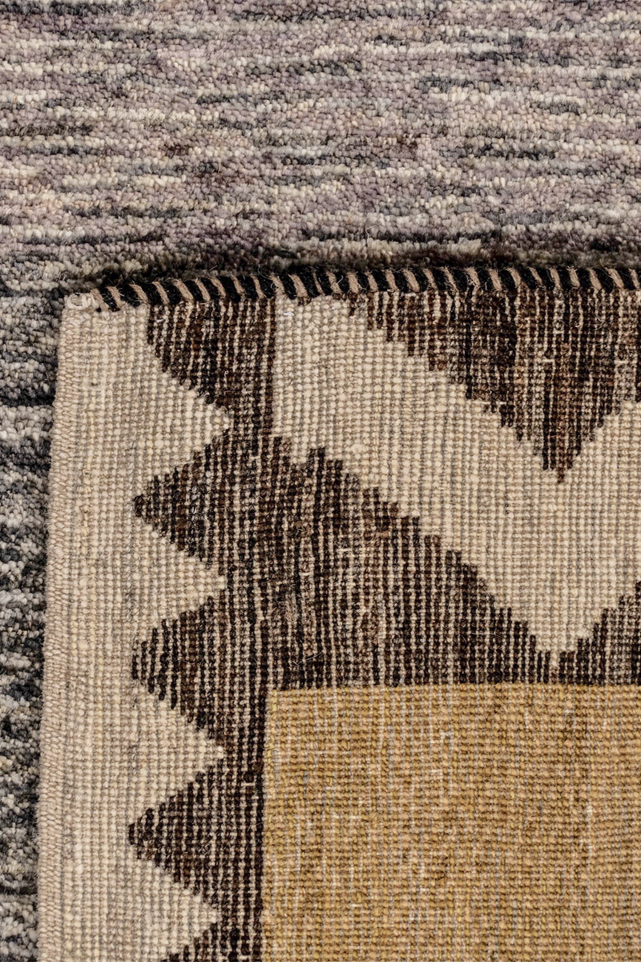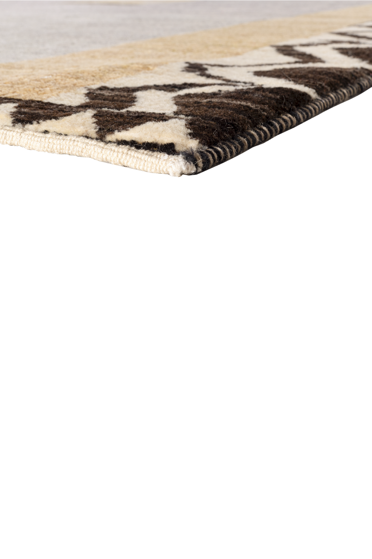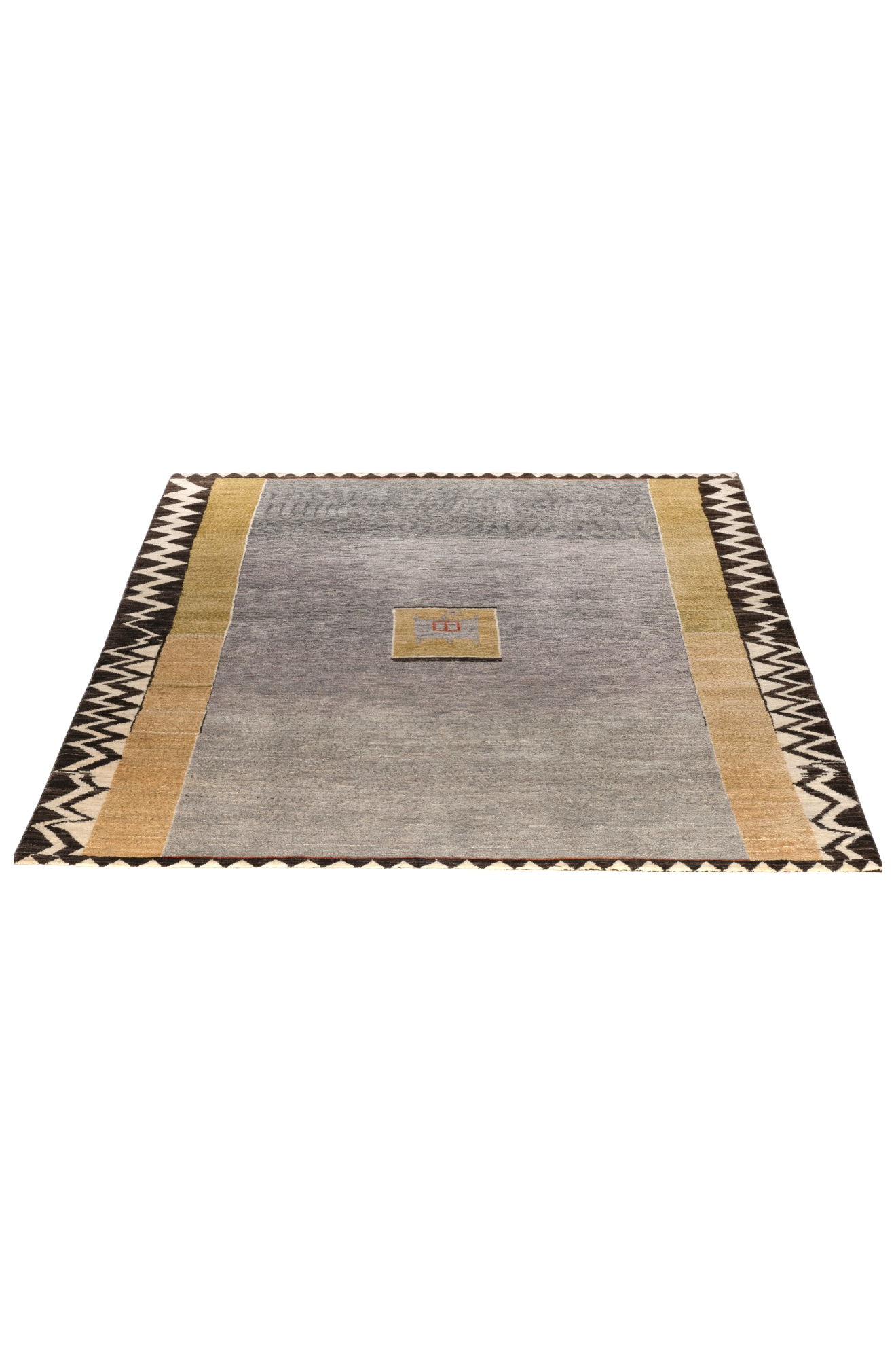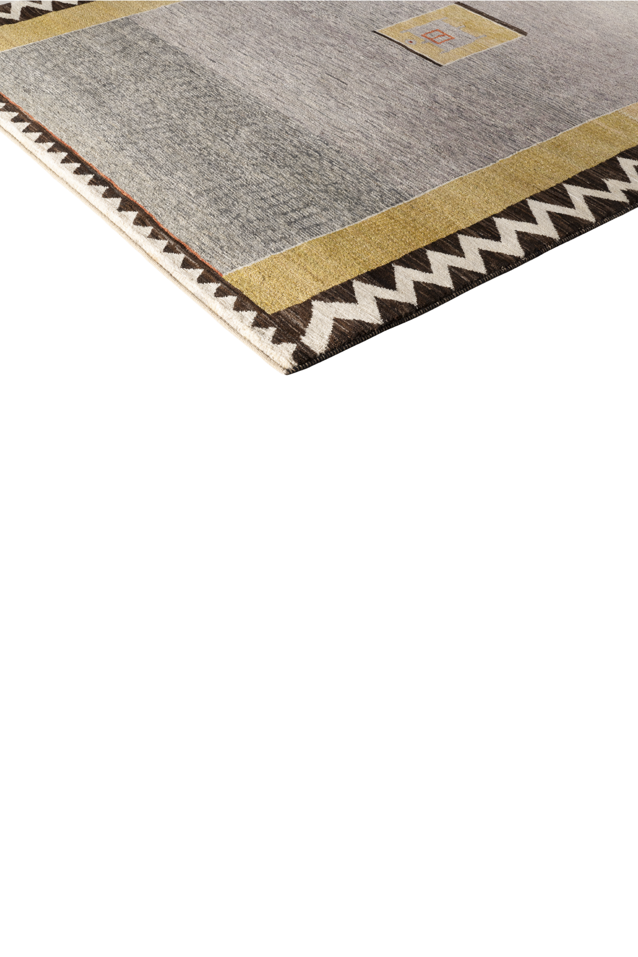 Der Teppich „Zeltlicht“ entfaltet eine besondere Ruhe: Das Zentrum in sanftem Grau wirkt wie eine klare Fläche, über der das Licht still steht. Der gerahmte Rand – in Sand, Schwarz und zackigen Formen – erinnert an gewebte Zeltwände, an Pfade, an Schutz. Das kleine Zeichenfeld in der Mitte ist wie ein leuchtender Punkt – wie eine Erinnerung oder ein Feuer, das glimmt.