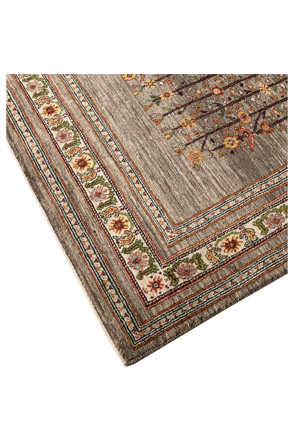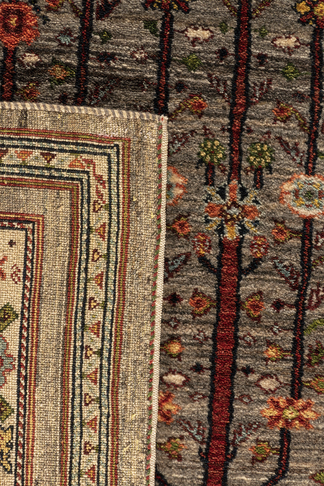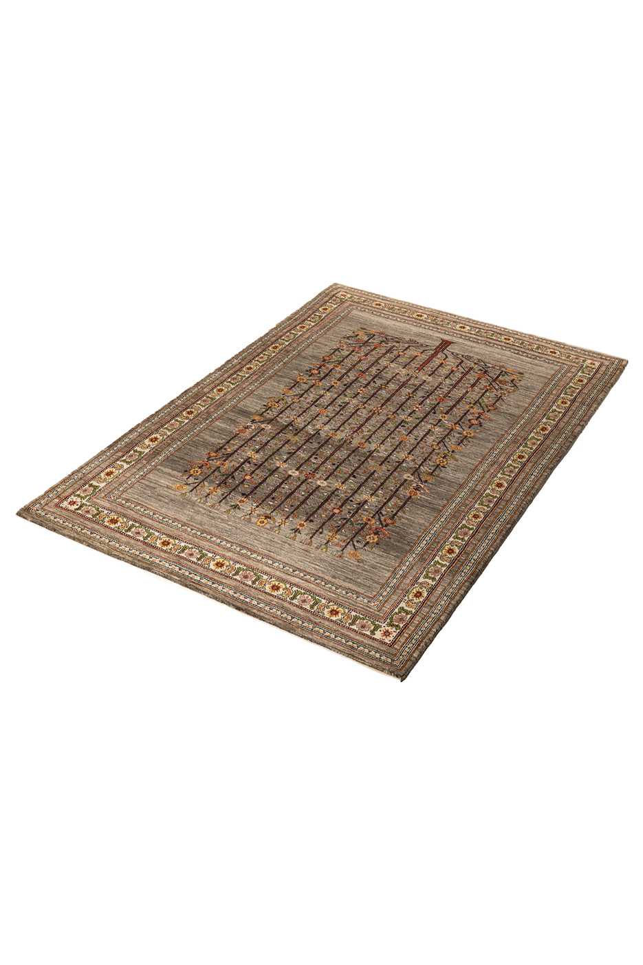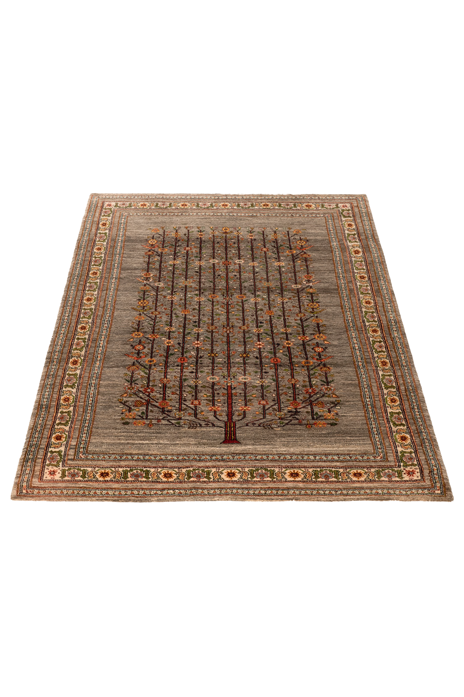 Dieser handgeknüpfte Nomadenteppich aus dem Süd-Iran zeigt einen prächtigen Lebensbaum in sanften gedämpften Naturfarben. Der Teppich besteht hauptsächlich aus naturbelassener Wolle in grauen und cremefarbenen Tönen, die ihm eine ruhige und elegante Ausstrahlung verleihen. Die Blumenranke in der Zierbürde rundet das Design harmonisch ab und unterstreicht die feine Handwerkskunst der Nomaden. Gefertigt aus hochwertiger, von Hand versponnener Schurwolle und gefärbt mit pflanzlichen Naturfarben, bietet der Teppich nicht nur Strapazierfähigkeit, sondern auch eine authentische und zeitlose Schönheit. Ein wahres Unikat, das die iranische Nomadenkunst in all ihrer Eleganz widerspiegelt.