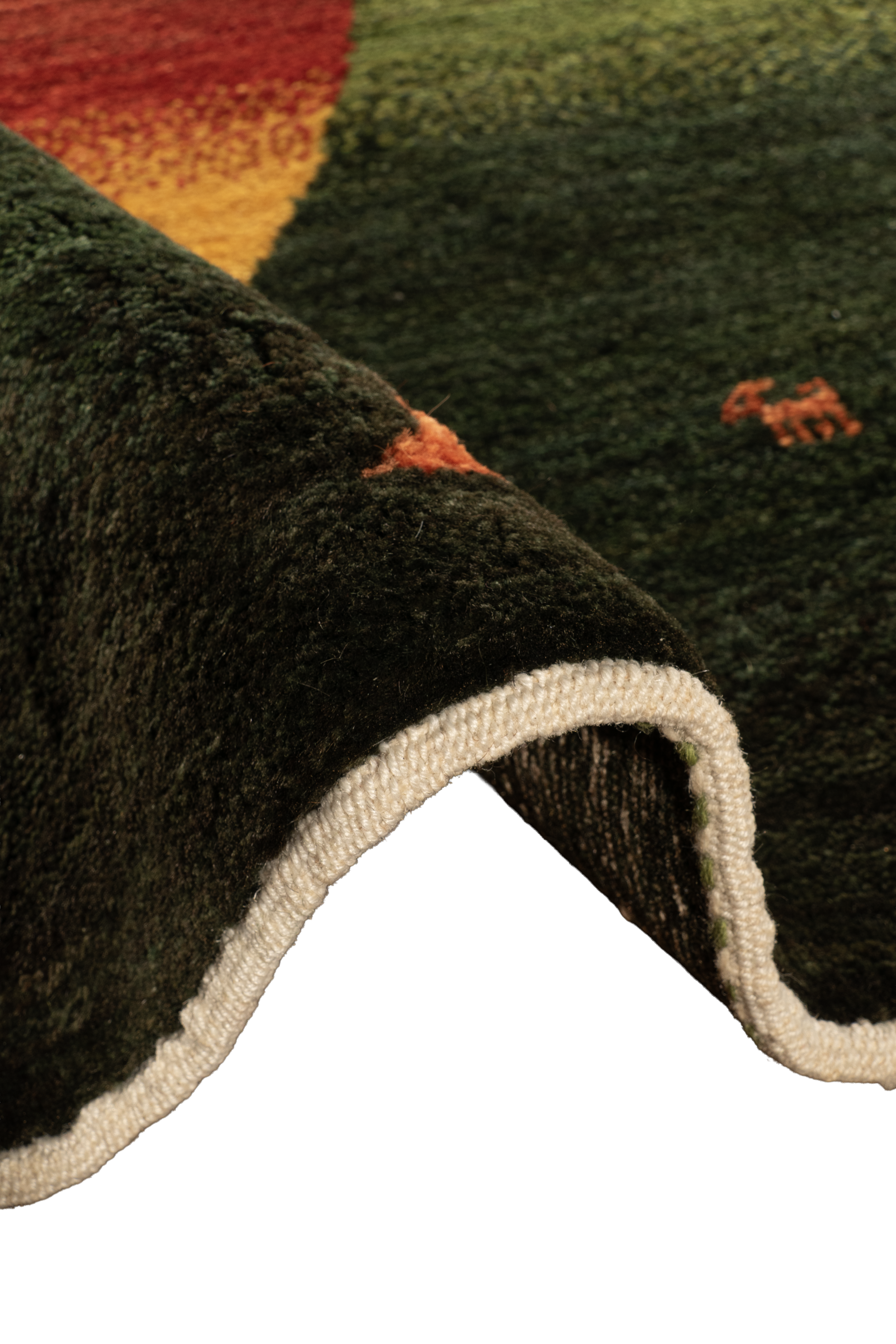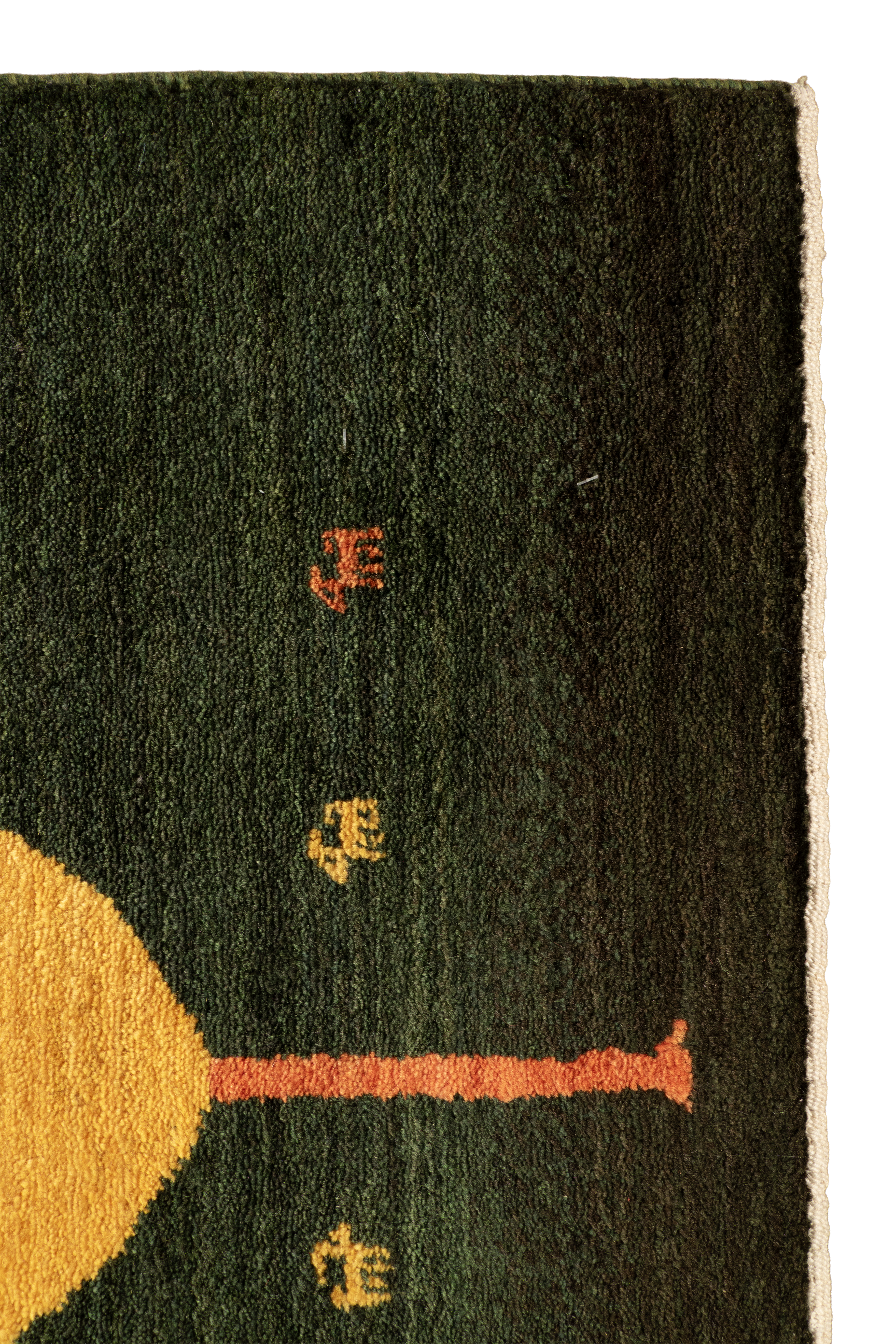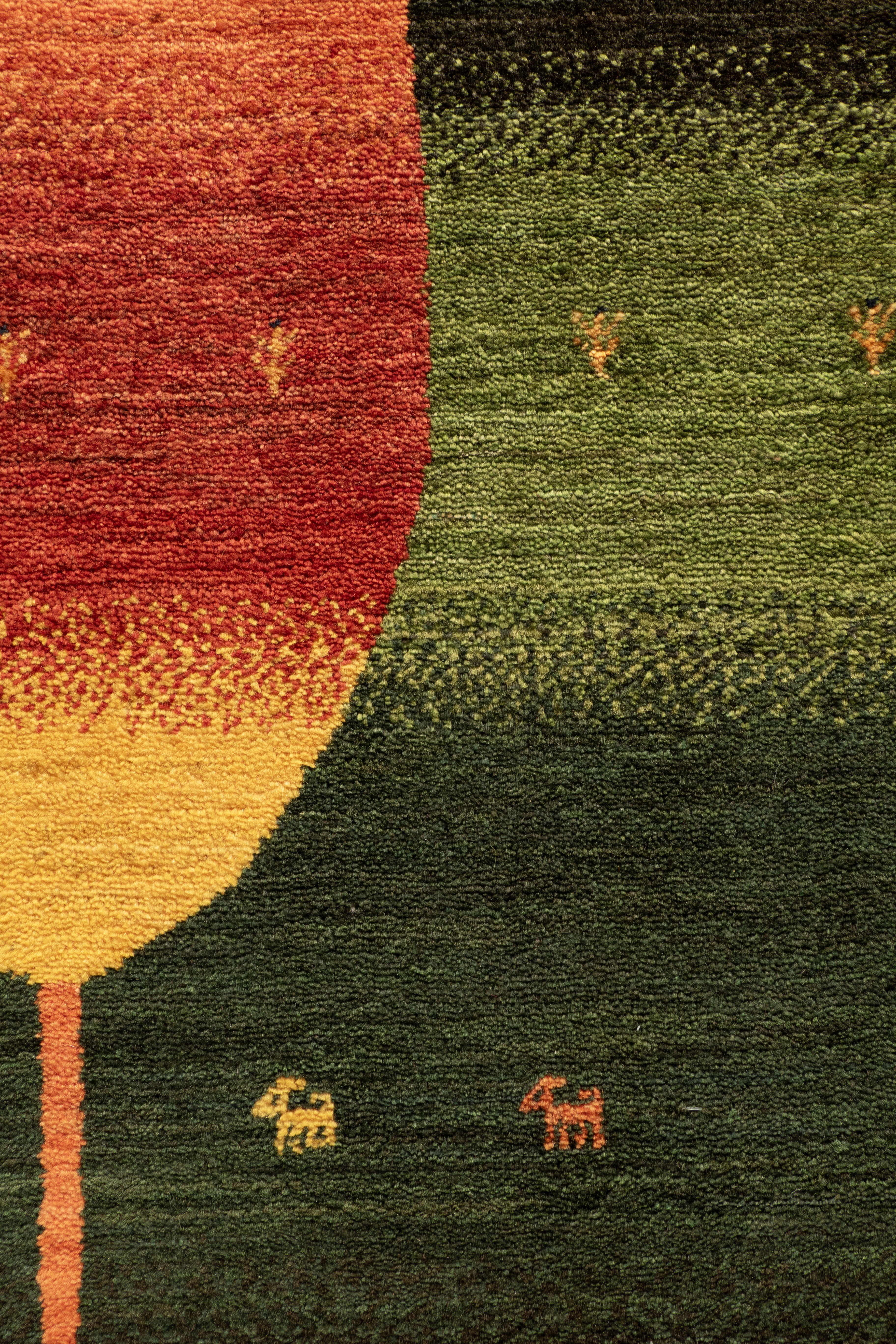 Der handgeknüpfte Gabbeh-Läufer „Sonnenzypresse“ zeigt ein ausdrucksstarkes Zypressenmotiv auf einem intensiv grün schattierten Grund. Die aufstrebende Form in leuchtendem Gelb, Orange und Rot erinnert an Sonnenwärme und symbolisiert im persischen Kulturraum Lebenskraft und Beständigkeit. Aus feinster Zagroswolle von Hand geknüpft und mit reinen Naturfarben gefärbt, verbindet dieses Nomadenunikat traditionelle Knüpfkunst mit moderner Strahlkraft – ideal für Flure, die ein starkes, ruhiges Statement setzen.