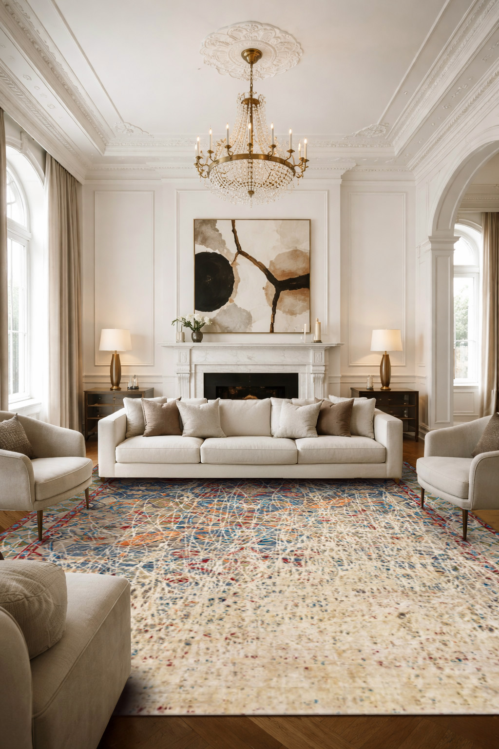 Das traditionelle Fundament wird jedoch bewusst durchbrochen: Ein wildes Geflecht aus weißen, über den Teppich gespritzten Linien sorgt für den charakteristischen „Tohuwabohu“-Effekt. Diese dynamischen, abstrakten Farbschlieren wirken wie spontane, energetische Bewegungen und lassen das antike Muster unter ihnen gleichzeitig erscheinen, verschwinden und wieder auftauchen. Dadurch entsteht ein faszinierender Dialog zwischen Vergangenheit und Gegenwart – opulent und rebellisch zugleich.