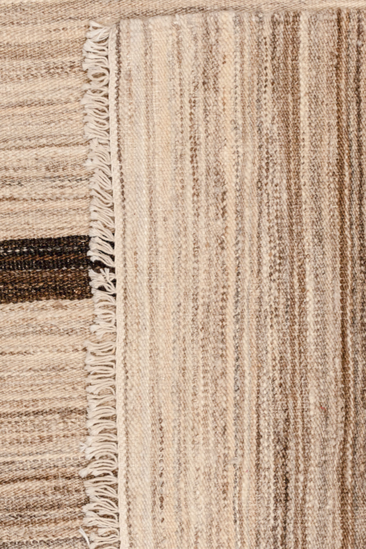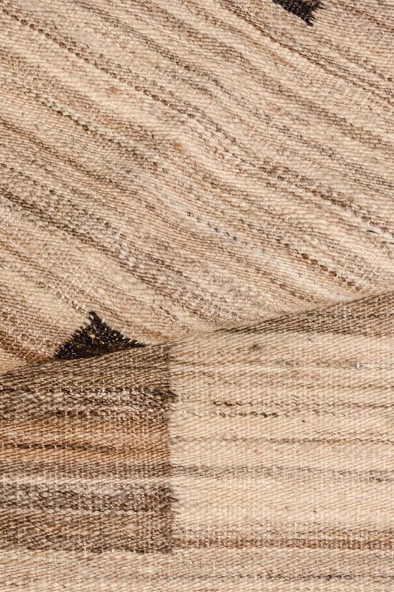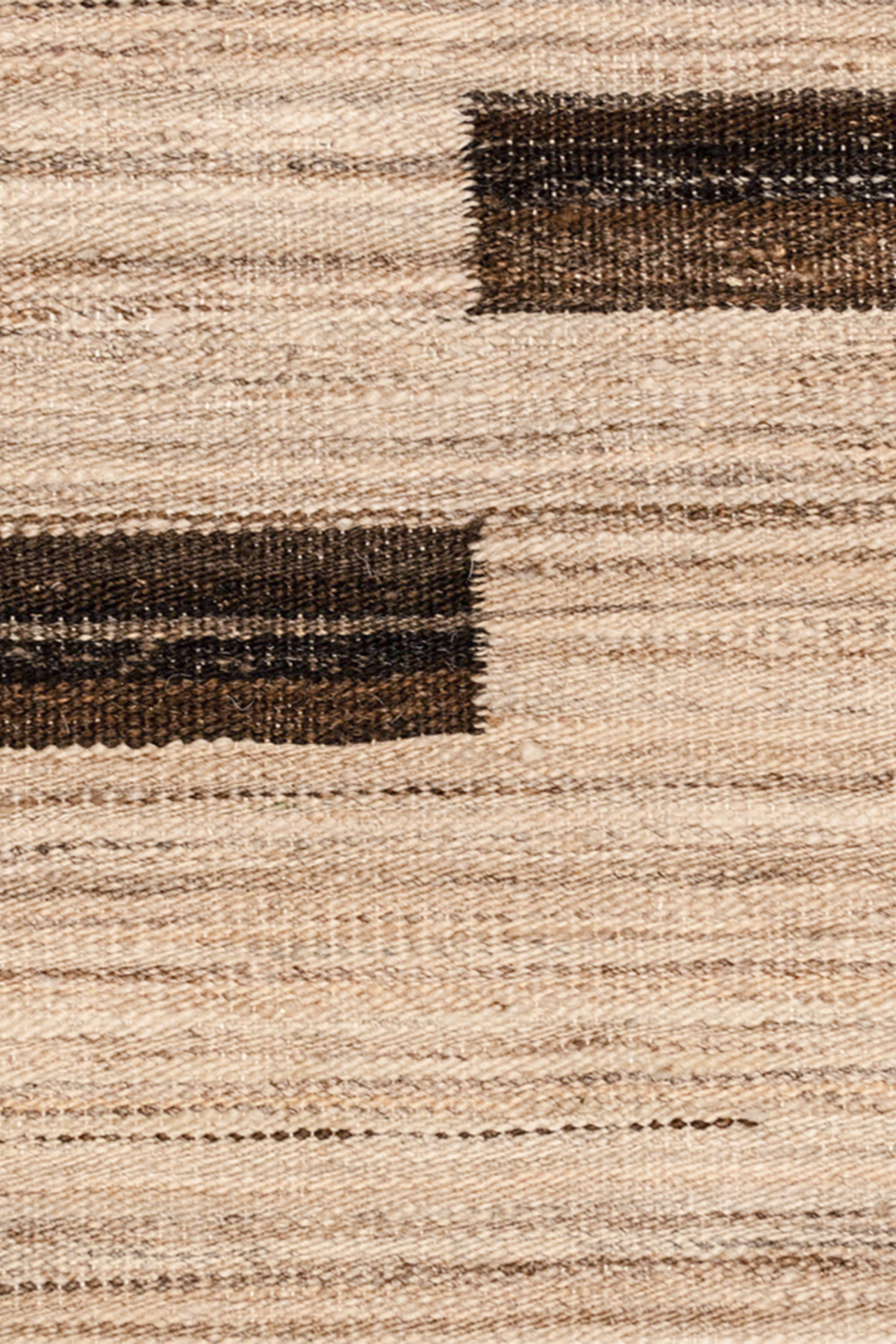 Dieser schöne, handgewobene Kelim Teppich aus ungefärbter, bester Schafswolle ist beidseitig zu verwenden und besonders strapazierfähig. Der Teppich zeigt eine abstrakte Wüstenlandschaft, mit kleinen, braunen Steinchen und Hügeln. In der Wüste ist es vollkommen still, nur der Wind treibt einzelne Sandkörner vor sich her. Das Unikat wurde von talentierten Knüpfern, von Hand gefertigt und weist aufgrund der hochwertigen Materialien eine erstklassige Qualität auf. Der Teppich passt sehr gut in ein modernes, aber auch in ein rustikales Wohnkonzept.