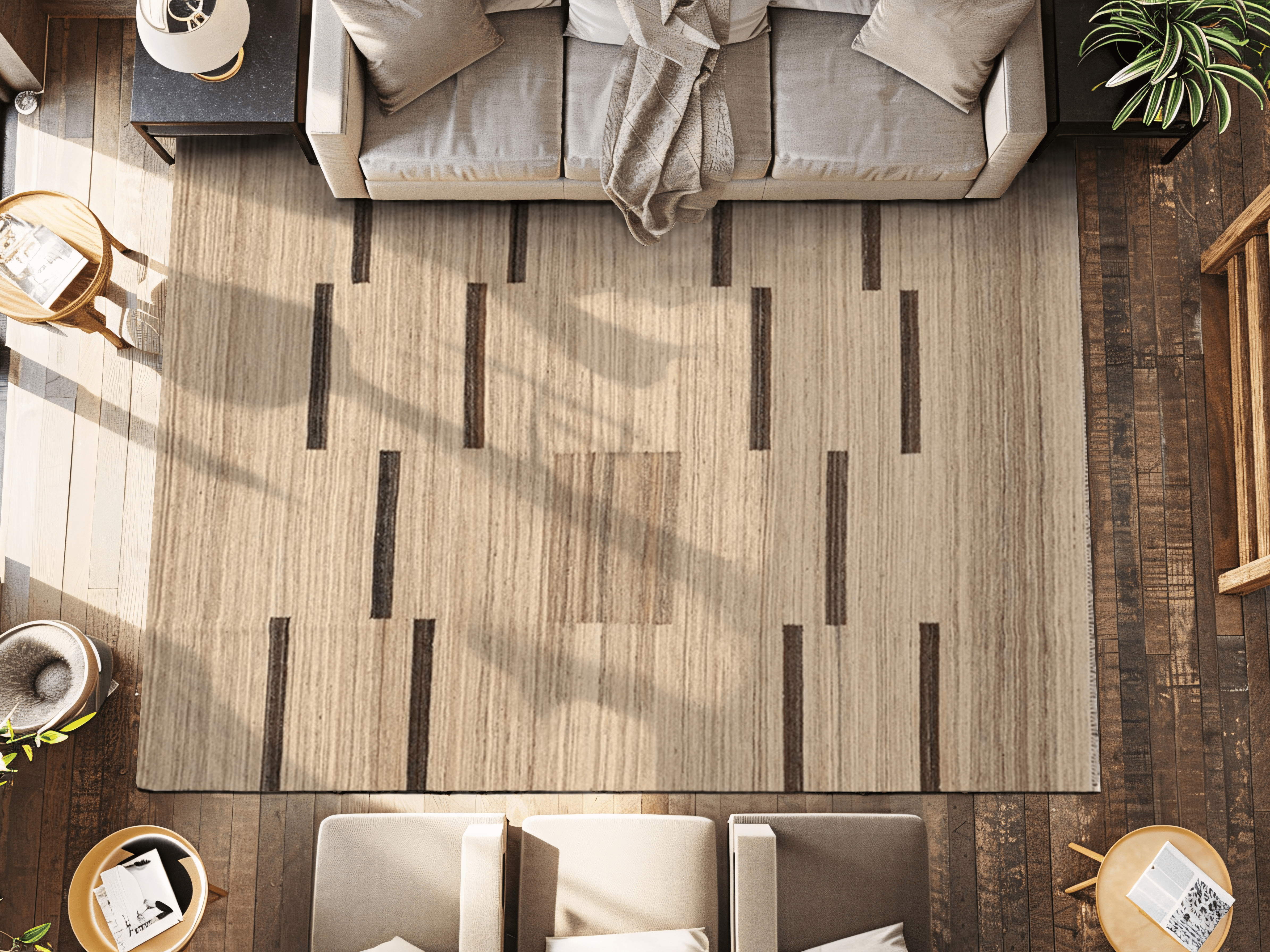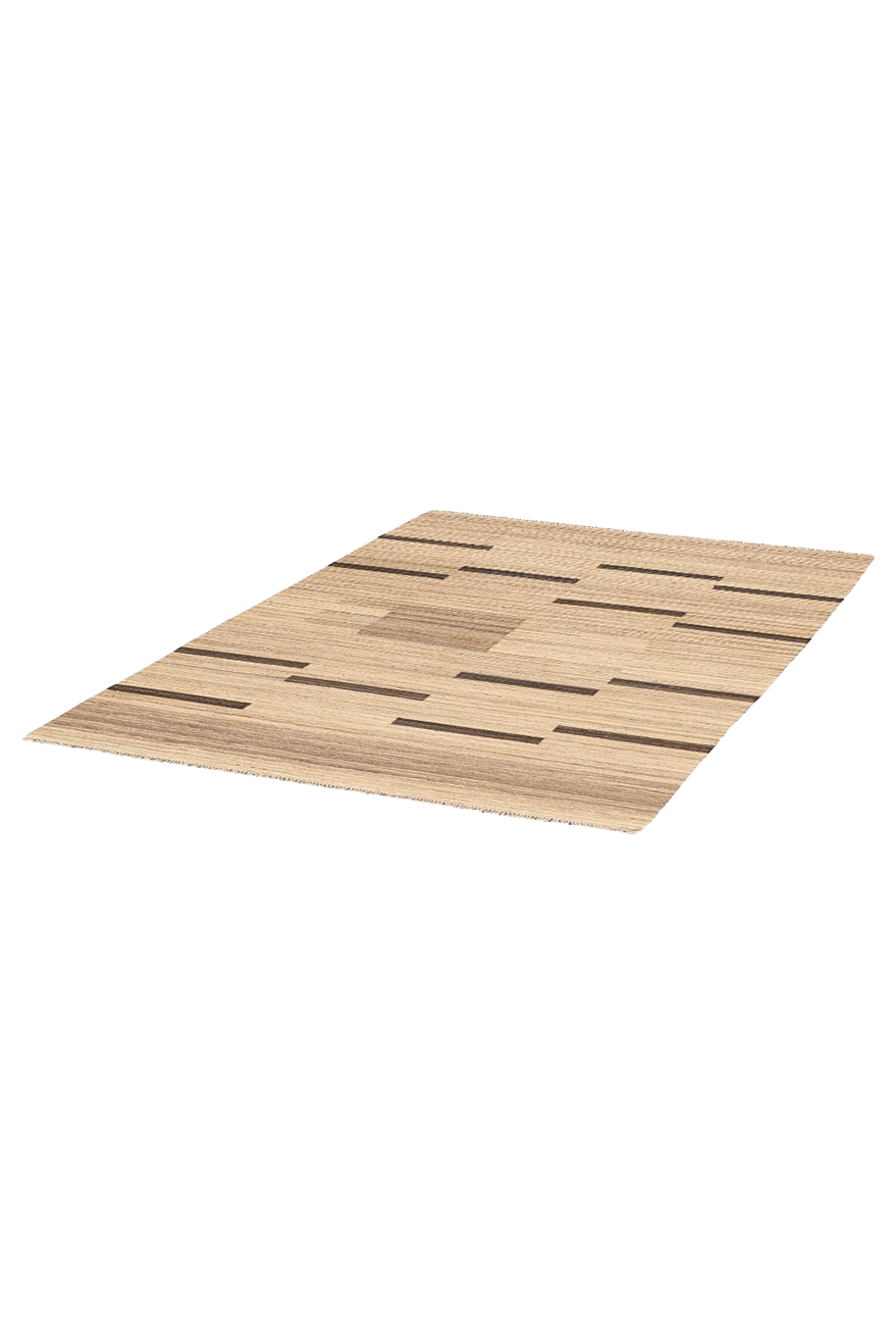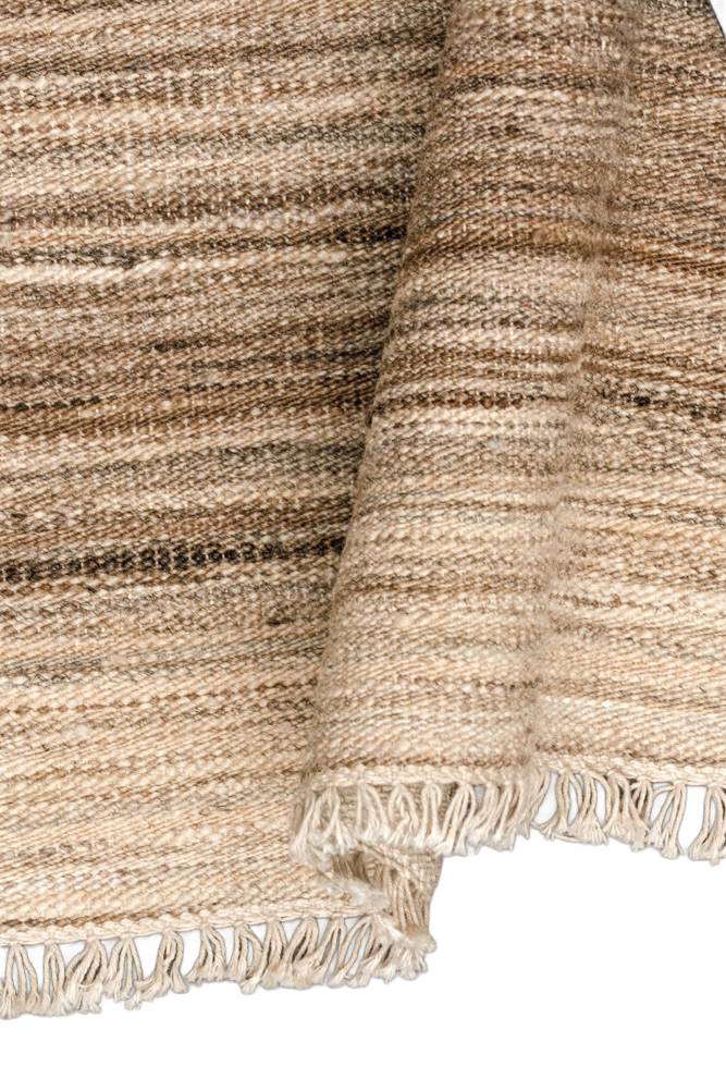 Dieser schöne, handgewobene Kelim Teppich aus ungefärbter, bester Schafswolle ist beidseitig zu verwenden und besonders strapazierfähig. Der Teppich zeigt eine abstrakte Wüstenlandschaft, mit kleinen, braunen Steinchen und Hügeln. In der Wüste ist es vollkommen still, nur der Wind treibt einzelne Sandkörner vor sich her. Das Unikat wurde von talentierten Knüpfern, von Hand gefertigt und weist aufgrund der hochwertigen Materialien eine erstklassige Qualität auf. Der Teppich passt sehr gut in ein modernes, aber auch in ein rustikales Wohnkonzept.
