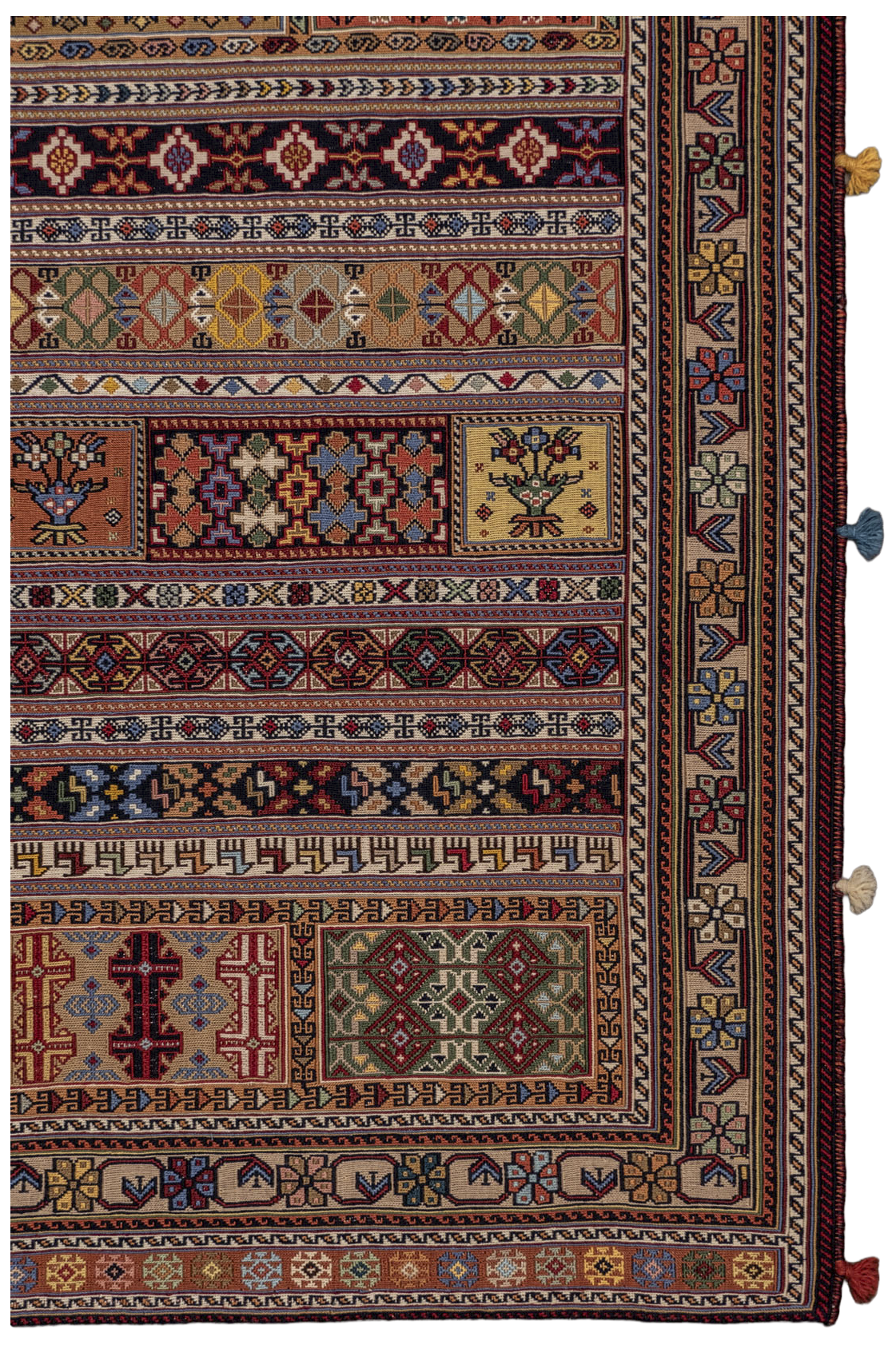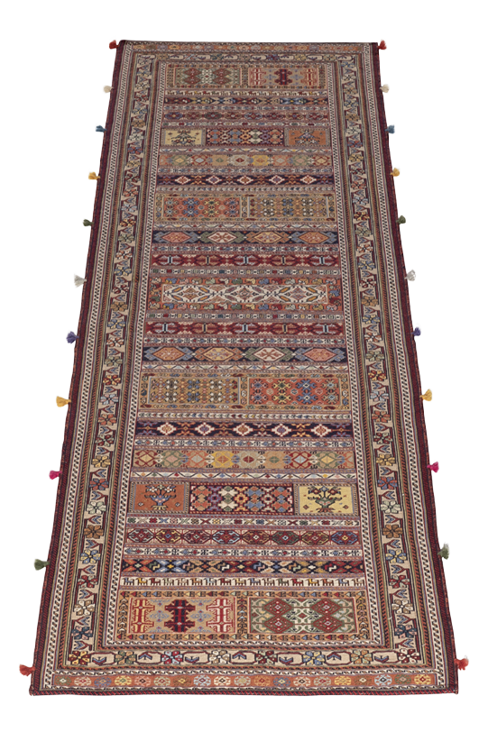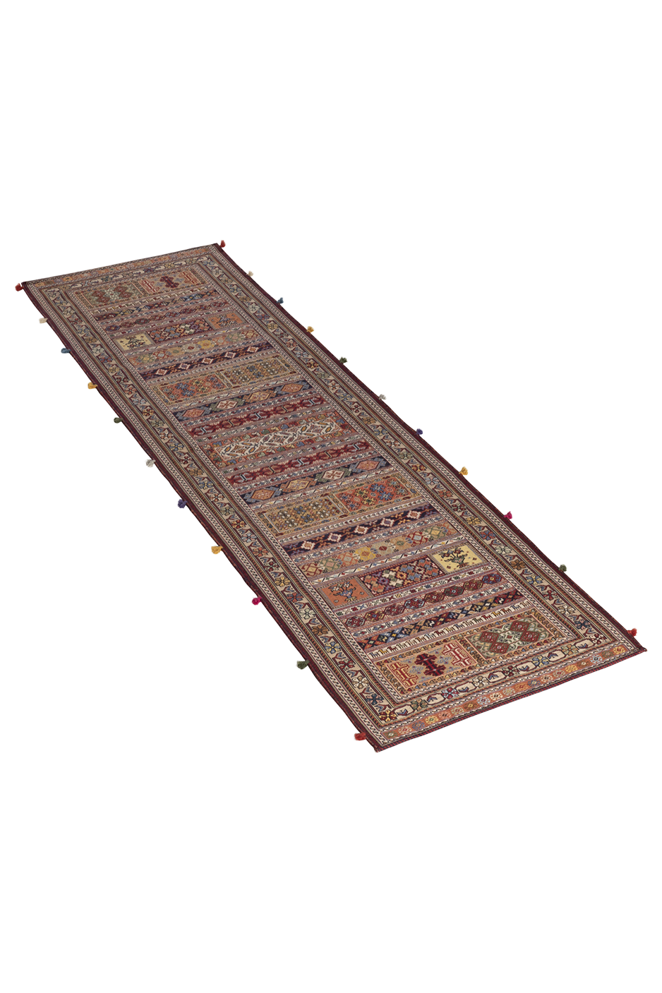 Dieser besondere, sehr fein gewebte Kelim Läufer aus dem Iran, hat einen ausgefallenen Look. Er ist aus reiner Zagroswolle gewoben und die Wolle wurde mit Naturfarben gefärbt. Die traditionellen Muster geben dem Läufer eine wertige und einzigartige Ausstrahlung. Die kleinen Wollbüschel am Rand des Teppichunikates, wurden hineingeknüpft. Der Läufer passt sehr gut in Wohneinrichtungen mit viel Holz oder alternativ in sehr moderne Wohnräume. Ebenfalls beliebt sind die flachen Teppichläufer für den etwas ausgefalleneren Bohemien Wohnstil.