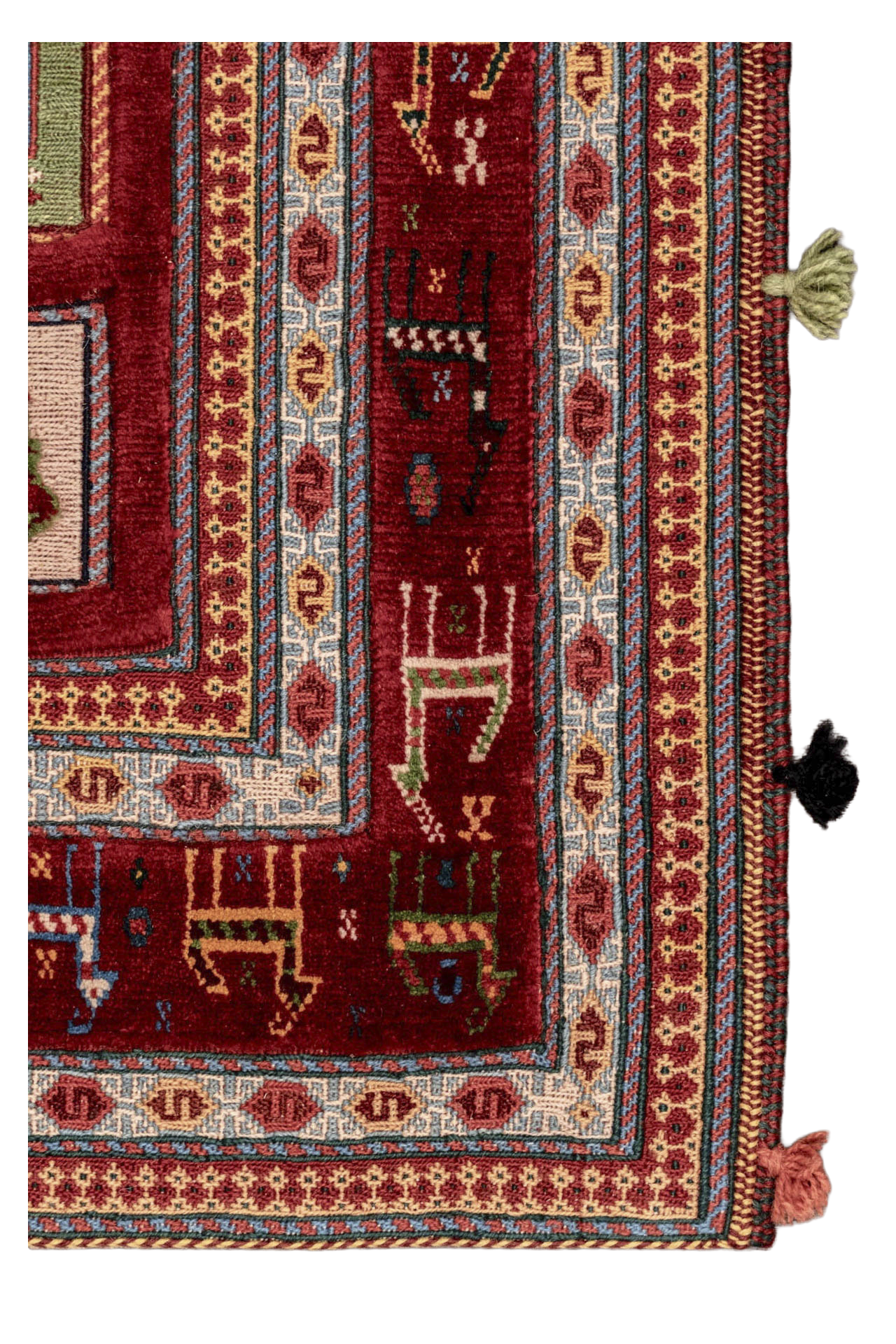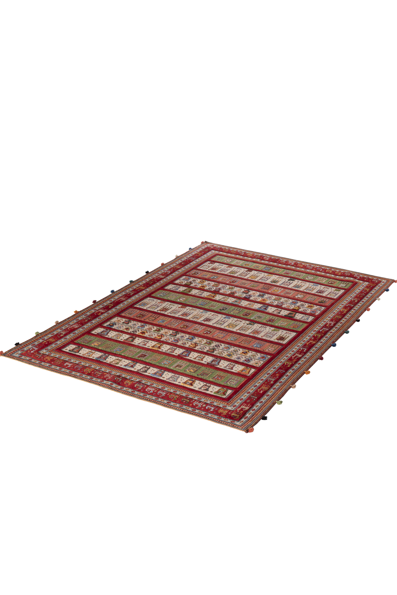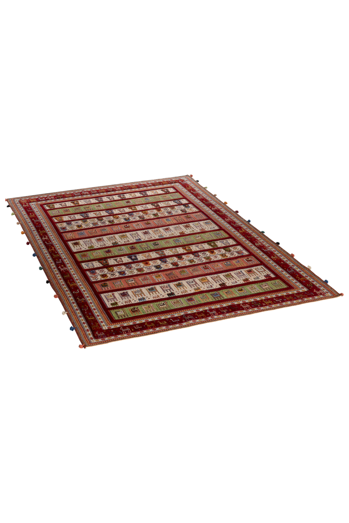Dieser einzigartige, flachgewebte Kelim Teppich Soumakh Animal aus dem Iran wurde in einer besonderen, sehr feinen Soumakh Technik von Hand gewoben. Er besteht aus hochwertiger Zagroswolle, welche mit Naturfarben gefärbt wurde. Die harmonischen Farben verleihen dem Unikat eine prachtvolle Ausstrahlung. Der Teppich erzählt die Geschichte der Nomadenfamilie mit ihren Tieren. Die Motive wurden teilweise geknüpft. Der Kelim Teppich passt sehr gut in Wohneinrichtungen mit viel Holz oder alternativ in sehr moderne Wohnräume. Ebenfalls beliebt sind diese Teppichunikate für den etwas ausgefalleneren Bohemien Wohnstil. Die verwendete Zagroswolle ist sehr strapazierfähig. Für diesen schönen Teppich empfehlen wir eine Antirutsch-Unterlage. Bedenkenlos kann der Teppich auch auf Böden mit Fußbodenheizung gelegt werden.