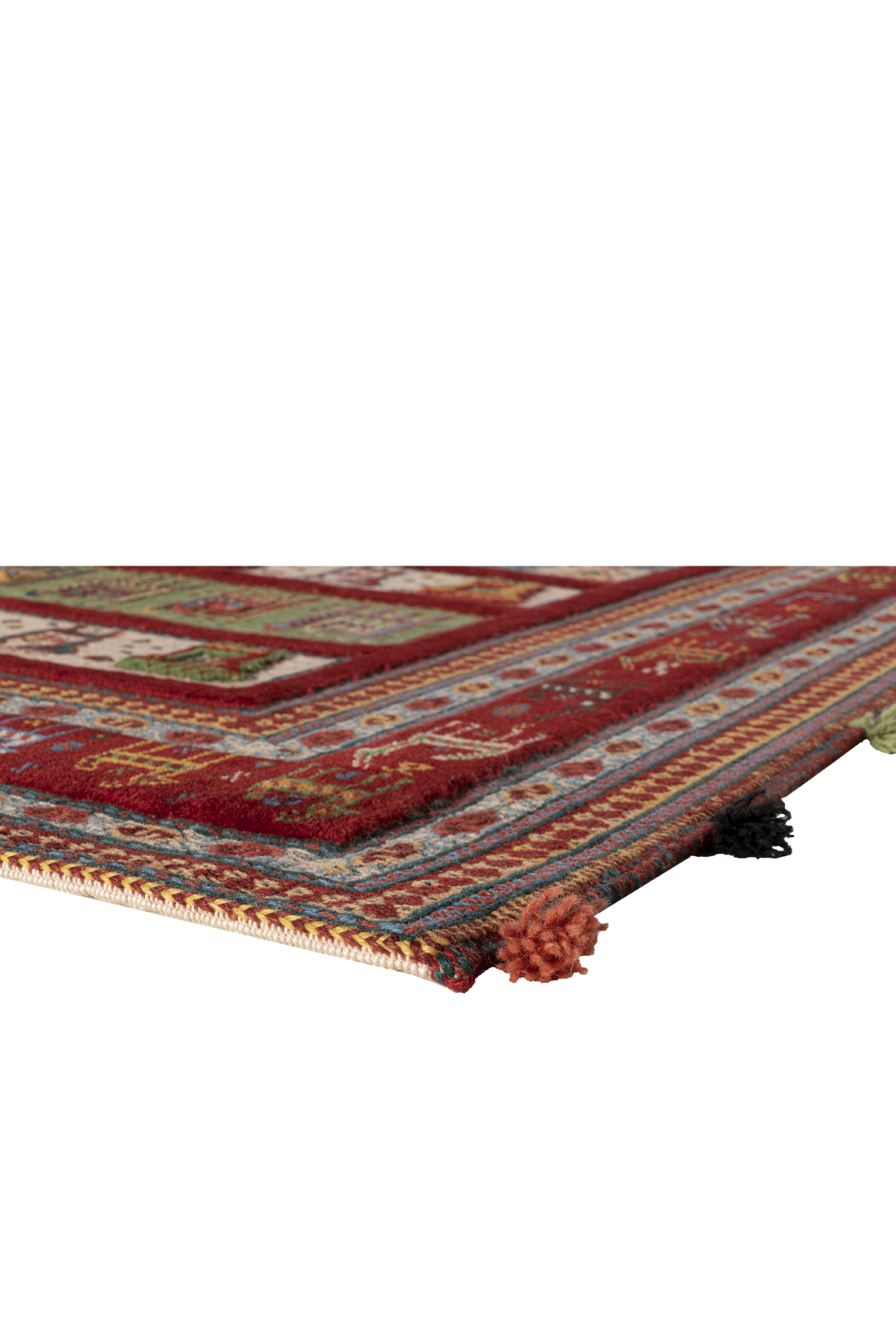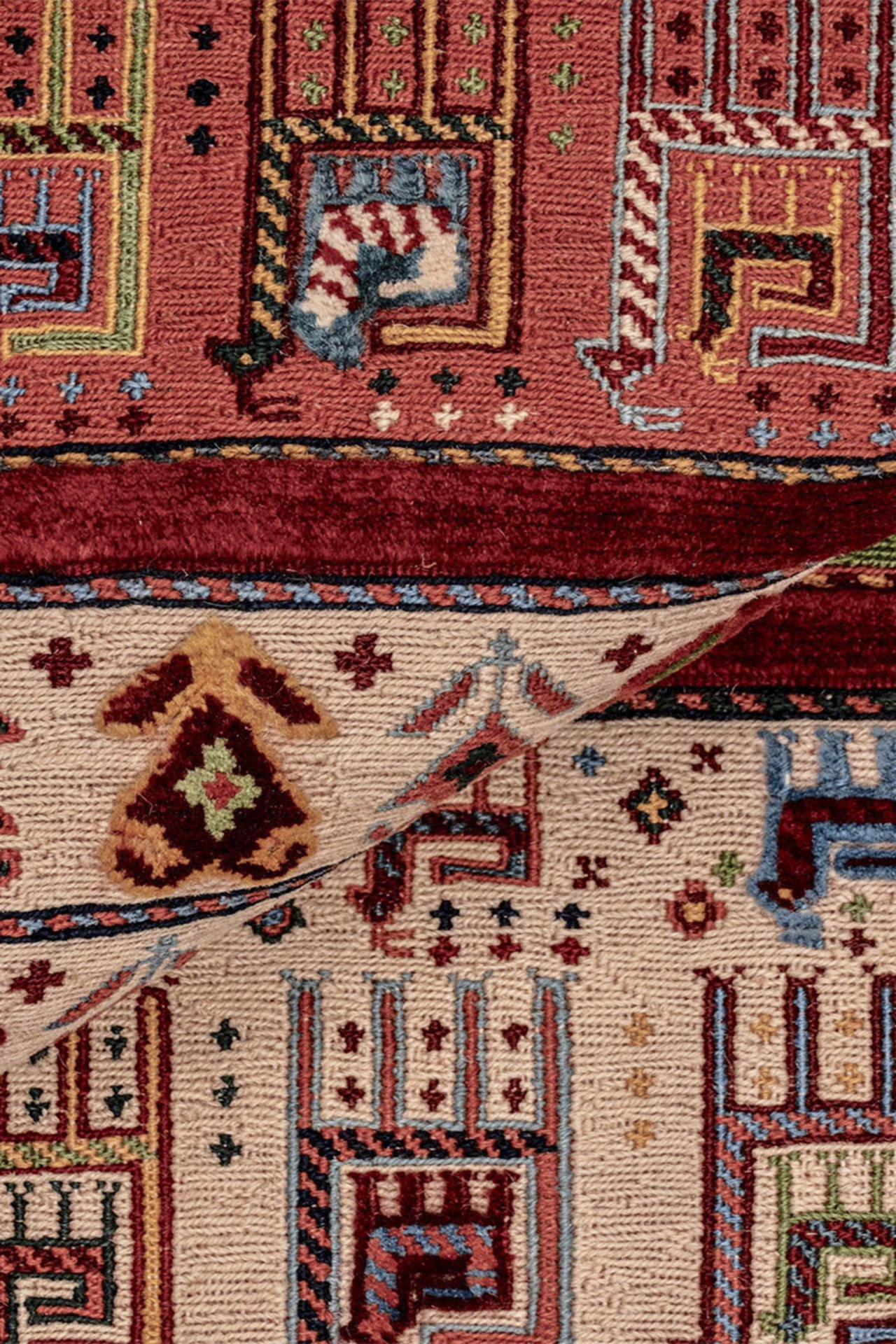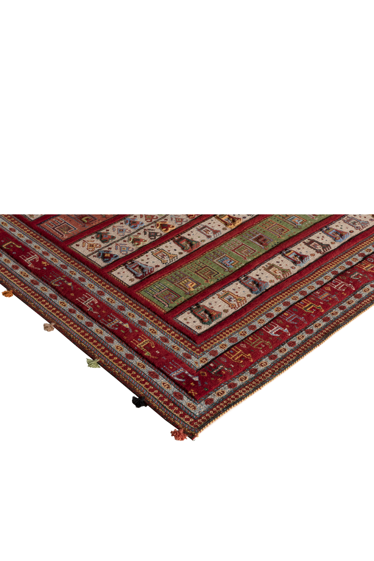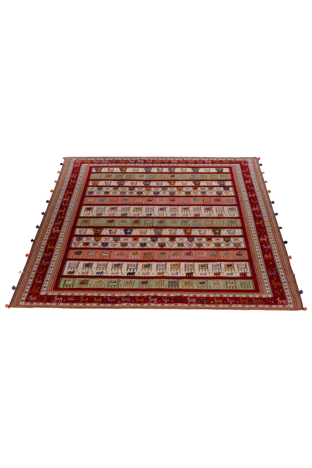 Dieser einzigartige, flachgewebte Kelim Teppich Soumakh Animal aus dem Iran wurde in einer besonderen, sehr feinen Soumakh Technik von Hand gewoben. Er besteht aus hochwertiger Zagroswolle, welche mit Naturfarben gefärbt wurde. Die harmonischen Farben verleihen dem Unikat eine prachtvolle Ausstrahlung. Der Teppich erzählt die Geschichte der Nomadenfamilie mit ihren Tieren. Die Motive wurden teilweise geknüpft. Der Kelim Teppich passt sehr gut in Wohneinrichtungen mit viel Holz oder alternativ in sehr moderne Wohnräume. Ebenfalls beliebt sind diese Teppichunikate für den etwas ausgefalleneren Bohemien Wohnstil. Die verwendete Zagroswolle ist sehr strapazierfähig. Für diesen schönen Teppich empfehlen wir eine Antirutsch-Unterlage. Bedenkenlos kann der Teppich auch auf Böden mit Fußbodenheizung gelegt werden.