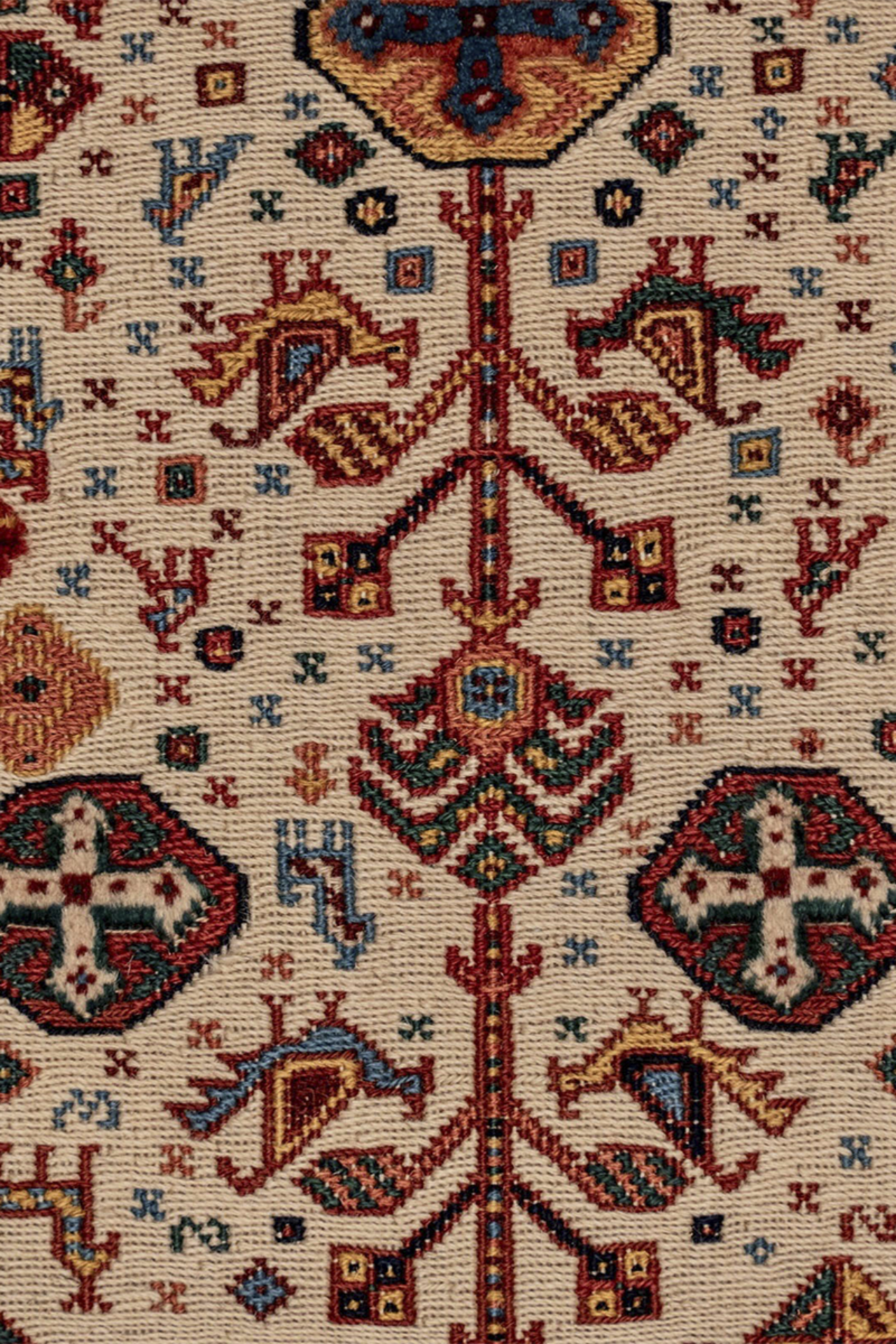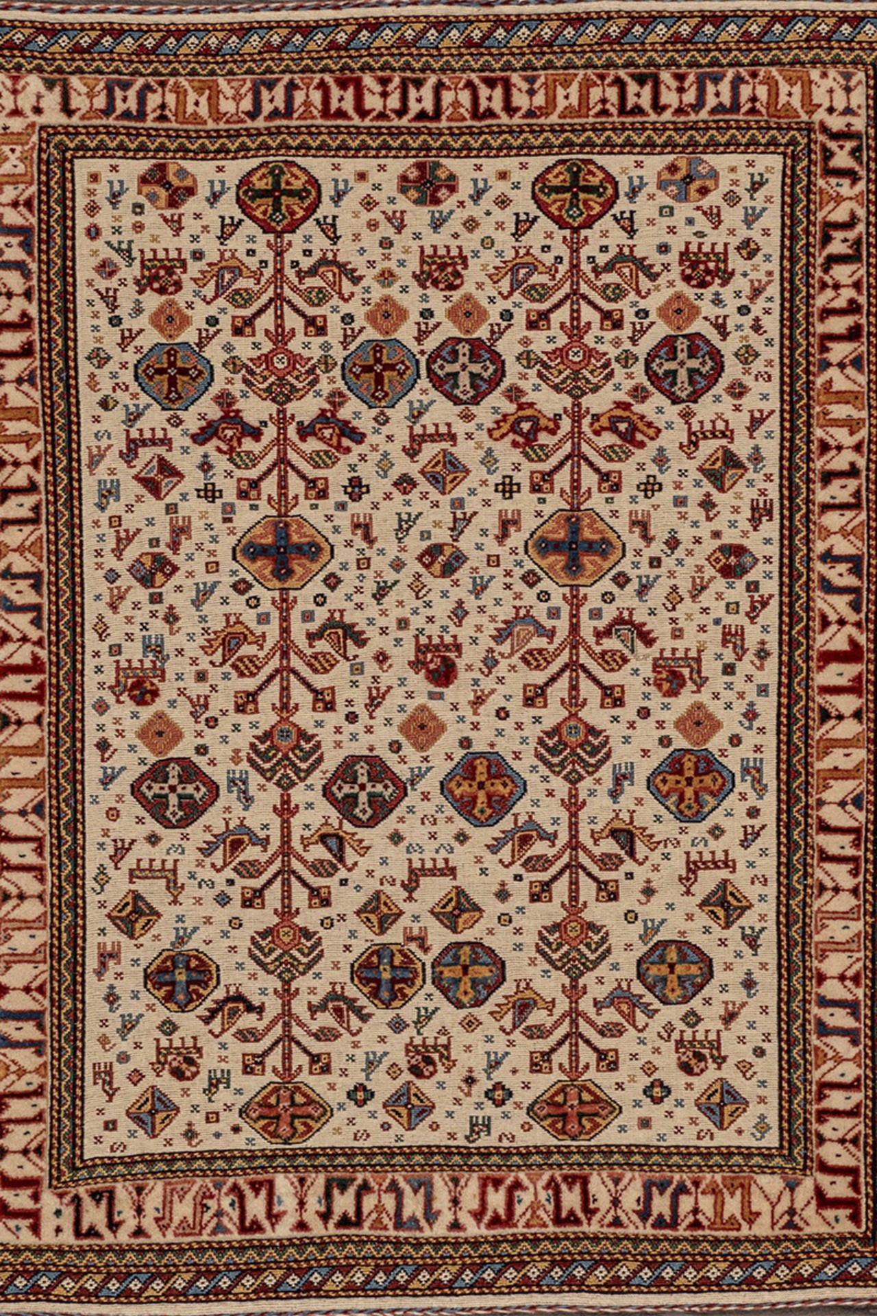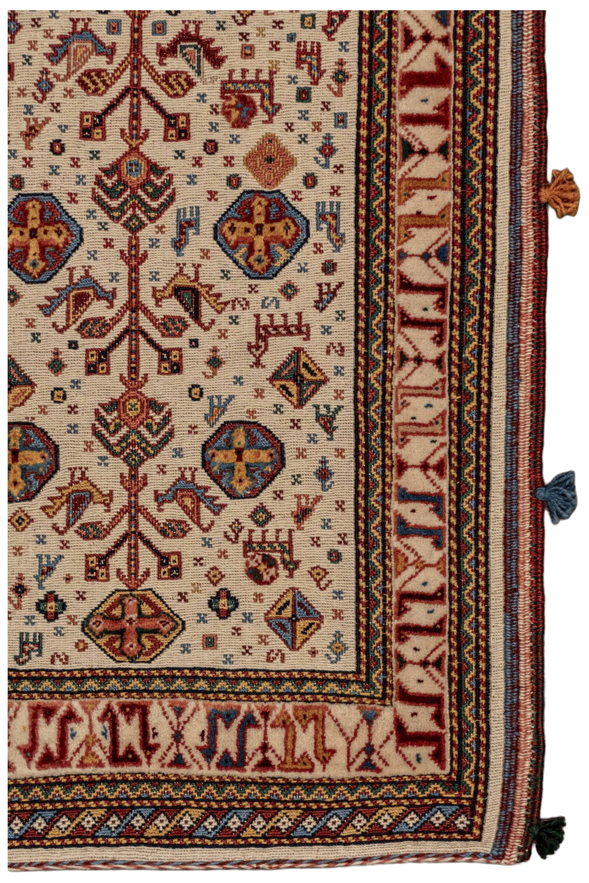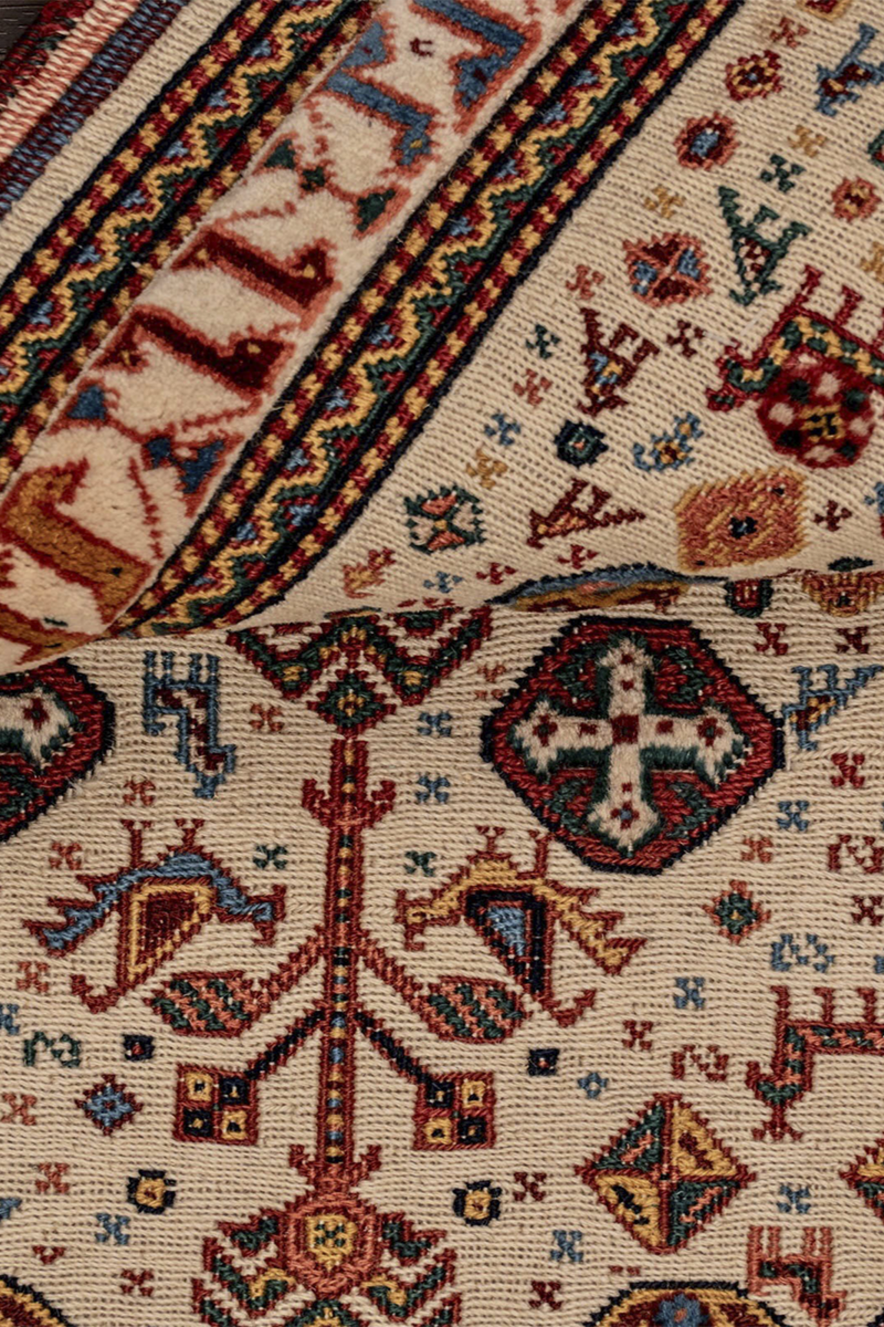 Dieser wunderschöne, kleine Kelim Teppich aus bester, mit Naturfarben gefärbter Zagroswolle ist ein bezauberndes Unikat aus dem Iran. Er ist in der Soumakh Technik teils von Hand geknüpft und teils gewebt worden. Die flachen Bereiche des Teppichs sind gewebt, die höherliegenden, florigen Details sind geknüpft. Es ist eine alte Handwerkskunst diese Art der Teppiche zu machen. In dem Teppich sind viele Ornamente aus der persischen Kultur zu sehen. Sie geben dem Teppich einen eigenen Charakter und Persönlichkeit. Der kleine Teppich hat so viel Charme, dass sein Betrachter sofort in seinem Bann gezogen wird. Er ist einfach ein einzigartiges Unikat mit eigener Geschichte.
