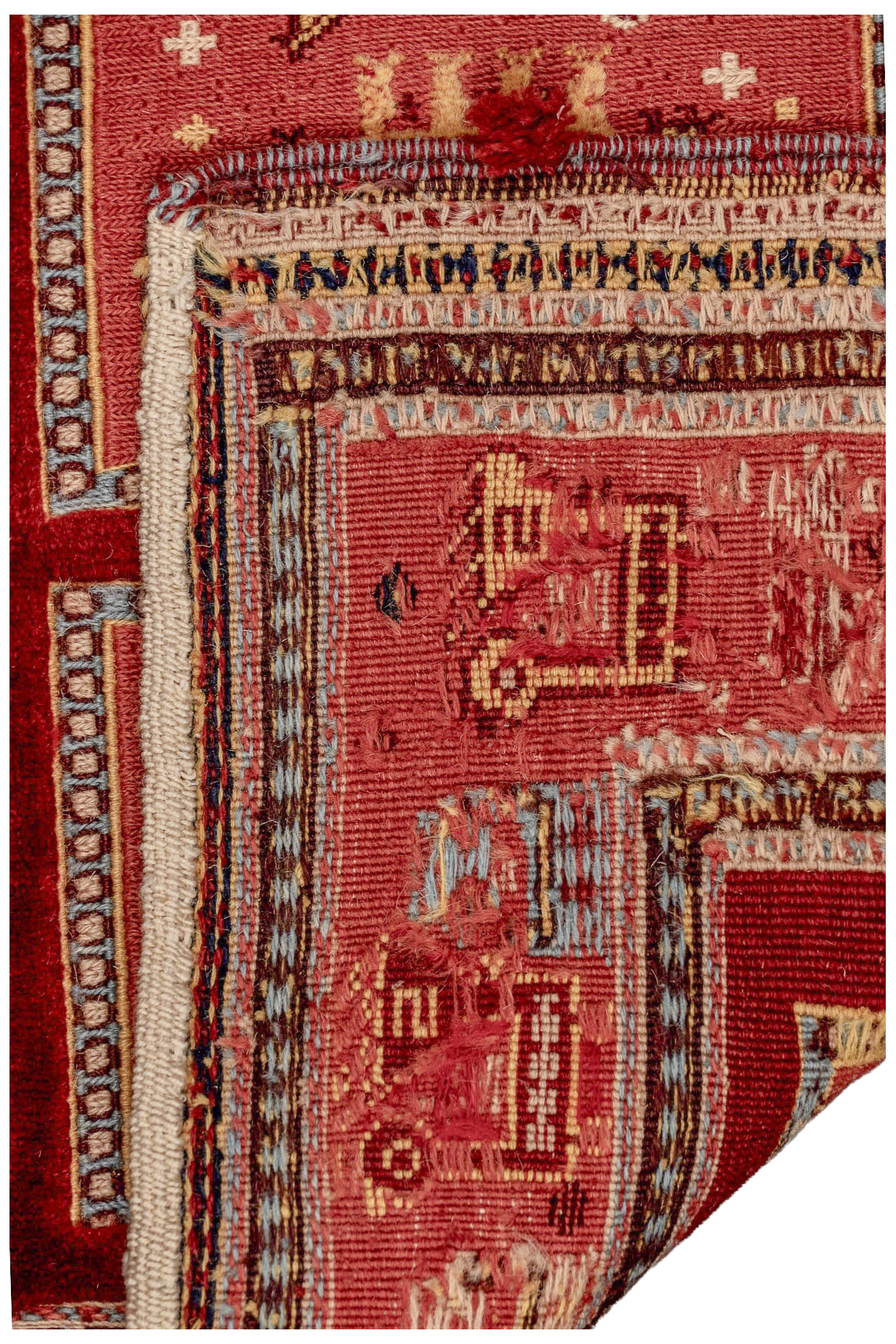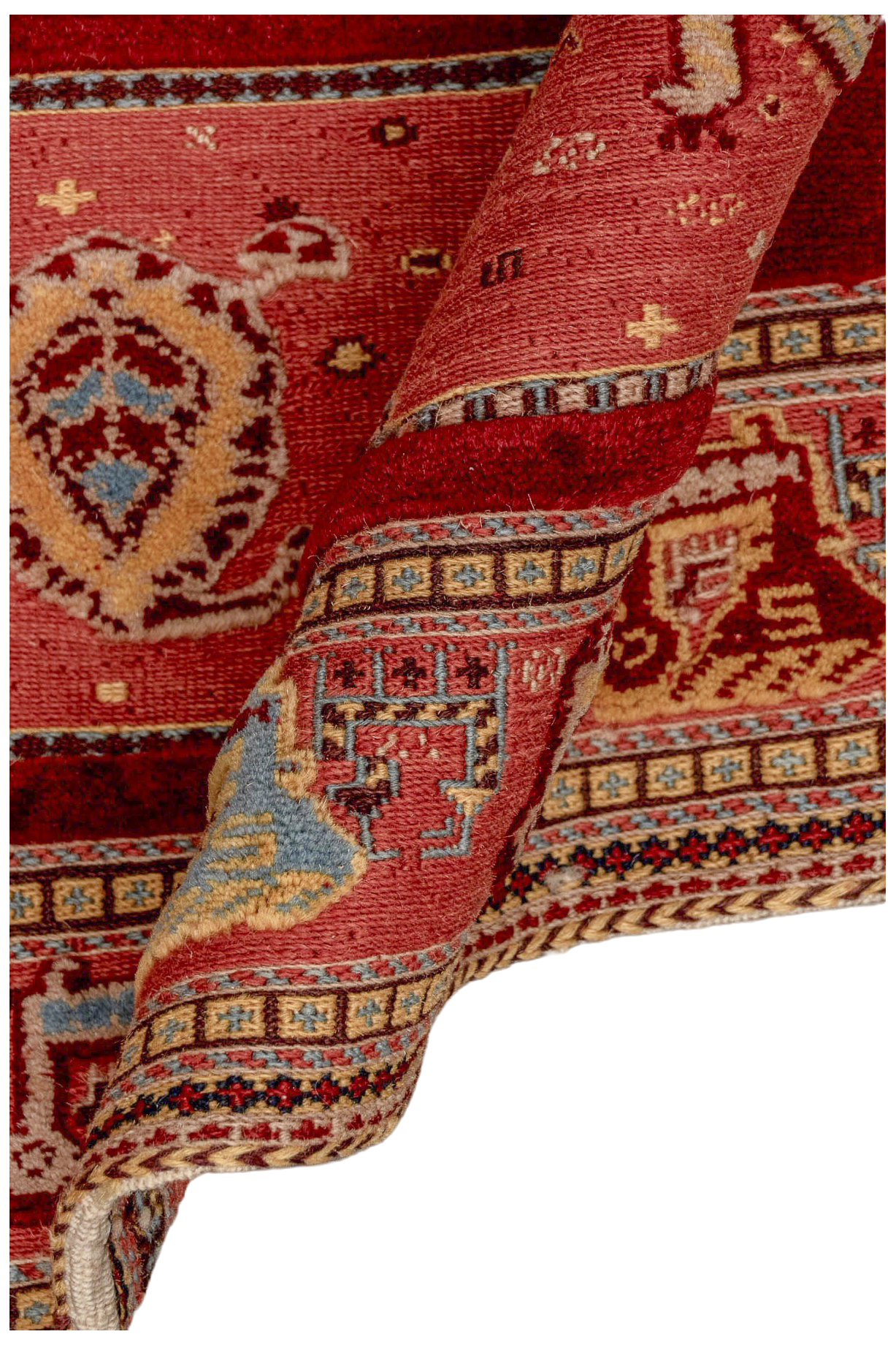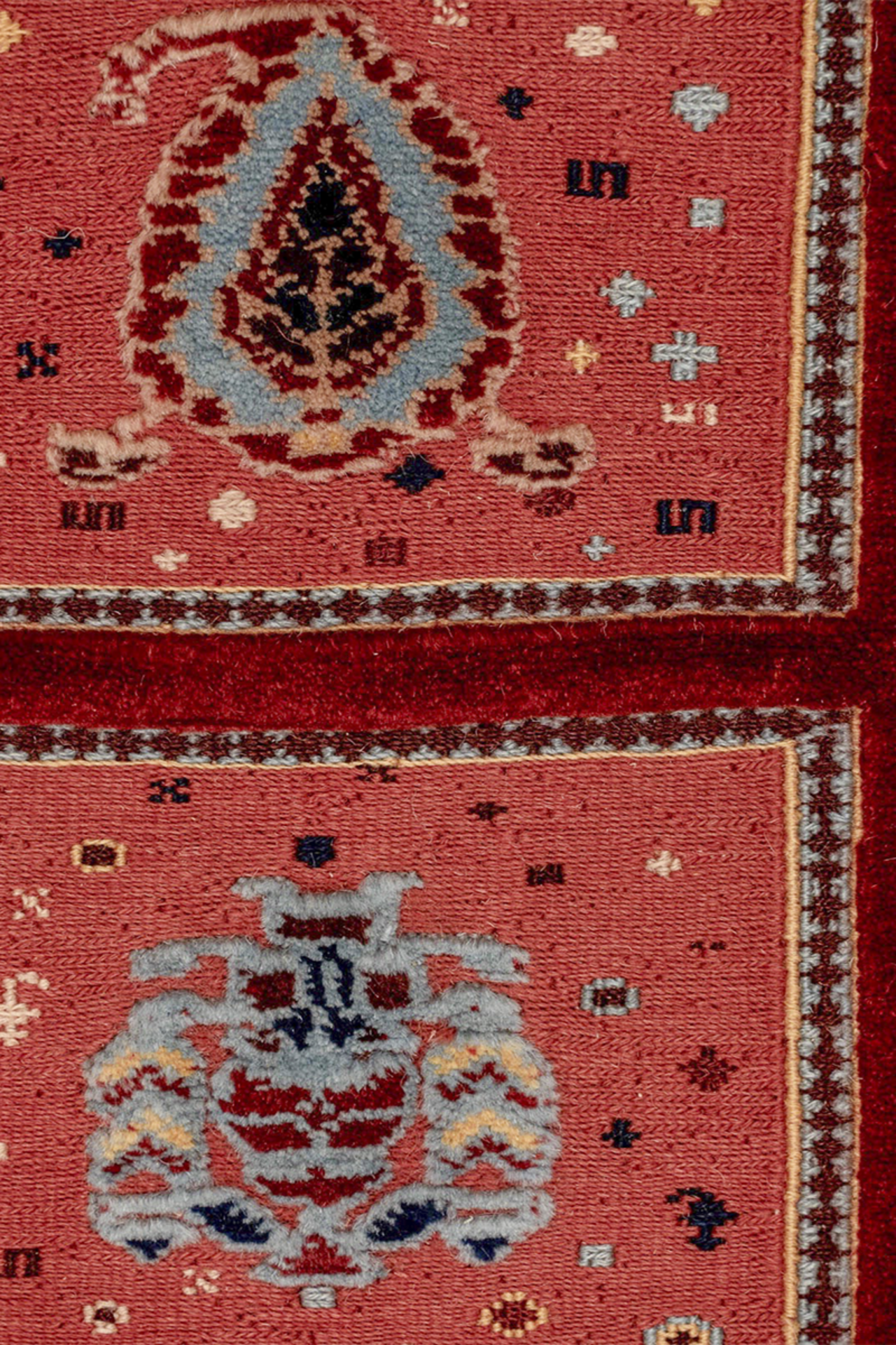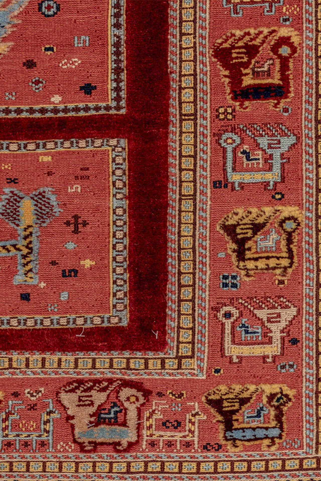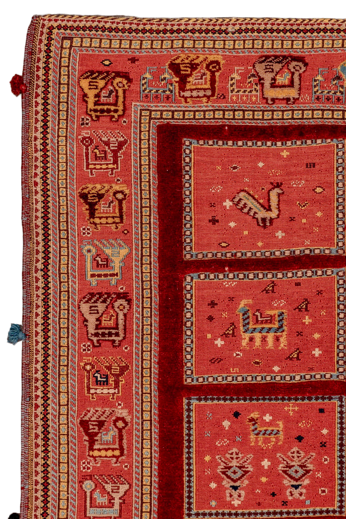 Dieser einzigartige Kelim Teppich stammt aus dem Iran und wurde dort mit feinster Zagroswolle von Hand gewoben und von Hand geknüpft. Die bunten Motive auf dem roten Untergrund, stechen hervor und verleihen diesem eine besondere Ausstrahlung. Mit präziser Handarbeit wurden die kleinen Tierchen und Blüten Knoten für Knoten in den Teppich geknüpft und die Schurwolle wurde mit Naturfarben gefärbt. Die Naturfarben sind aus Pflanzen und Blüten gewonnen. Man erkennt, dass die Tiere gerade auf einer Wanderung sind und einen Platz zum grasen suchen. Ein wunderschönes Unikat, welches seine eigene Geschichte erzählt.