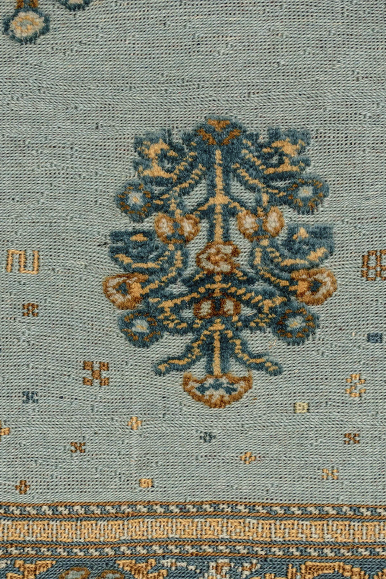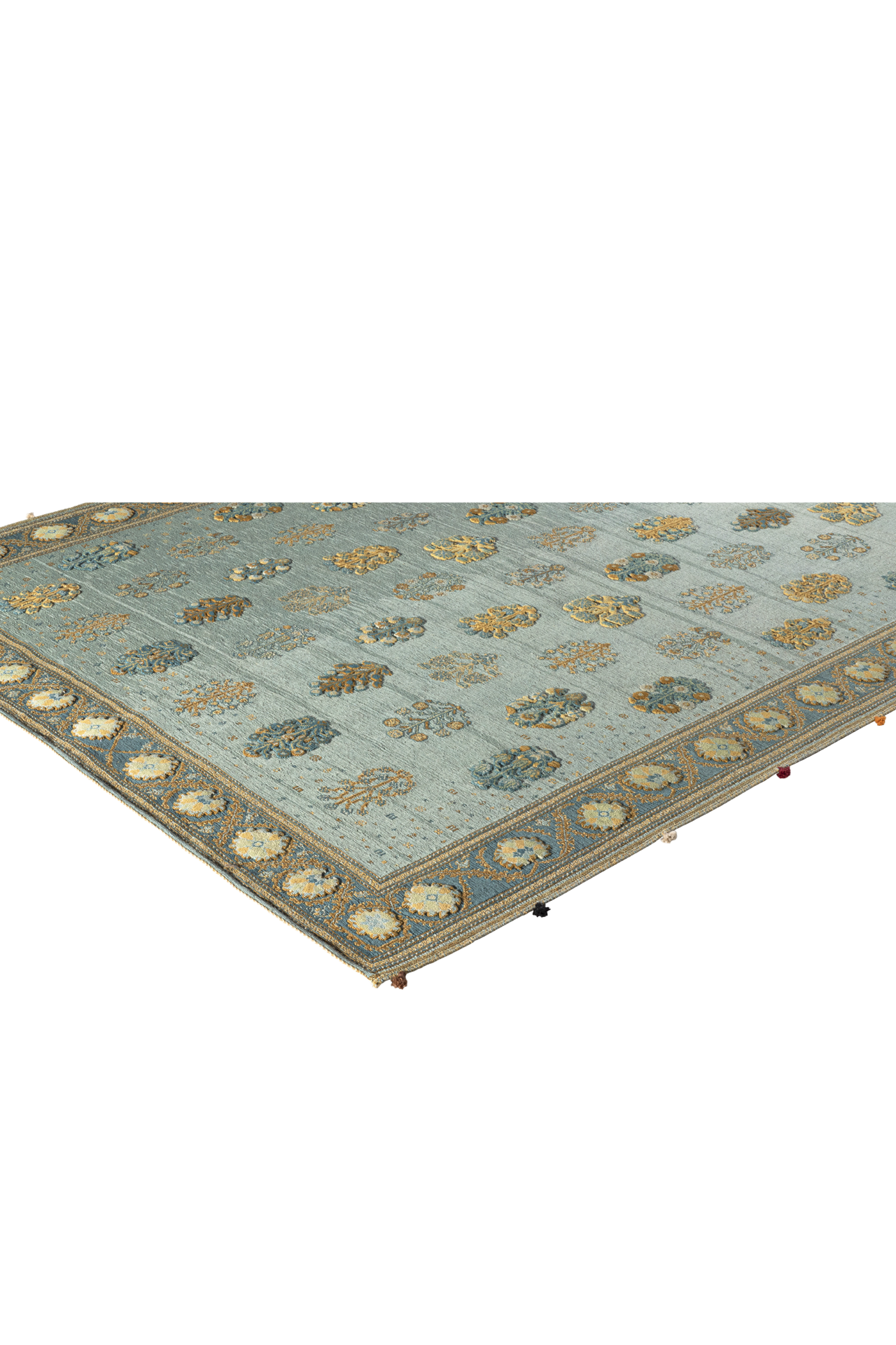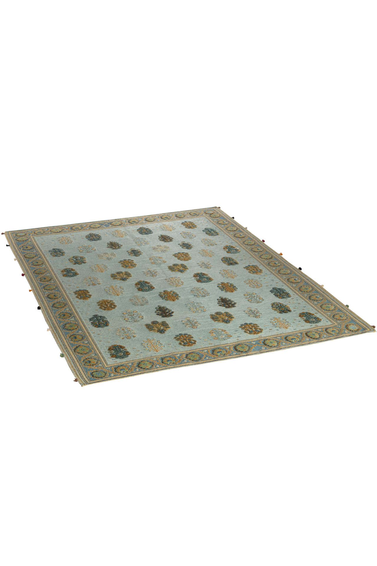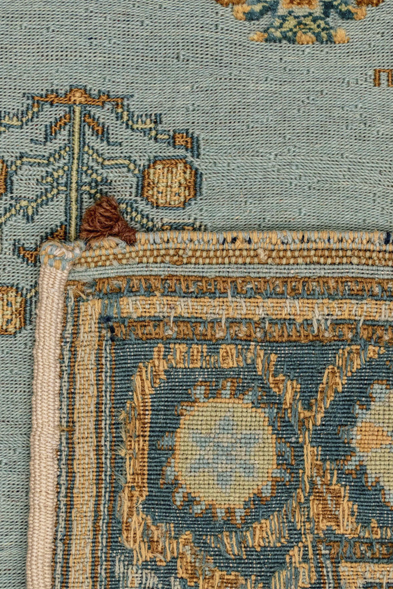 Dieser umwerfende Kelim Teppich ist ein ganz besonderes Unikat. Durch seinen türkisfarbenen Untergrund und den goldenen Pflanzen wirkt der Teppich sehr elegant und freundlich. Er strahlt die pure Lebensfreude aus, die sich in der Knüpferin widerspiegelt. Der Teppich wurde im Iran in der sehr aufwändigen Soumakh Technik von Hand gewoben. Die Motive wurden im Wechsel geknüpft und gewoben. Verwendet wurde strapazierfähige Zagroswolle, welche mit Naturfarben gefärbt wurde. Der Teppich erinnert an einen Palast, in dem die Wände und Decken golden leuchten. Dieses Unikat zieht alle Blicke auf sich und hinterlässt durch seine eigene Geschichte einen bleibenden Eindruck. Für diesen schönen Teppich empfehlen wir eine Antirutsch-Unterlage. Bedenkenlos kann der Teppich auch auf Böden mit Fußbodenheizung gelegt werden.