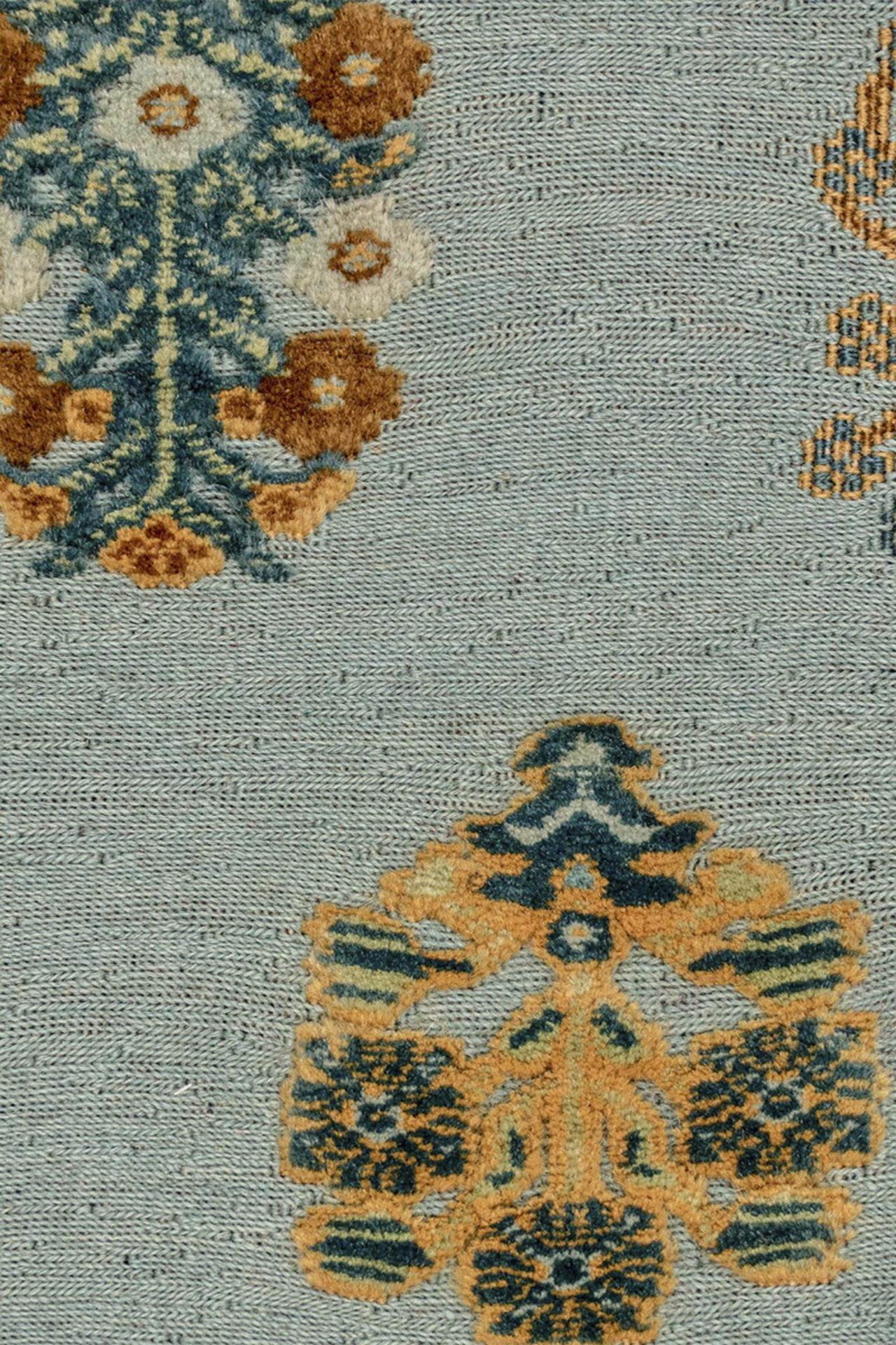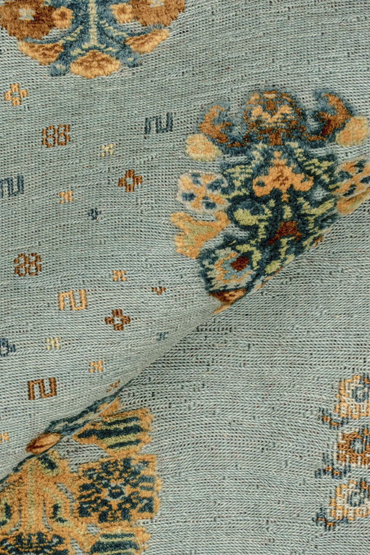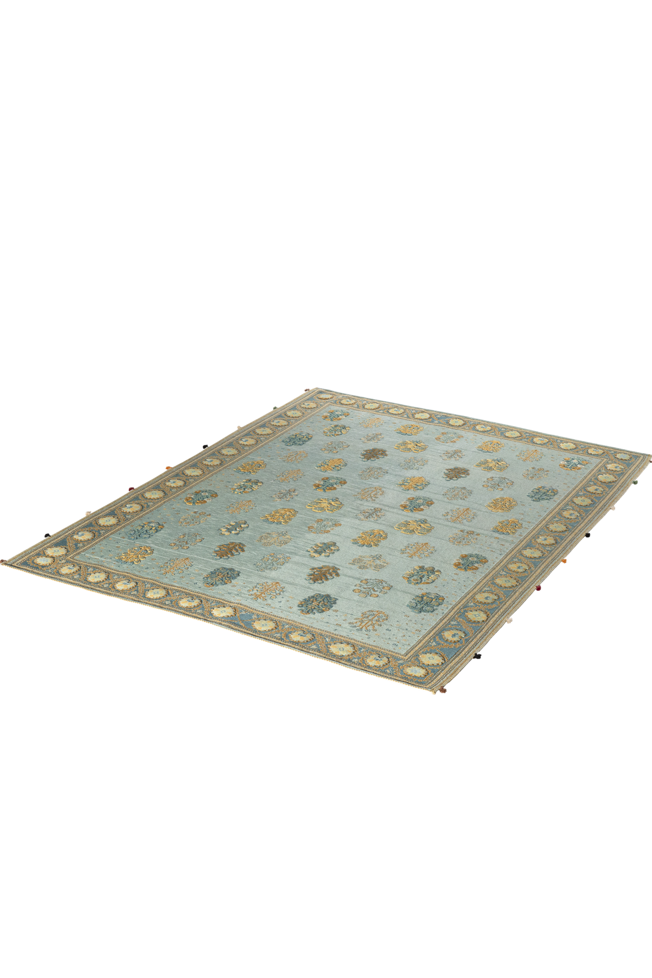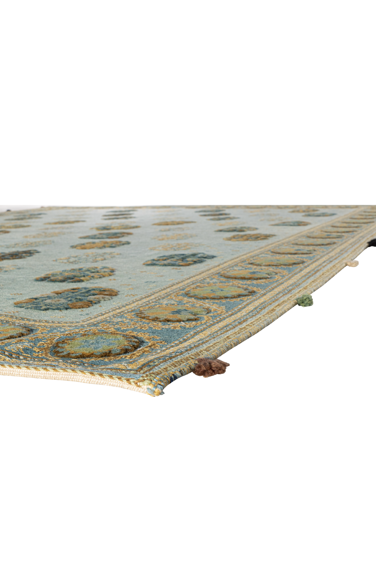 Dieser umwerfende Kelim Teppich ist ein ganz besonderes Unikat. Durch seinen türkisfarbenen Untergrund und den goldenen Pflanzen wirkt der Teppich sehr elegant und freundlich. Er strahlt die pure Lebensfreude aus, die sich in der Knüpferin widerspiegelt. Der Teppich wurde im Iran in der sehr aufwändigen Soumakh Technik von Hand gewoben. Die Motive wurden im Wechsel geknüpft und gewoben. Verwendet wurde strapazierfähige Zagroswolle, welche mit Naturfarben gefärbt wurde. Der Teppich erinnert an einen Palast, in dem die Wände und Decken golden leuchten. Dieses Unikat zieht alle Blicke auf sich und hinterlässt durch seine eigene Geschichte einen bleibenden Eindruck. Für diesen schönen Teppich empfehlen wir eine Antirutsch-Unterlage. Bedenkenlos kann der Teppich auch auf Böden mit Fußbodenheizung gelegt werden.