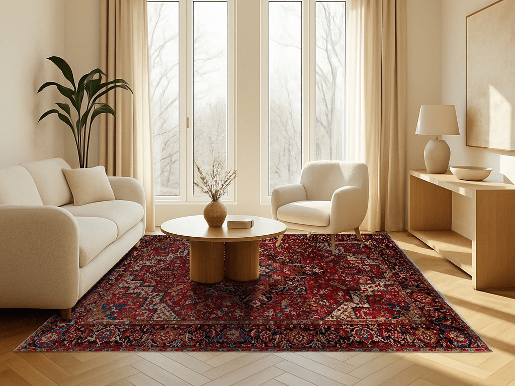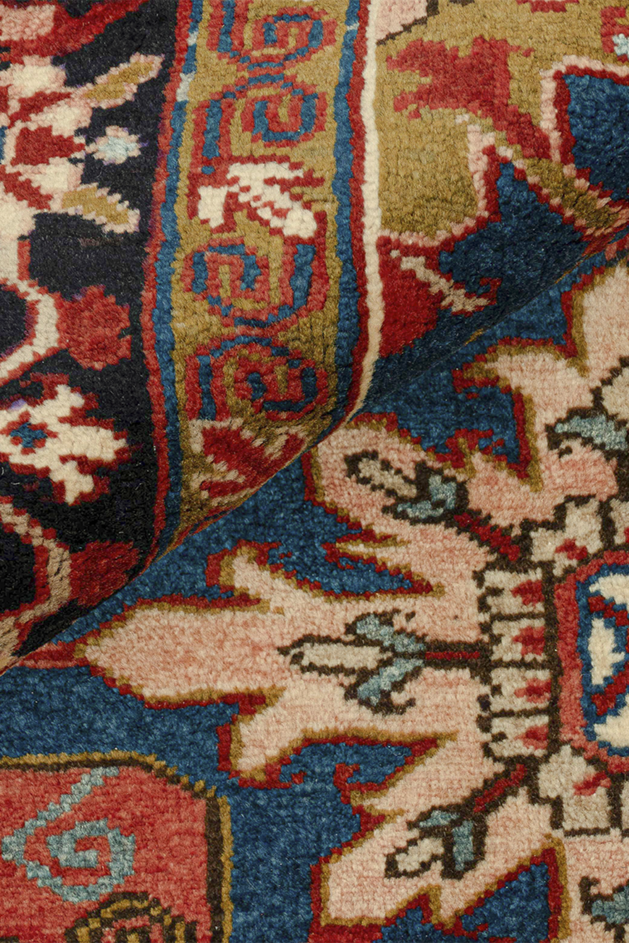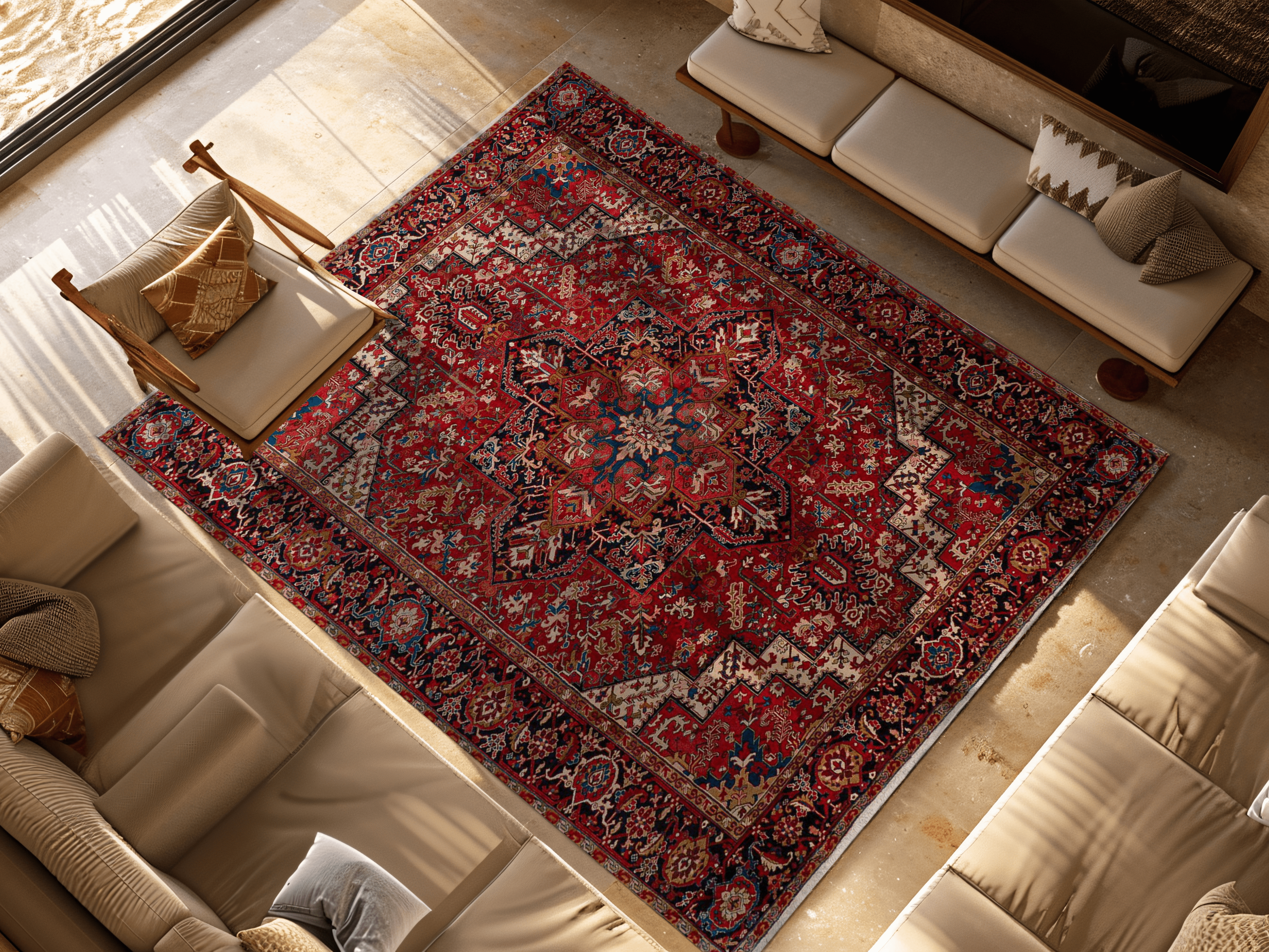 Heriz liegt im Norden des Iran, zwischen Täbris und dem Kaspischen Meer. Der klassische Orientteppich mit der klaren Zeichnung hat einen russischen Einschlag. Das Bordeauxrot des handgeknüpften Teppichs wirkt modern und klassich zugleich. Im Zentrum des Teppichs befindet sich ein Medaillon mit betonten Ecken. Heriz-Teppiche gelten als äußerst strapazierfähig und sind bekannt für beste Schurwollqualität, Verschleißfestigkeit und Dauerhaftigkeit. Heute werden die Orientteppiche gerne für hochmoderne Interieur Konzepte genutzt und sind somit echte Statement Pieces.