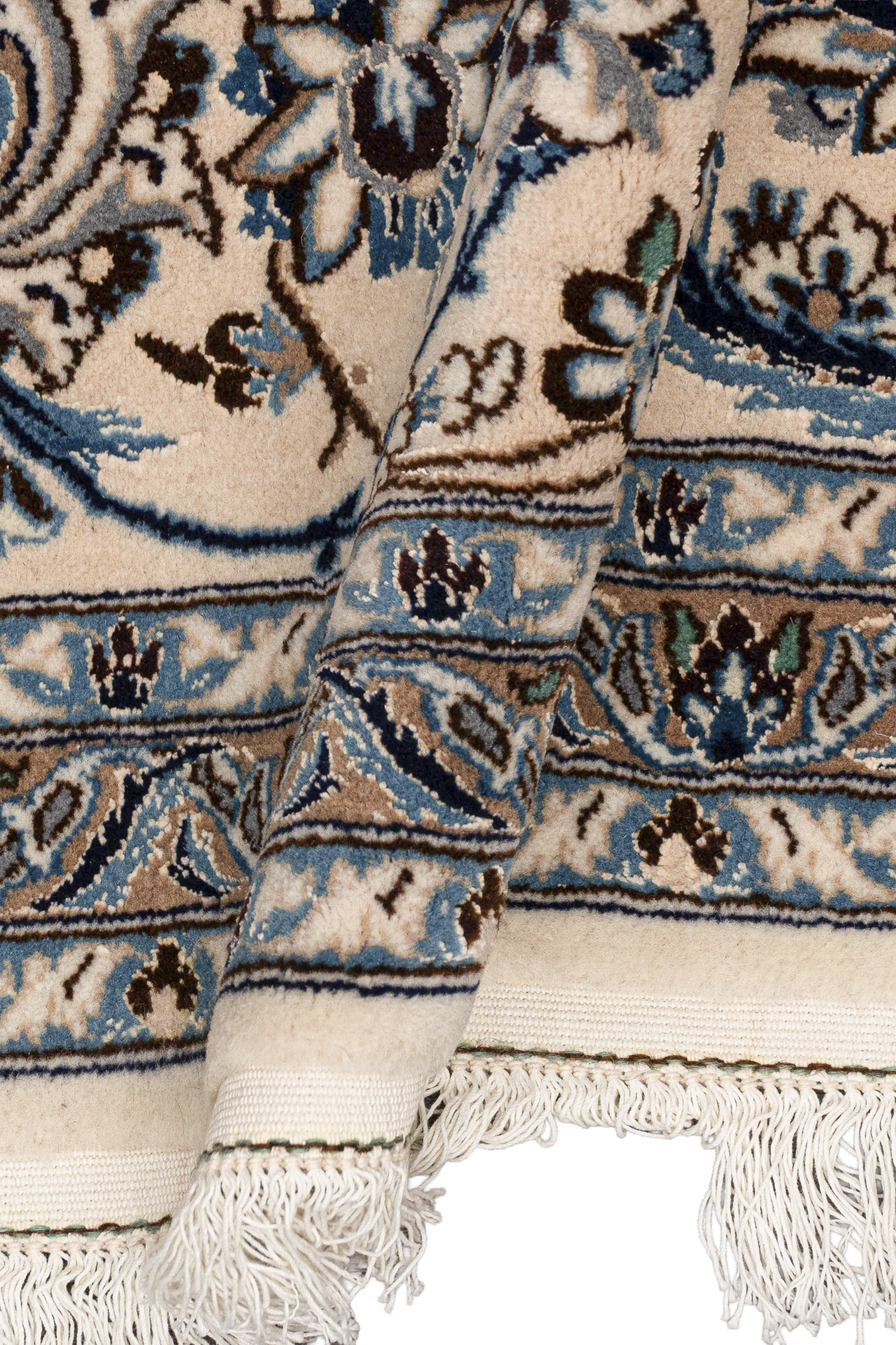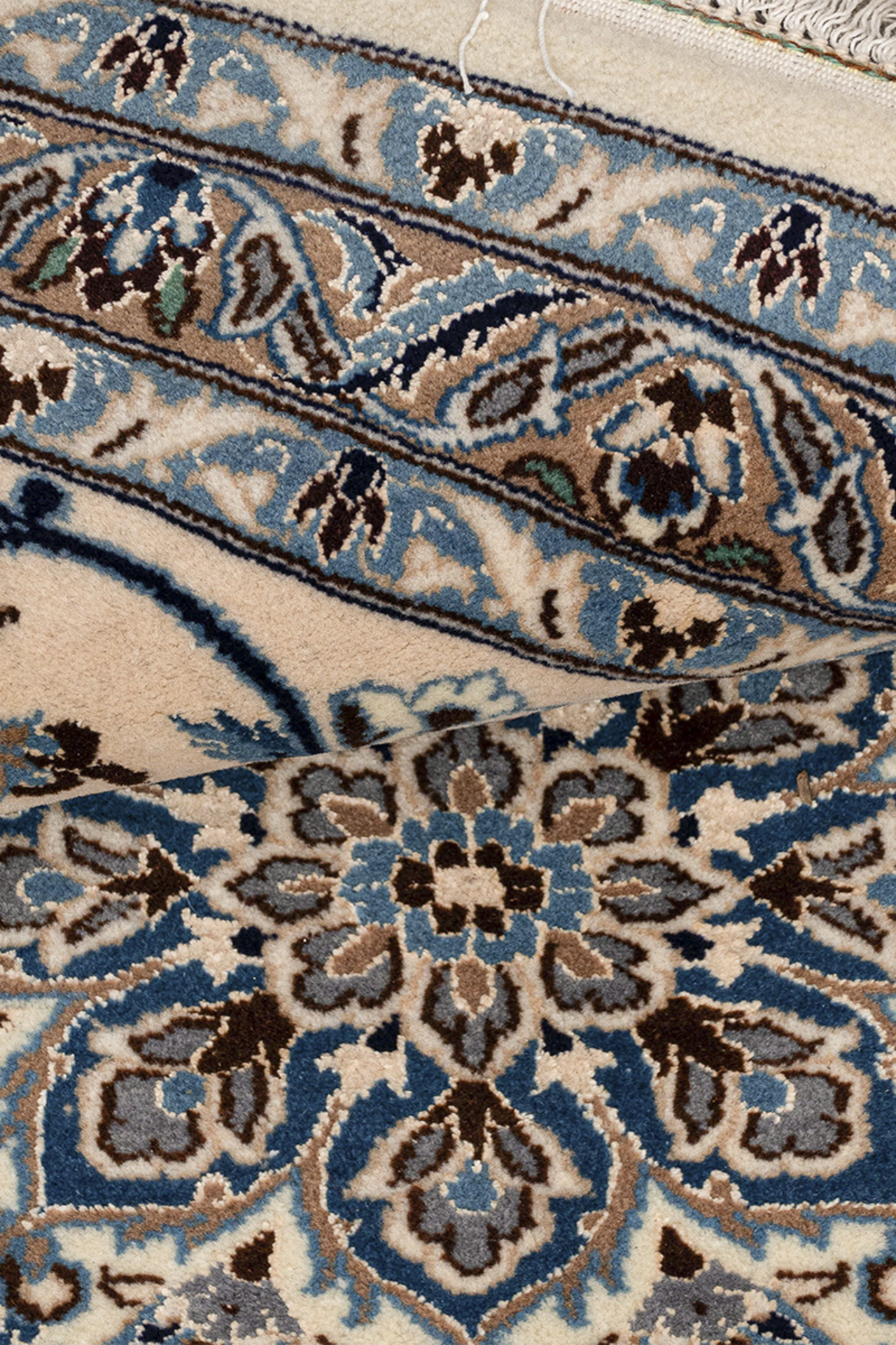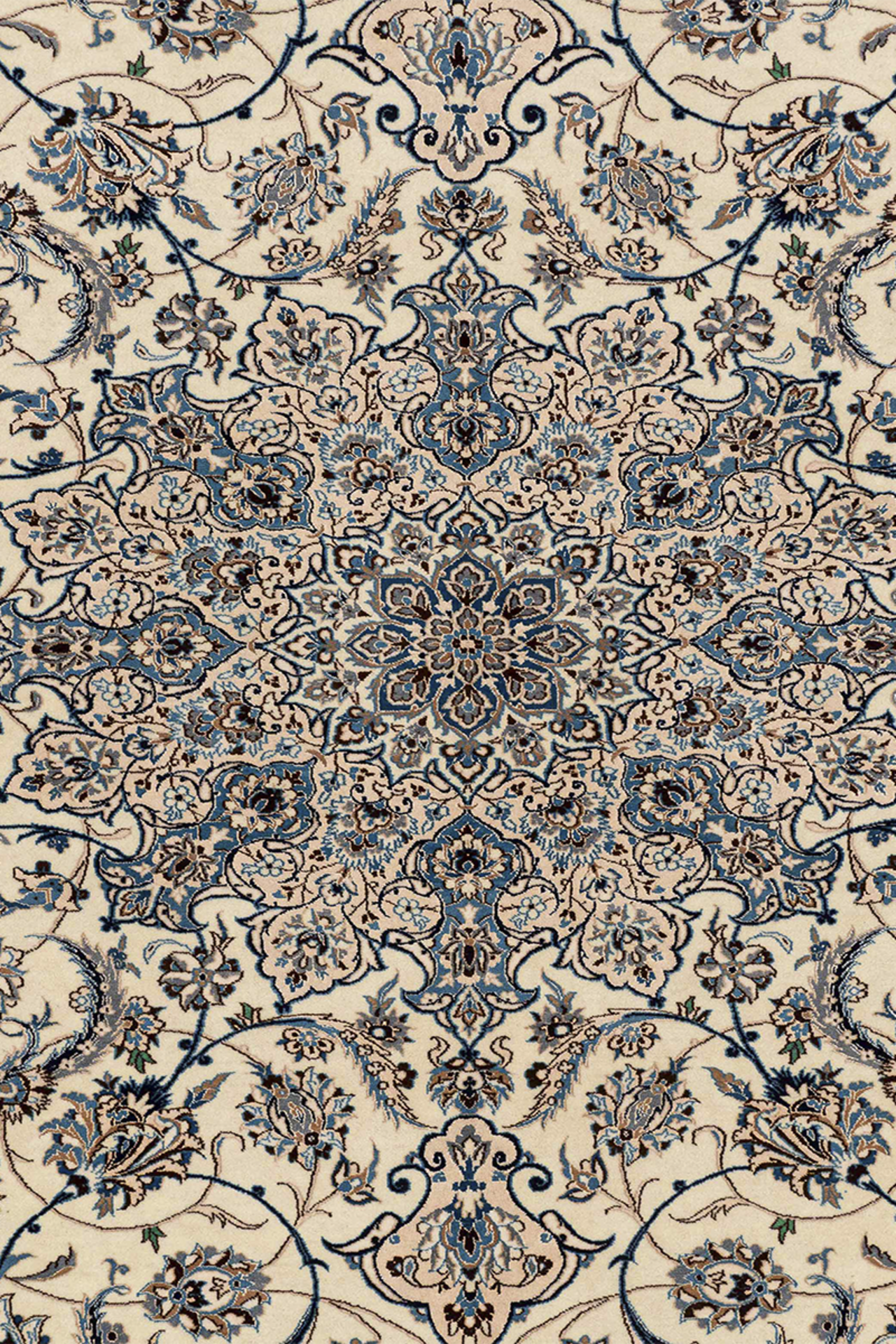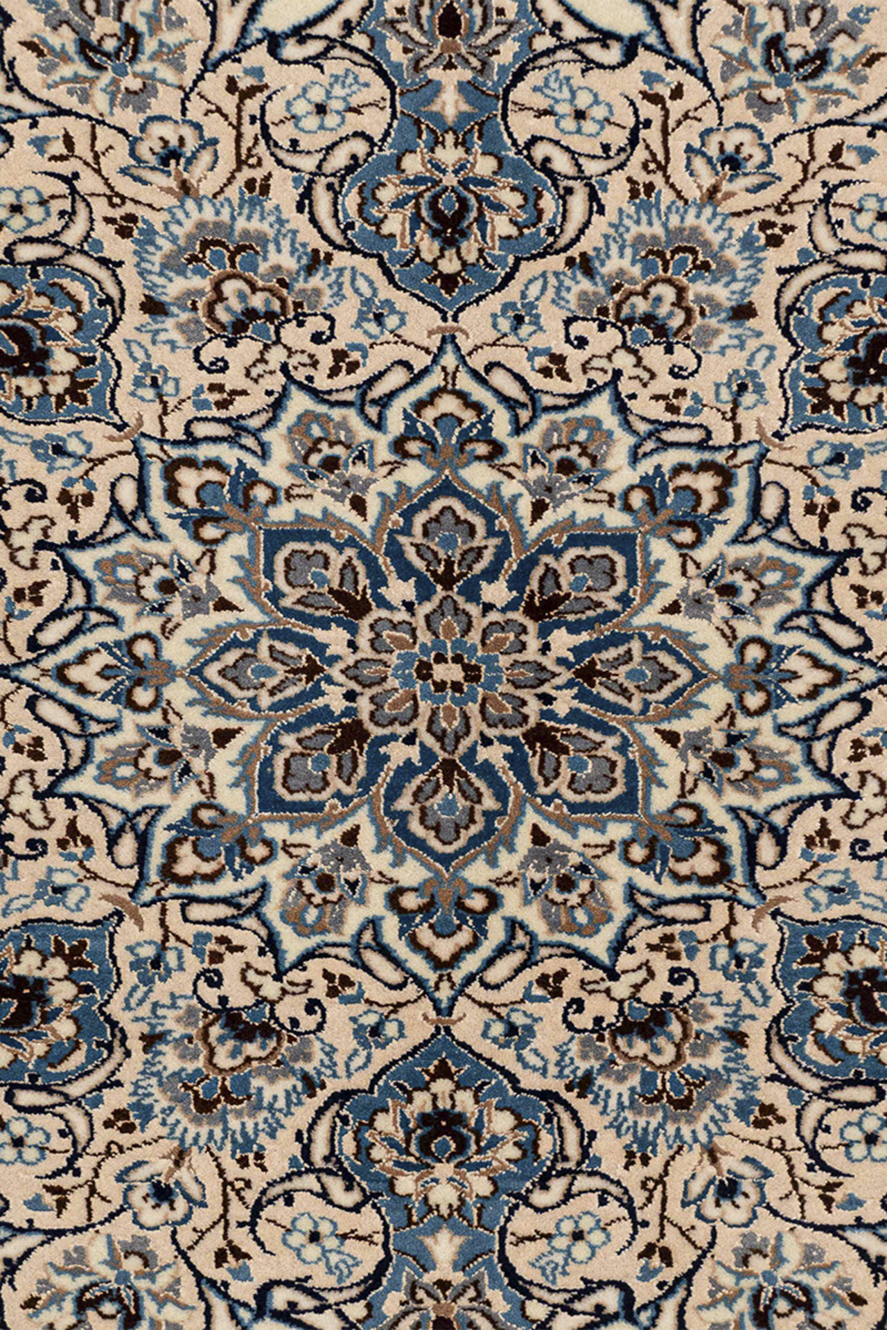 Dieser wunderschöne Orientteppich wurde in der Stadt Nain sehr fein von Hand geknüpft. Nain ist eine kleine Stadt, östlich von Isfahan und liegt direkt am Rand der Wüste Dascht-e Lut. Typisch für die Nain Teppiche ist die traditionelle Form des Medaillons. Alle Konturen des Musters wurden mit hochwertiger Naturseide fein geknüpft, der restliche Flor besteht aus hochwertiger Schurwolle. Farben wie blau, creme oder beige werden vorwiegend für diese Art von Orientteppich verwendet. Auch andere Farben können vorkommen, werden jedoch seltener eingesetzt. Nain Teppiche mit roten oder goldfarbenen Fond sind also seltene Einzelstücke. Heute werden diese Orientteppiche gerne für hochmoderne Interieur Konzepte genutzt und sind somit echte Statement Pieces.