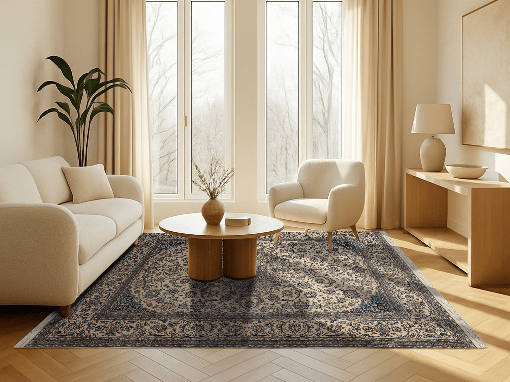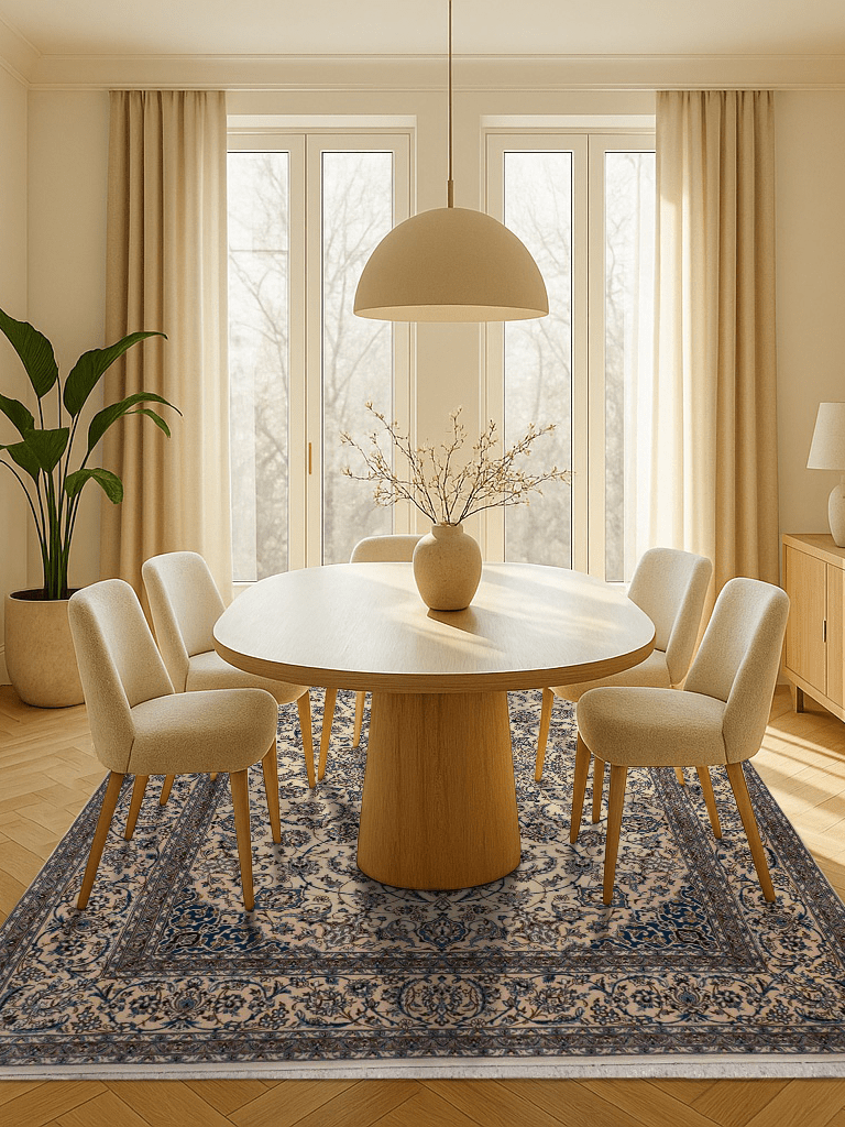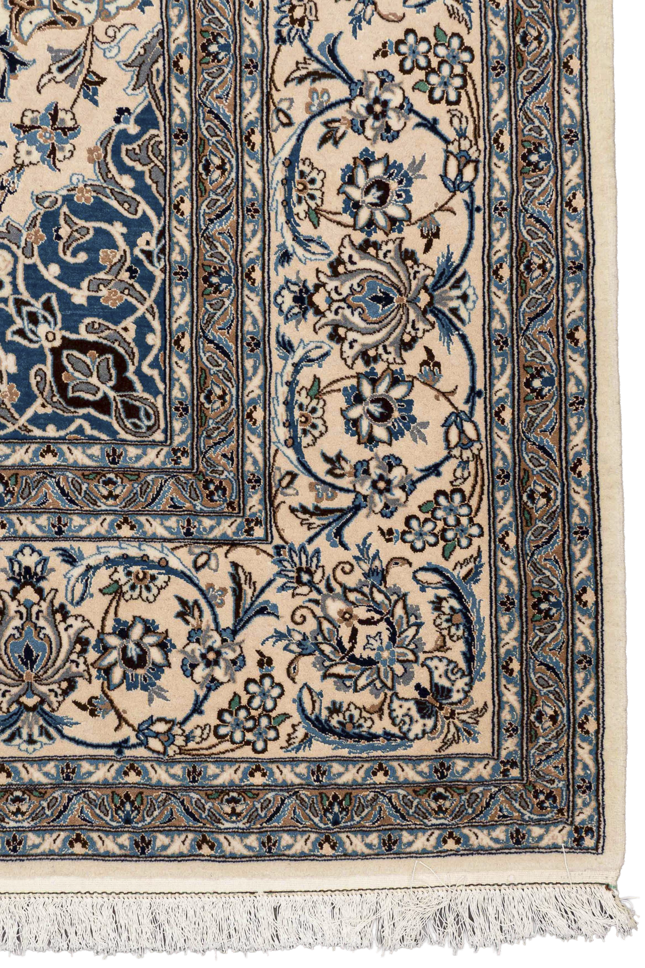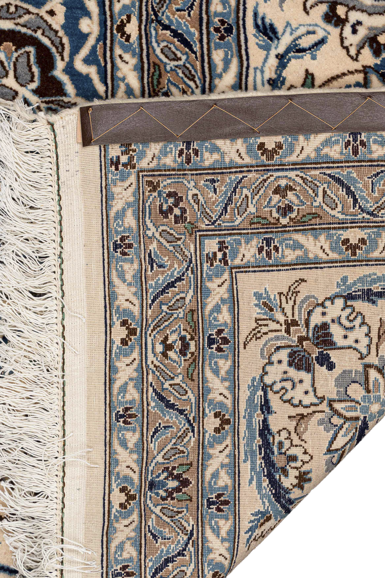 Dieser wunderschöne Orientteppich wurde in der Stadt Nain sehr fein von Hand geknüpft. Nain ist eine kleine Stadt, östlich von Isfahan und liegt direkt am Rand der Wüste Dascht-e Lut. Typisch für die Nain Teppiche ist die traditionelle Form des Medaillons. Alle Konturen des Musters wurden mit hochwertiger Naturseide fein geknüpft, der restliche Flor besteht aus hochwertiger Schurwolle. Farben wie blau, creme oder beige werden vorwiegend für diese Art von Orientteppich verwendet. Auch andere Farben können vorkommen, werden jedoch seltener eingesetzt. Nain Teppiche mit roten oder goldfarbenen Fond sind also seltene Einzelstücke. Heute werden diese Orientteppiche gerne für hochmoderne Interieur Konzepte genutzt und sind somit echte Statement Pieces.