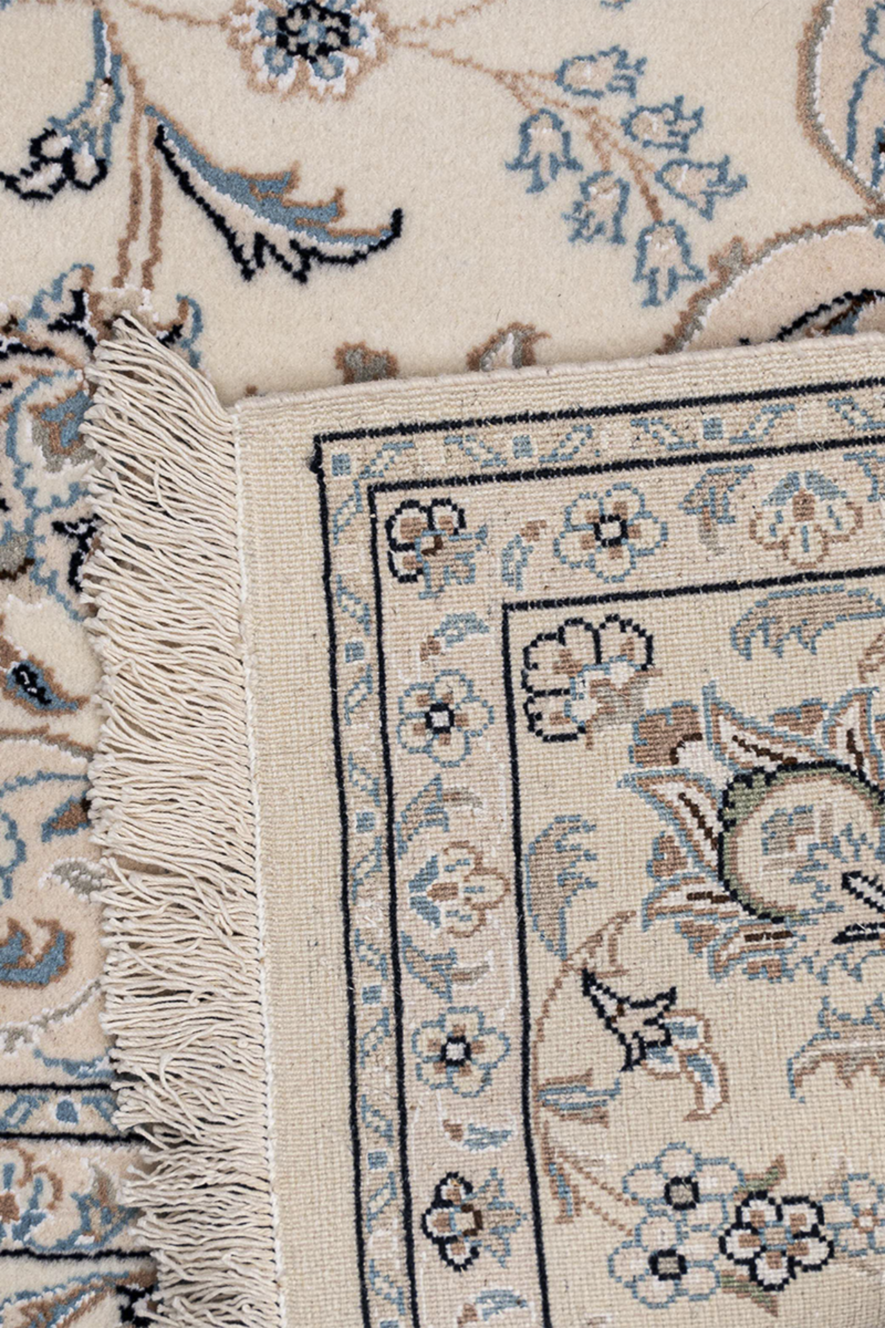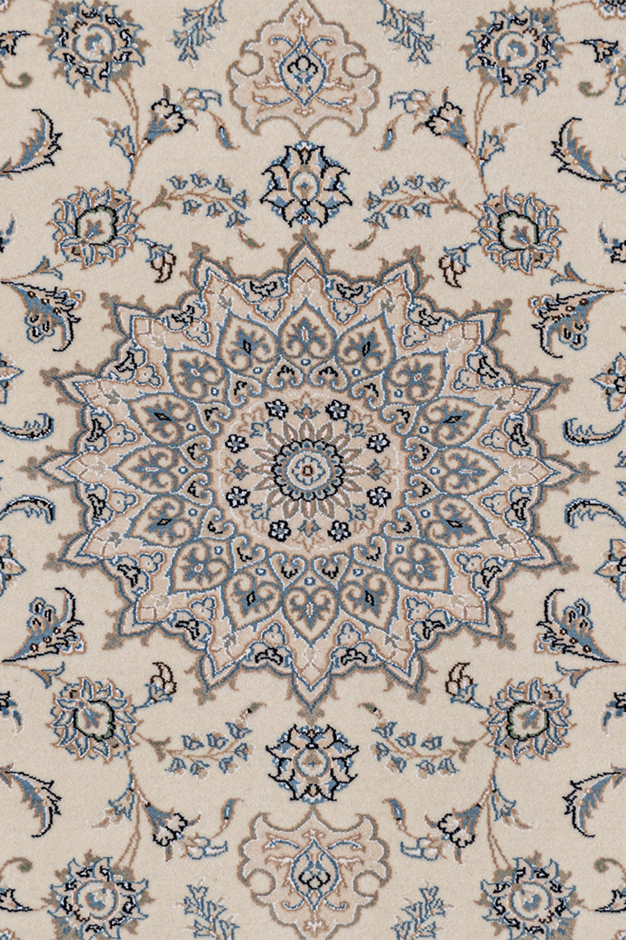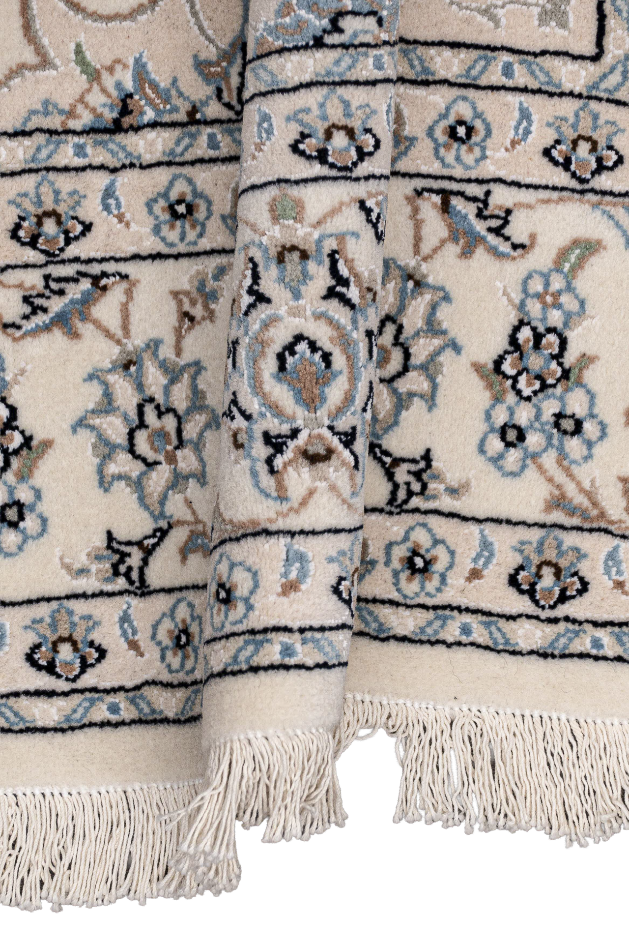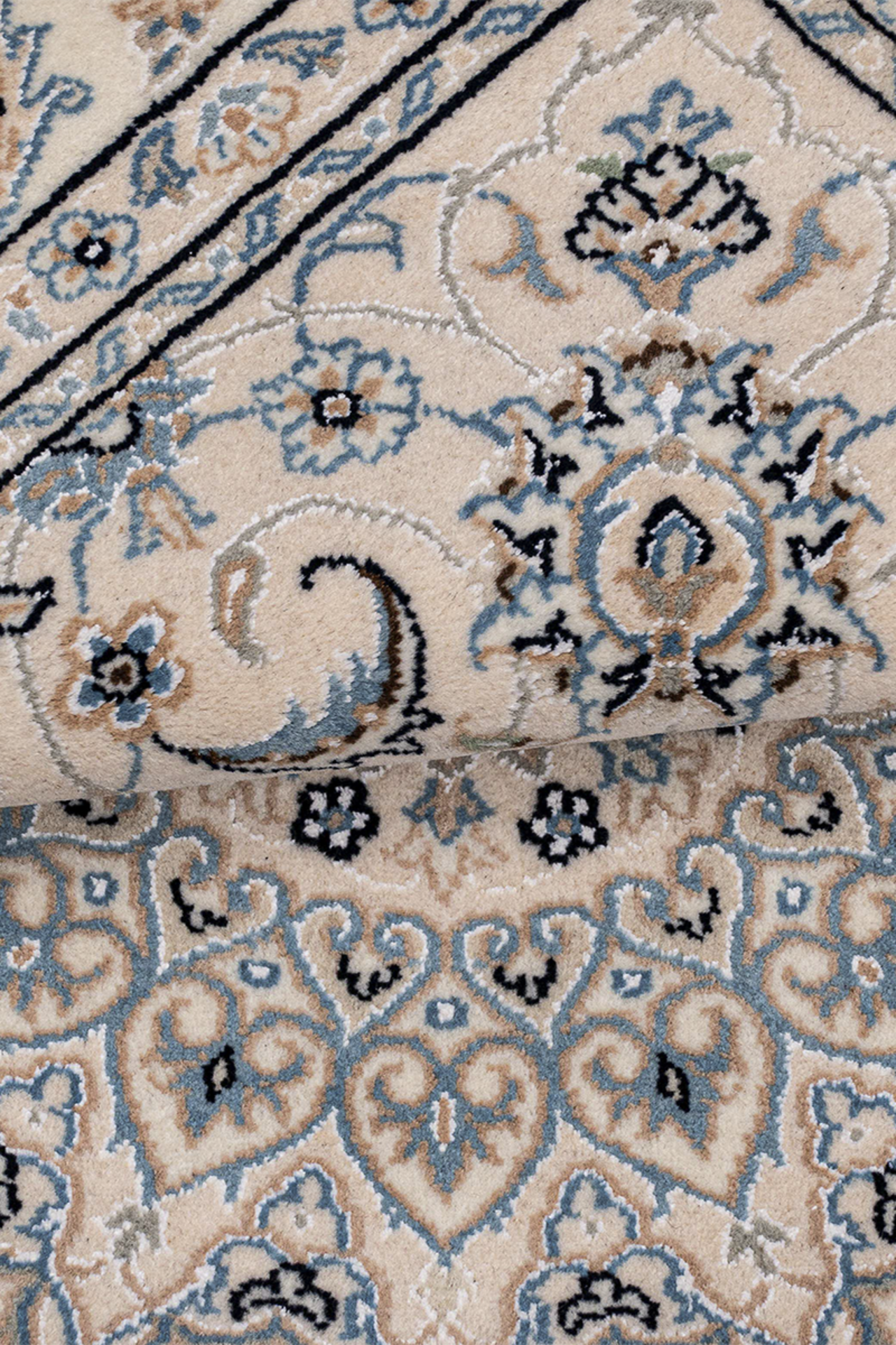 Dieser wunderschöne Orientteppich wurde in der Stadt Nain sehr fein von Hand geknüpft. Nain ist eine kleine Stadt, östlich von Isfahan und liegt direkt am Rand der Wüste Dascht-e Lut. Typisch für die Nain Teppiche ist die traditionelle Form des Medaillons. Alle Konturen des Musters wurden mit hochwertiger Naturseide fein geknüpft, der restliche Flor besteht aus bester Schurwolle. Farben wie blau, creme oder beige werden vorwiegend für diese Art von Orientteppich verwendet. Auch andere Farben können vorkommen, werden jedoch seltener eingesetzt. Nain Teppiche mit roten oder goldfarbenen Fond sind also seltene Einzelstücke. Heute werden diese Orientteppiche gerne für hochmoderne Interieur Konzepte genutzt und sind somit echte Statement Pieces.