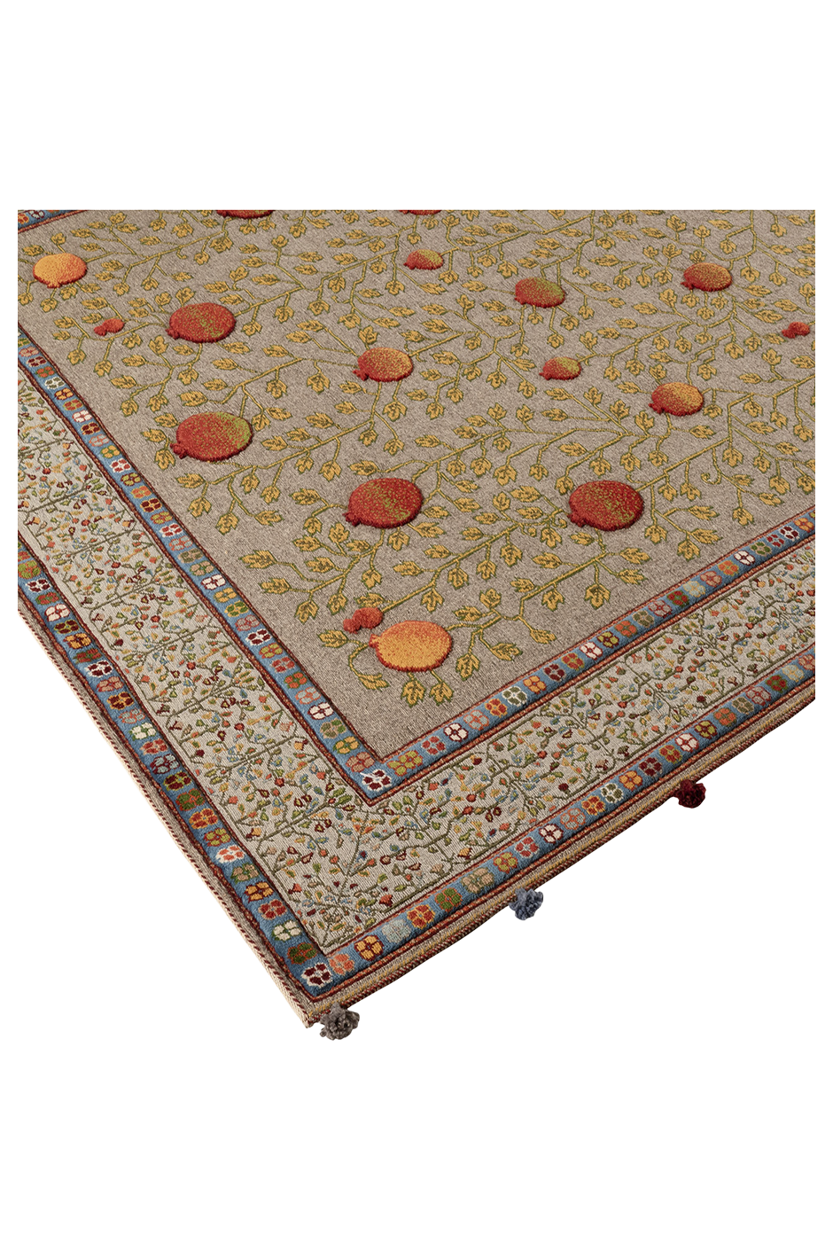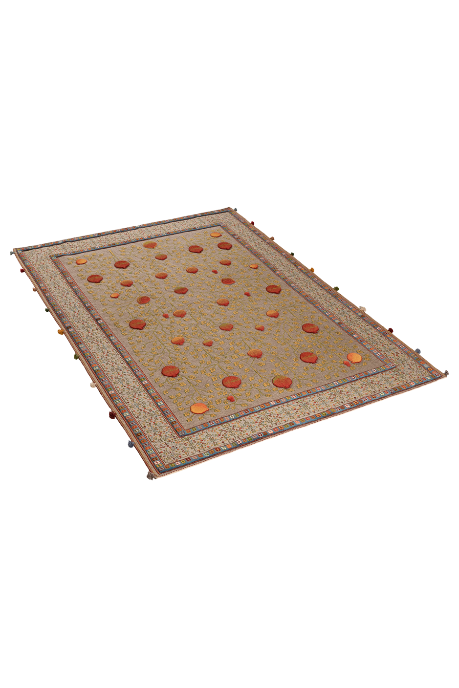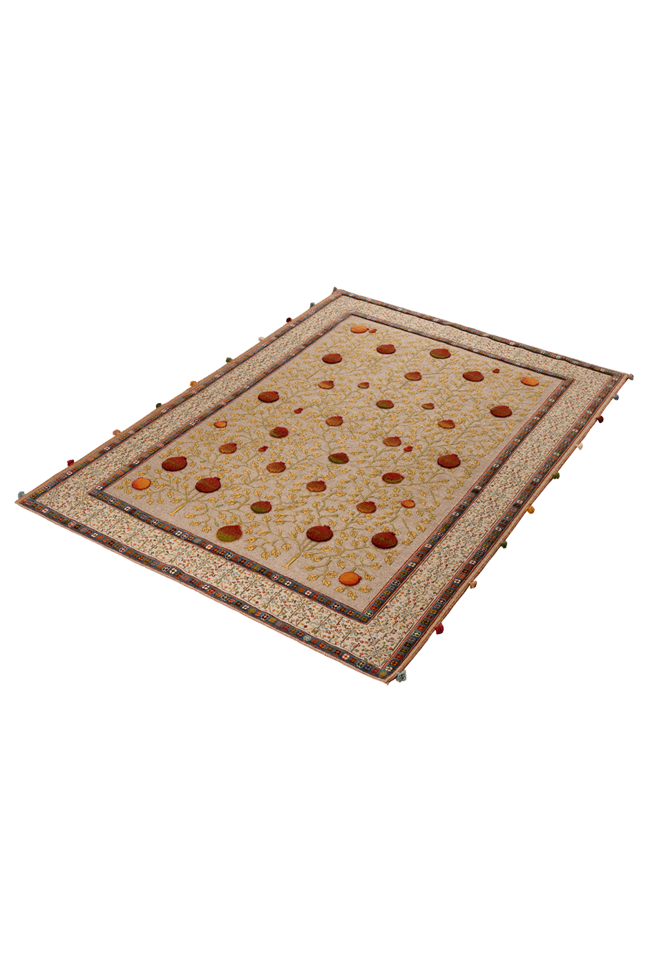 Dieser außergewöhnliche Teppich wurde in reiner Soumakh-Technik gefertigt – einer kunstvollen Flachwebtechnik, die an feine Stickerei erinnert. Das detailreiche Granatapfelmotiv – Symbol für Fülle, Leben und Schönheit – leuchtet in warmen Rot-, Gold- und Olivtönen auf einem elegant gewebten Fond. Der Teppich besteht aus reiner Schurwolle und wurde ausschließlich mit pflanzlichen Naturfarben gefärbt. Durch das kunstvolle Umschlingen der Kettfäden entsteht ein leicht erhabenes Relief, das dem Teppich eine textile Tiefe verleiht. „Granatapfel“ ist ein handgewebtes Unikat – authentisch, ausdrucksstark und von zeitloser Eleganz.