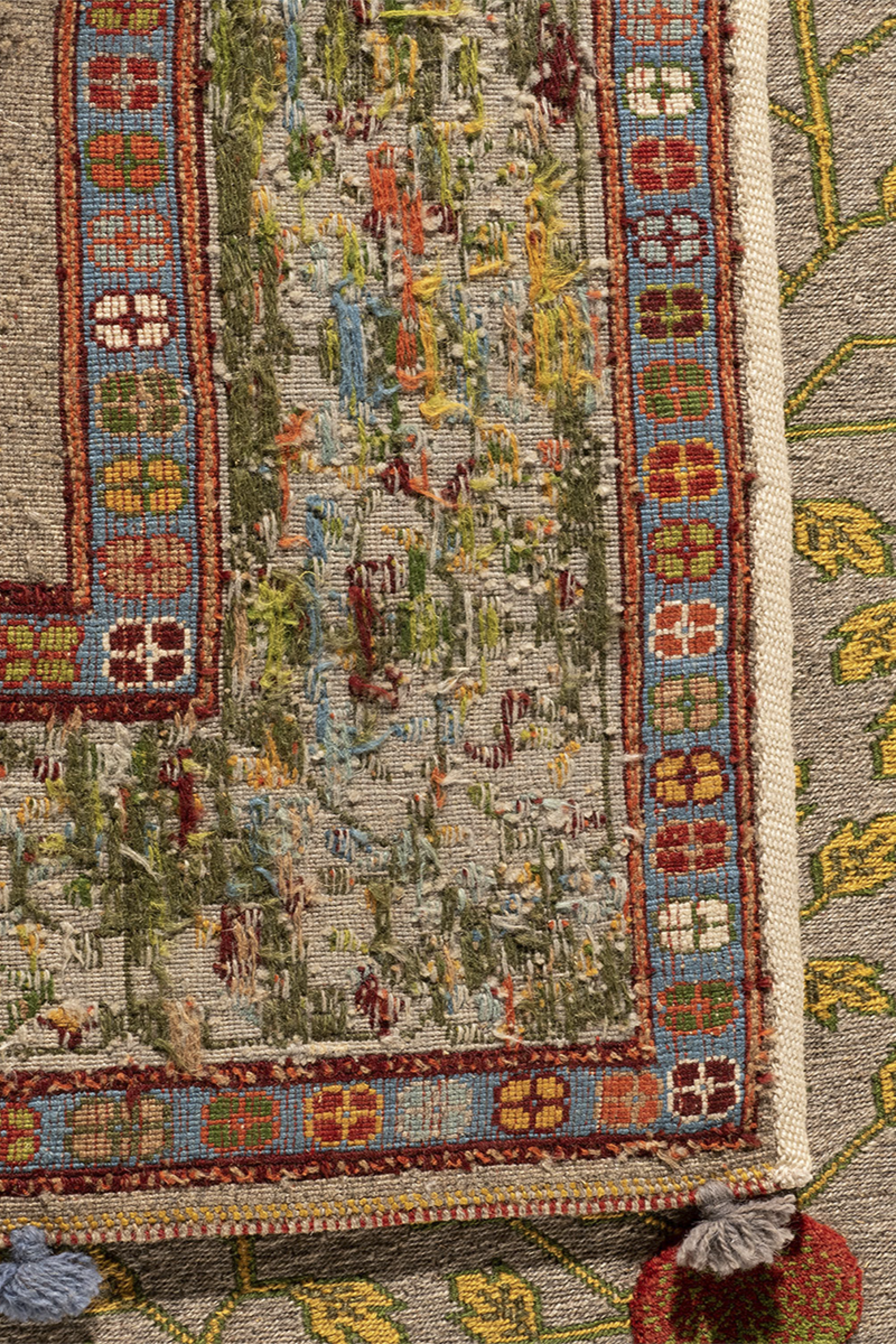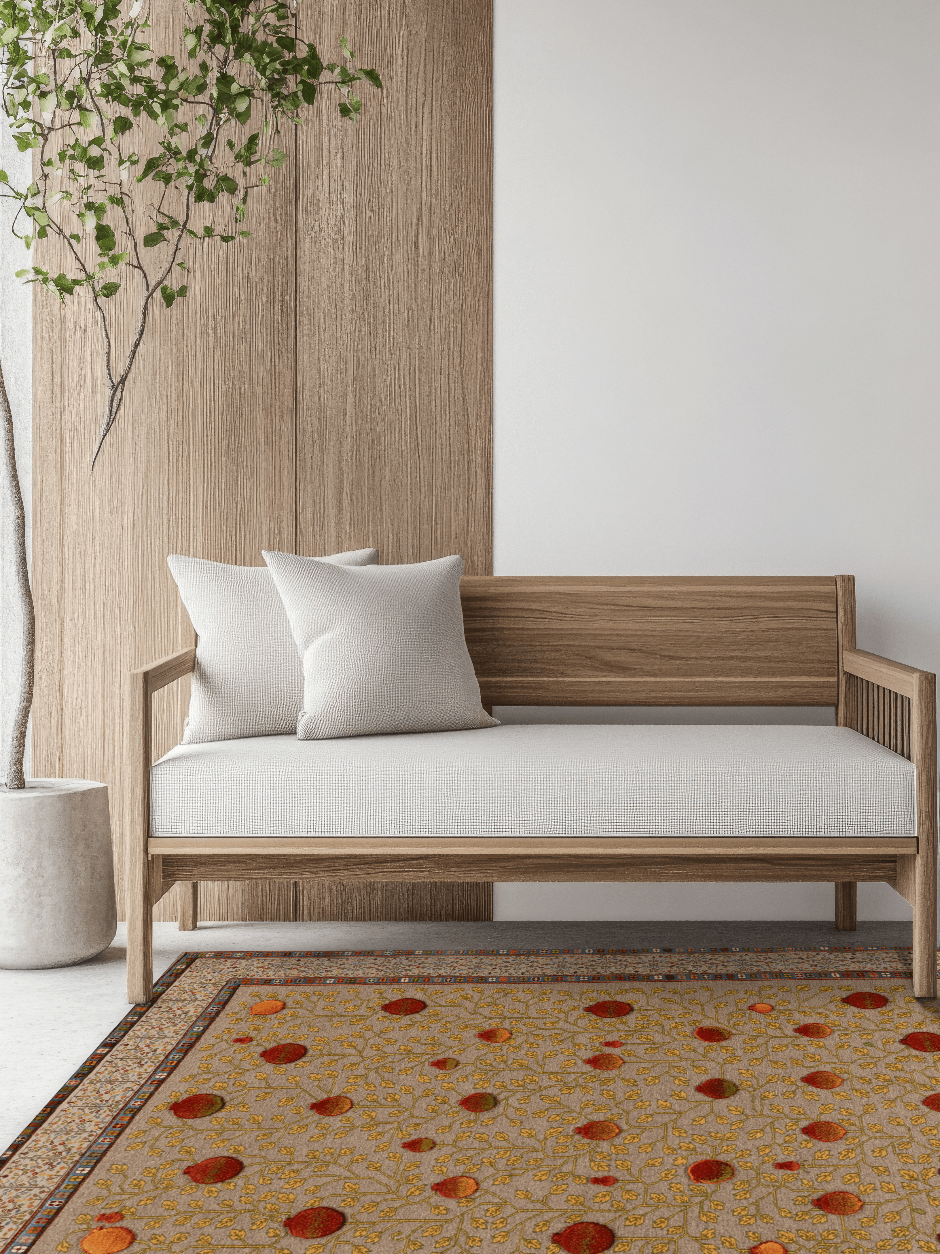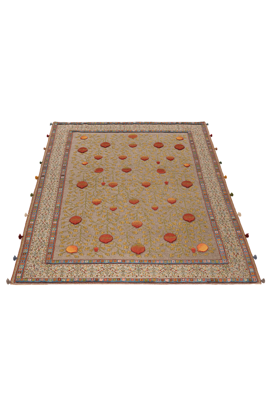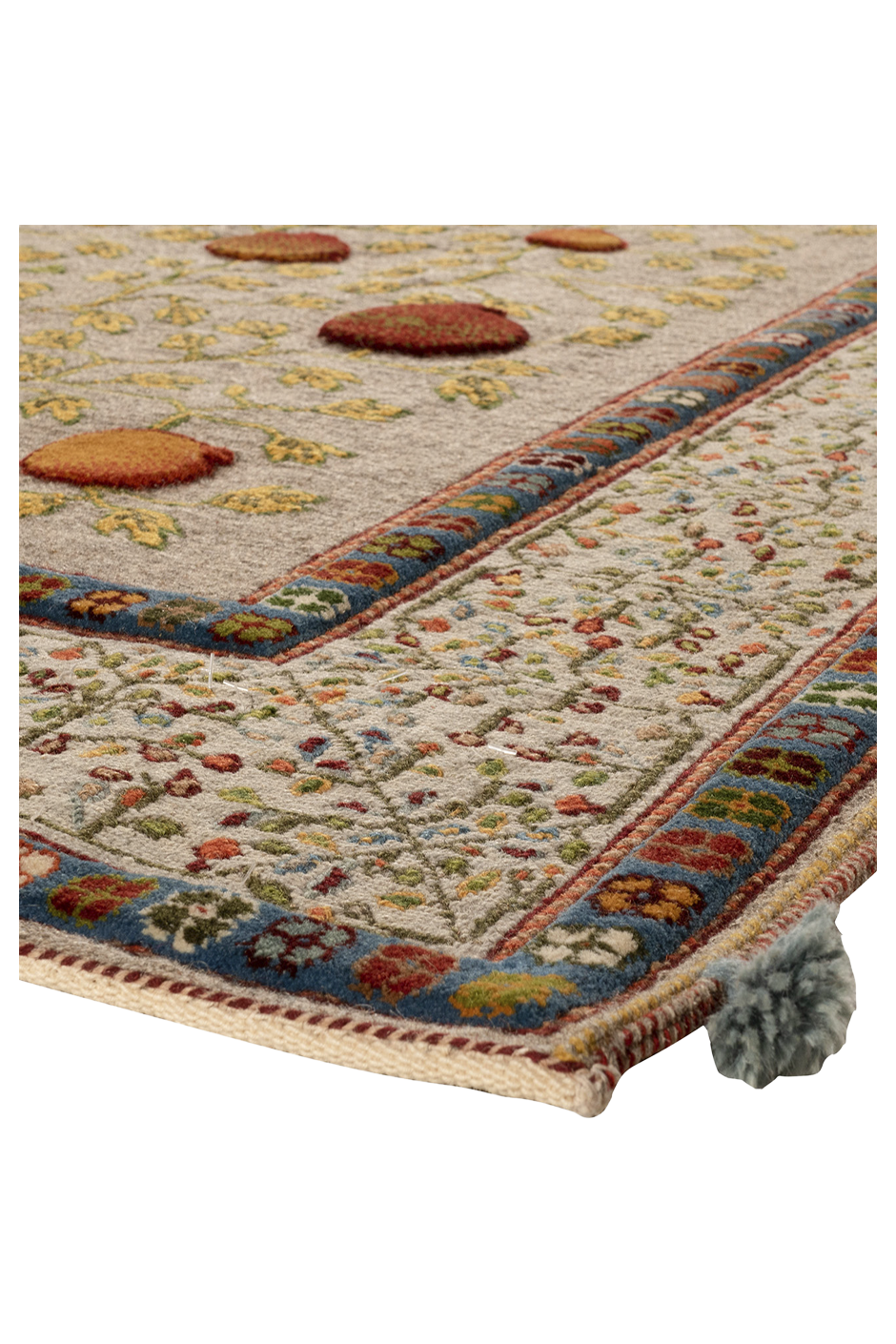 Dieser außergewöhnliche Teppich wurde in reiner Soumakh-Technik gefertigt – einer kunstvollen Flachwebtechnik, die an feine Stickerei erinnert. Das detailreiche Granatapfelmotiv – Symbol für Fülle, Leben und Schönheit – leuchtet in warmen Rot-, Gold- und Olivtönen auf einem elegant gewebten Fond. Der Teppich besteht aus reiner Schurwolle und wurde ausschließlich mit pflanzlichen Naturfarben gefärbt. Durch das kunstvolle Umschlingen der Kettfäden entsteht ein leicht erhabenes Relief, das dem Teppich eine textile Tiefe verleiht. „Granatapfel“ ist ein handgewebtes Unikat – authentisch, ausdrucksstark und von zeitloser Eleganz.