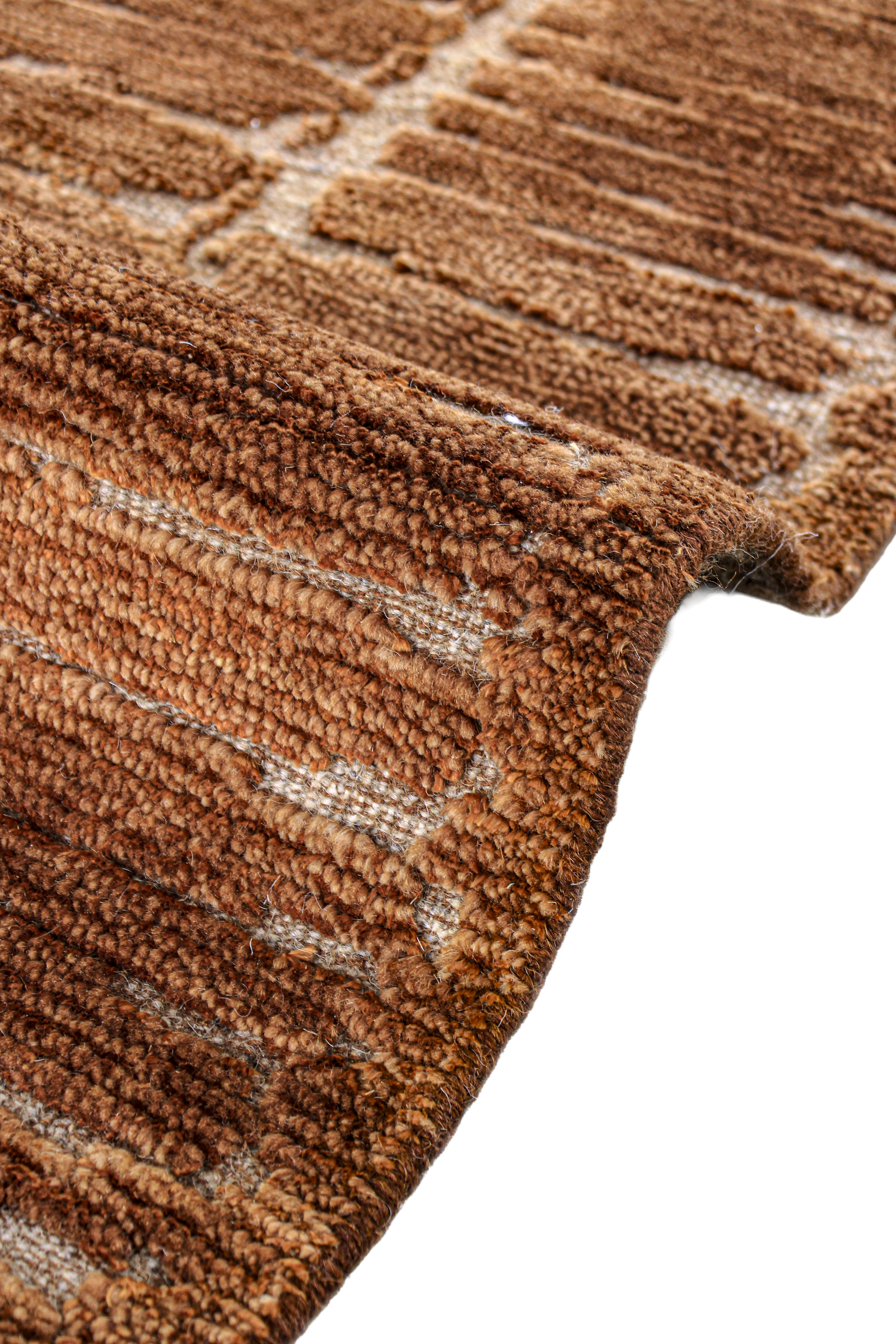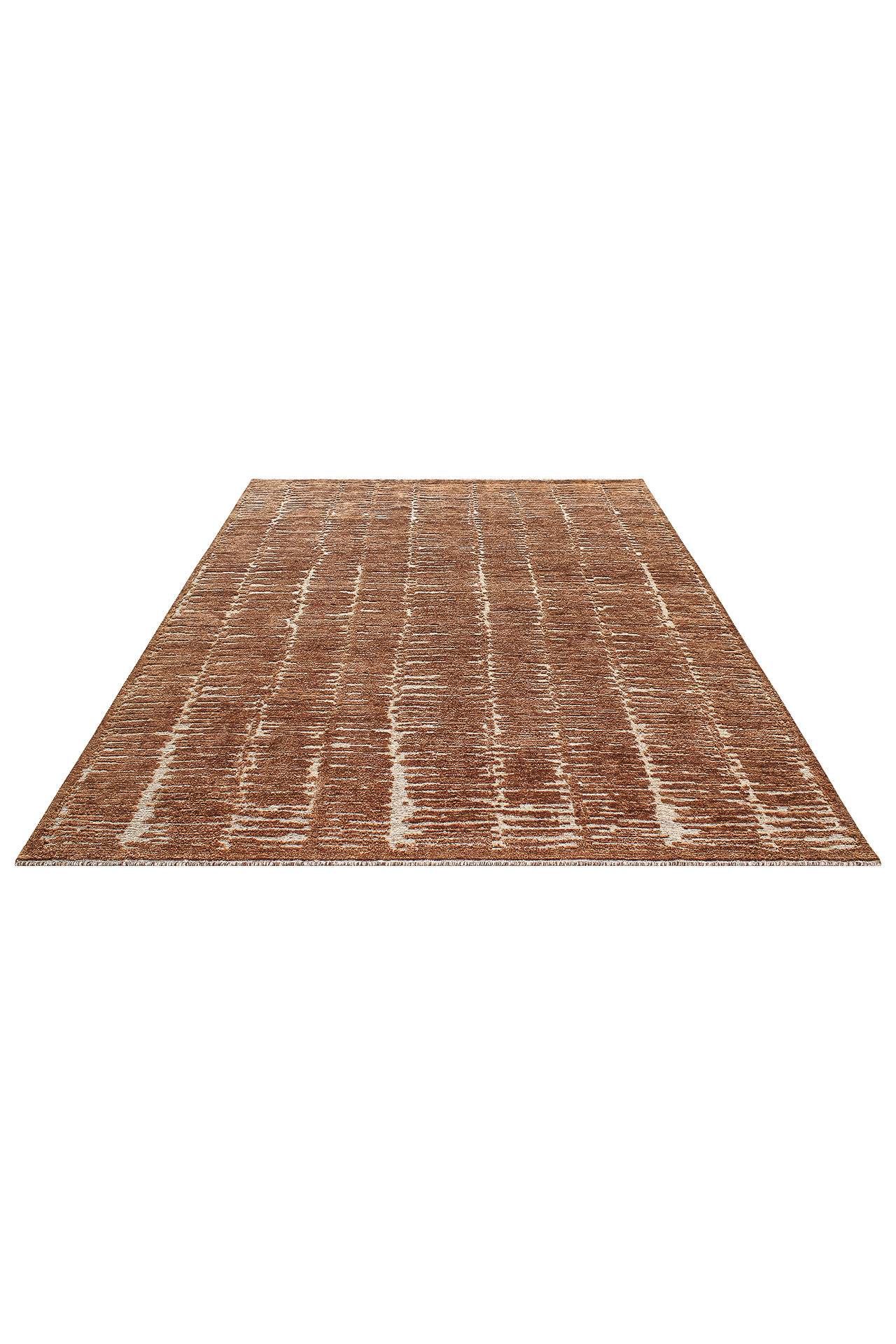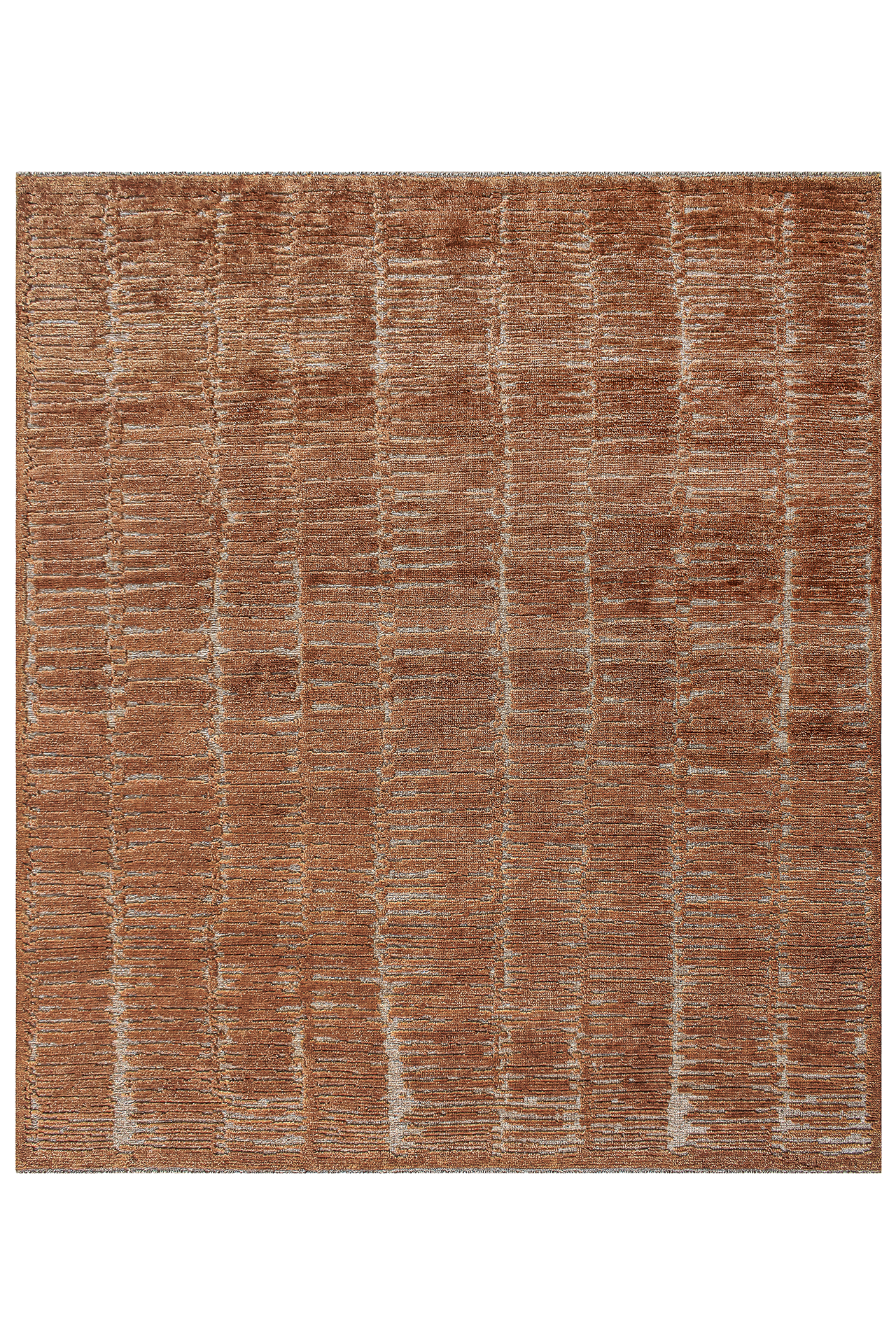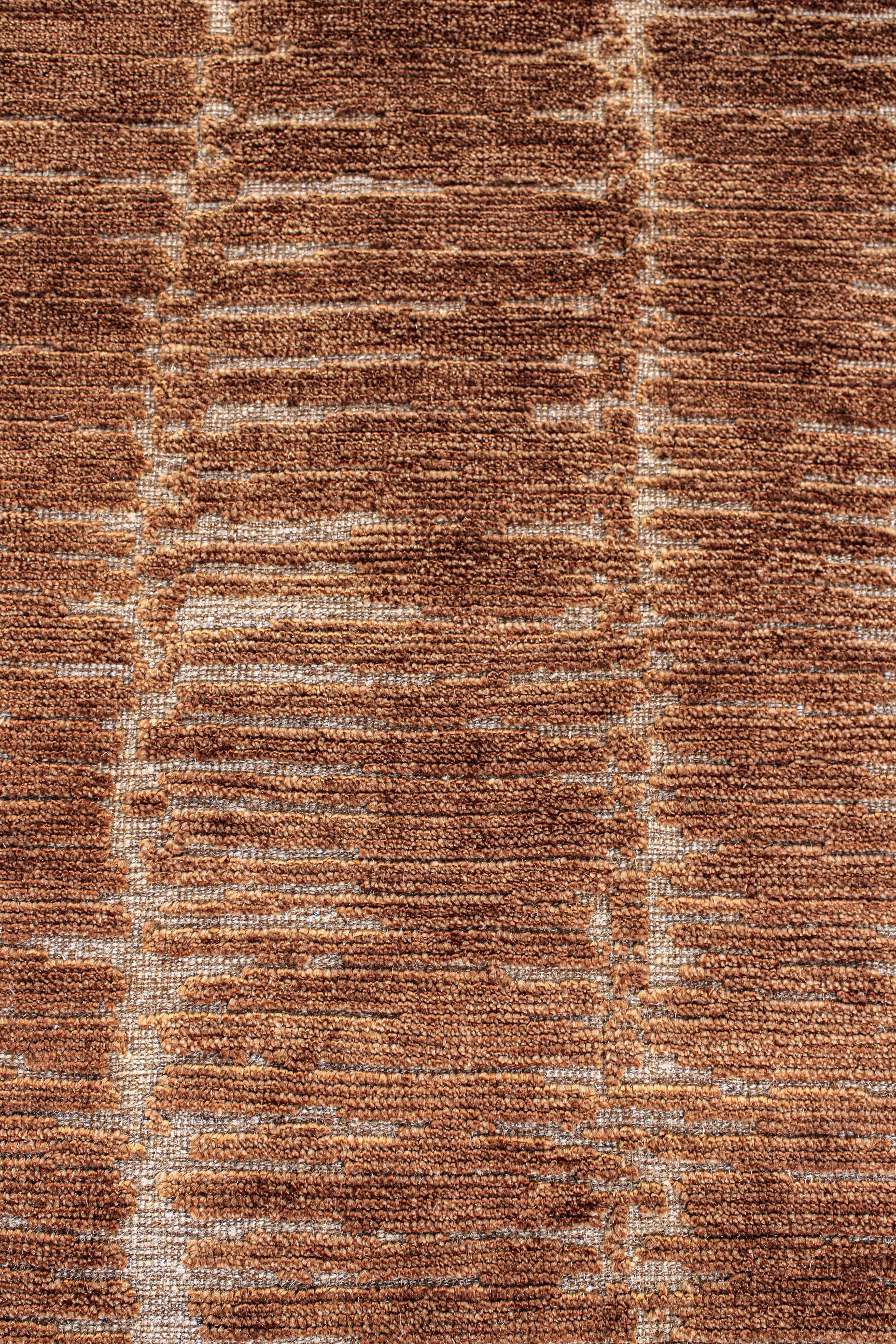 Copper Dunes ist ein handgeknüpfter Teppich aus der Jordan Collection, gefertigt aus Schurwolle und schimmernder Naturseide. Die warme Farbgebung aus Braun und Kupfer entfaltet eine luxuriöse Ausstrahlung. Das kupferfarbene Seidengarn liegt höher im Flor und betont das Muster, das an vom Wind geformte Wüstensanddünen erinnert. Die Hoch-Tief-Struktur verleiht der Oberfläche Tiefe und macht den Teppich zu einem modernen Statement-Piece.