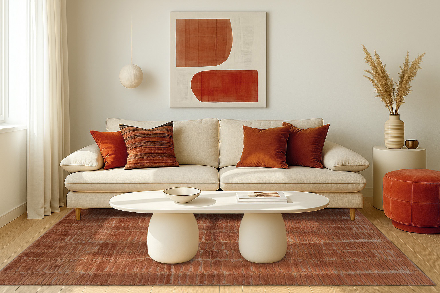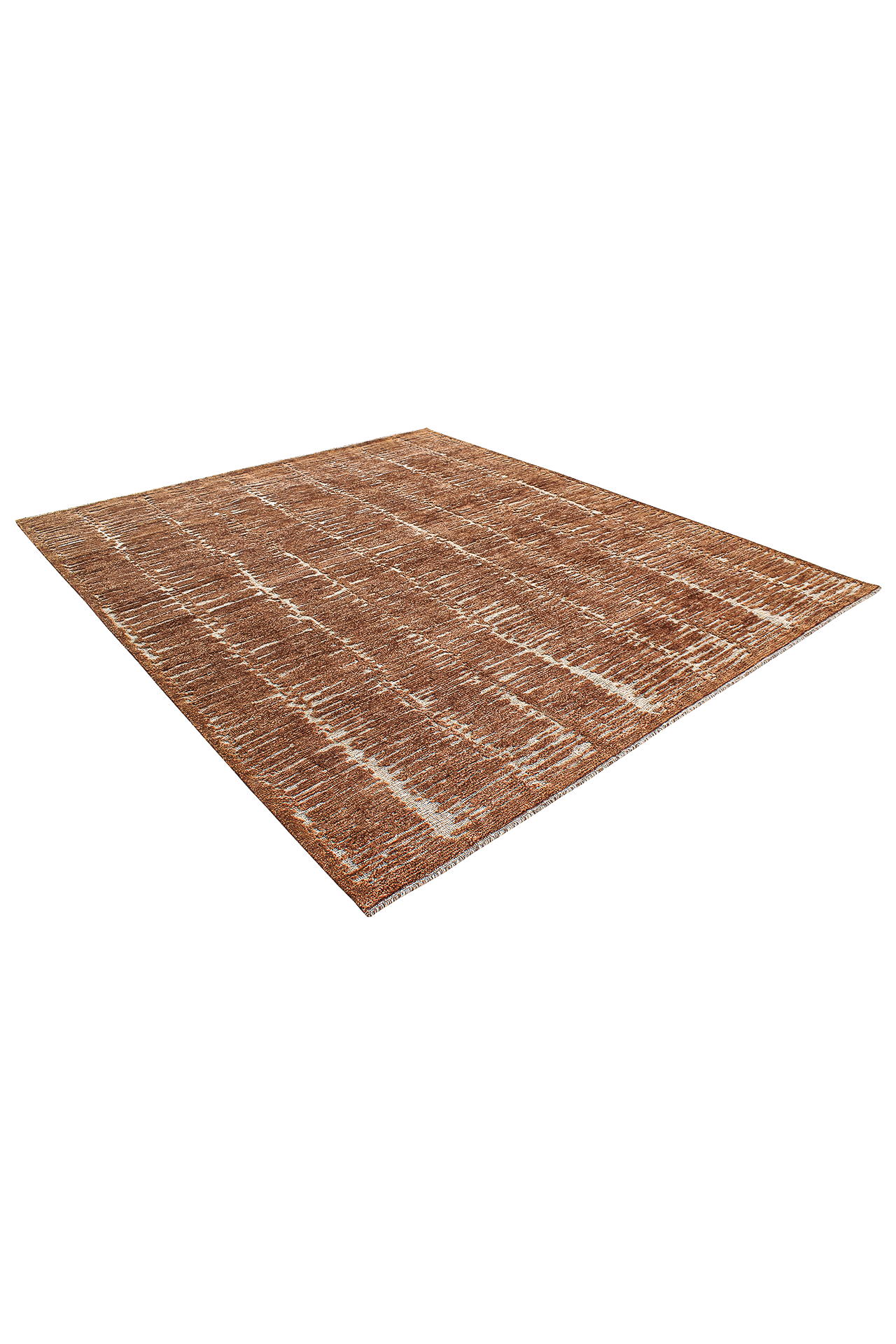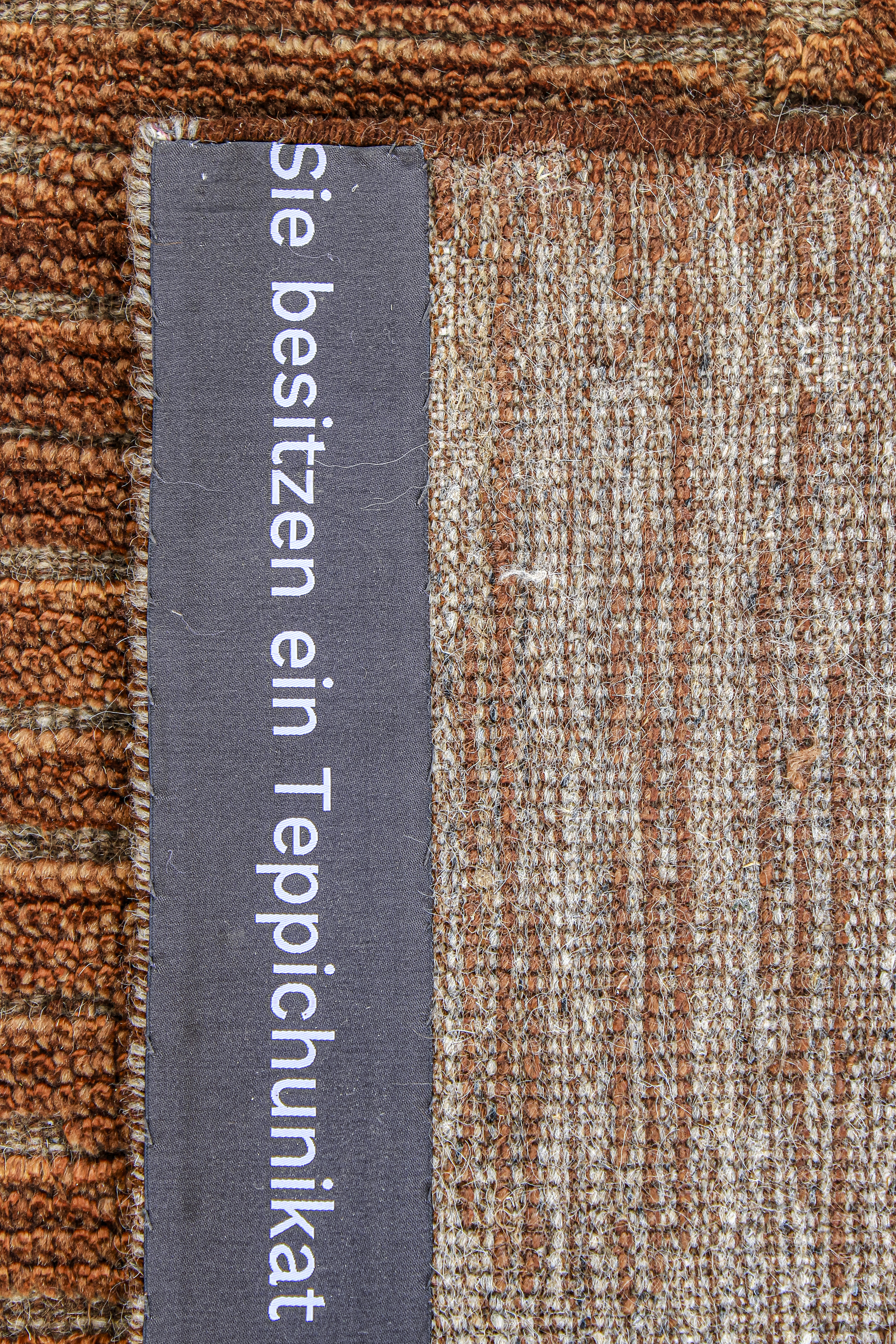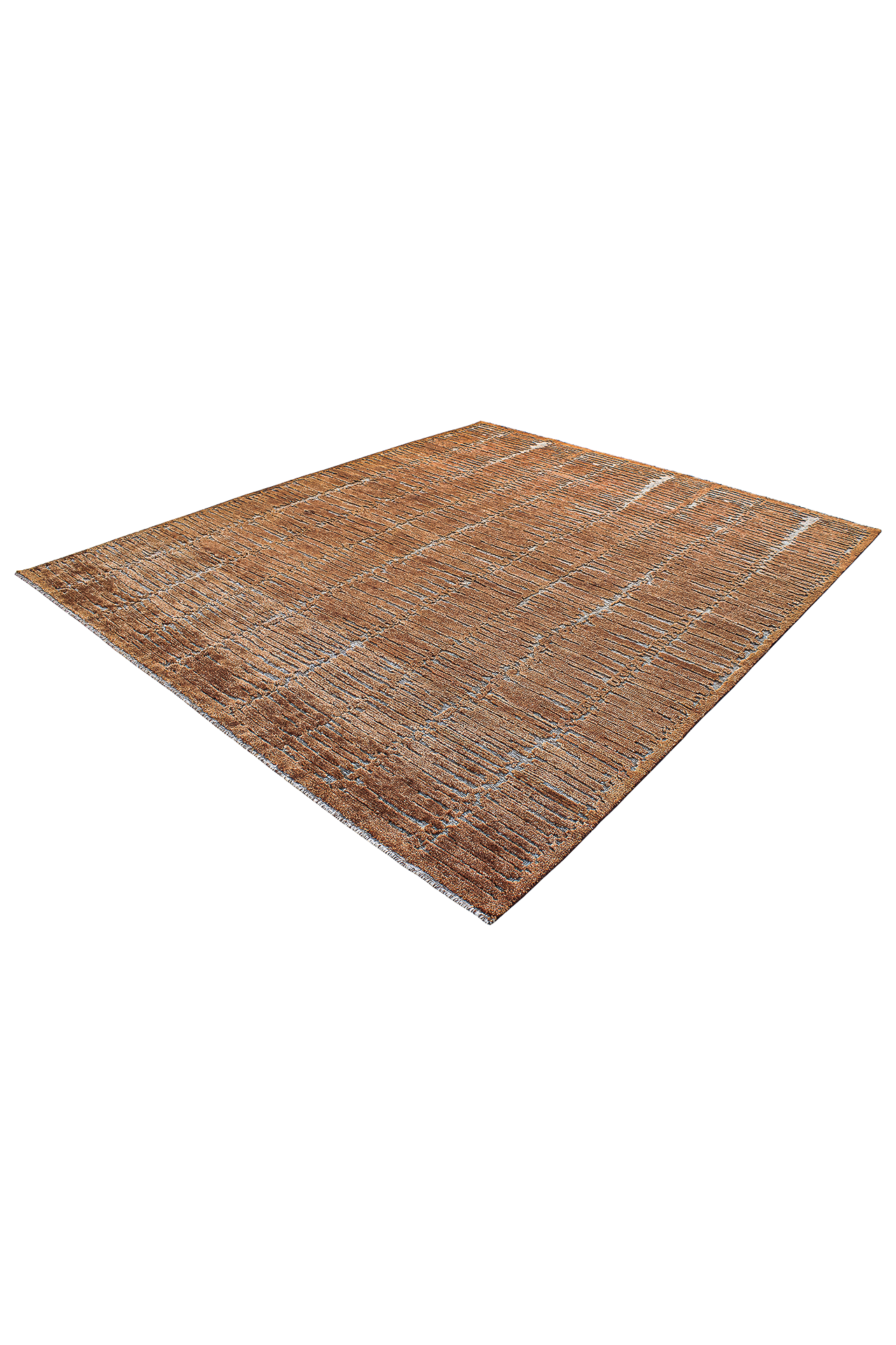 Copper Dunes ist ein handgeknüpfter Teppich aus der Jordan Collection, gefertigt aus Schurwolle und schimmernder Naturseide. Die warme Farbgebung aus Braun und Kupfer entfaltet eine luxuriöse Ausstrahlung. Das kupferfarbene Seidengarn liegt höher im Flor und betont das Muster, das an vom Wind geformte Wüstensanddünen erinnert. Die Hoch-Tief-Struktur verleiht der Oberfläche Tiefe und macht den Teppich zu einem modernen Statement-Piece.